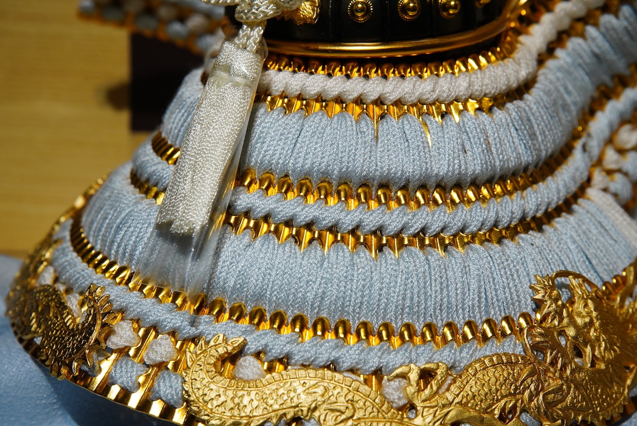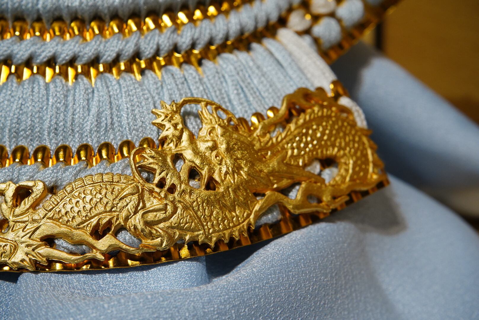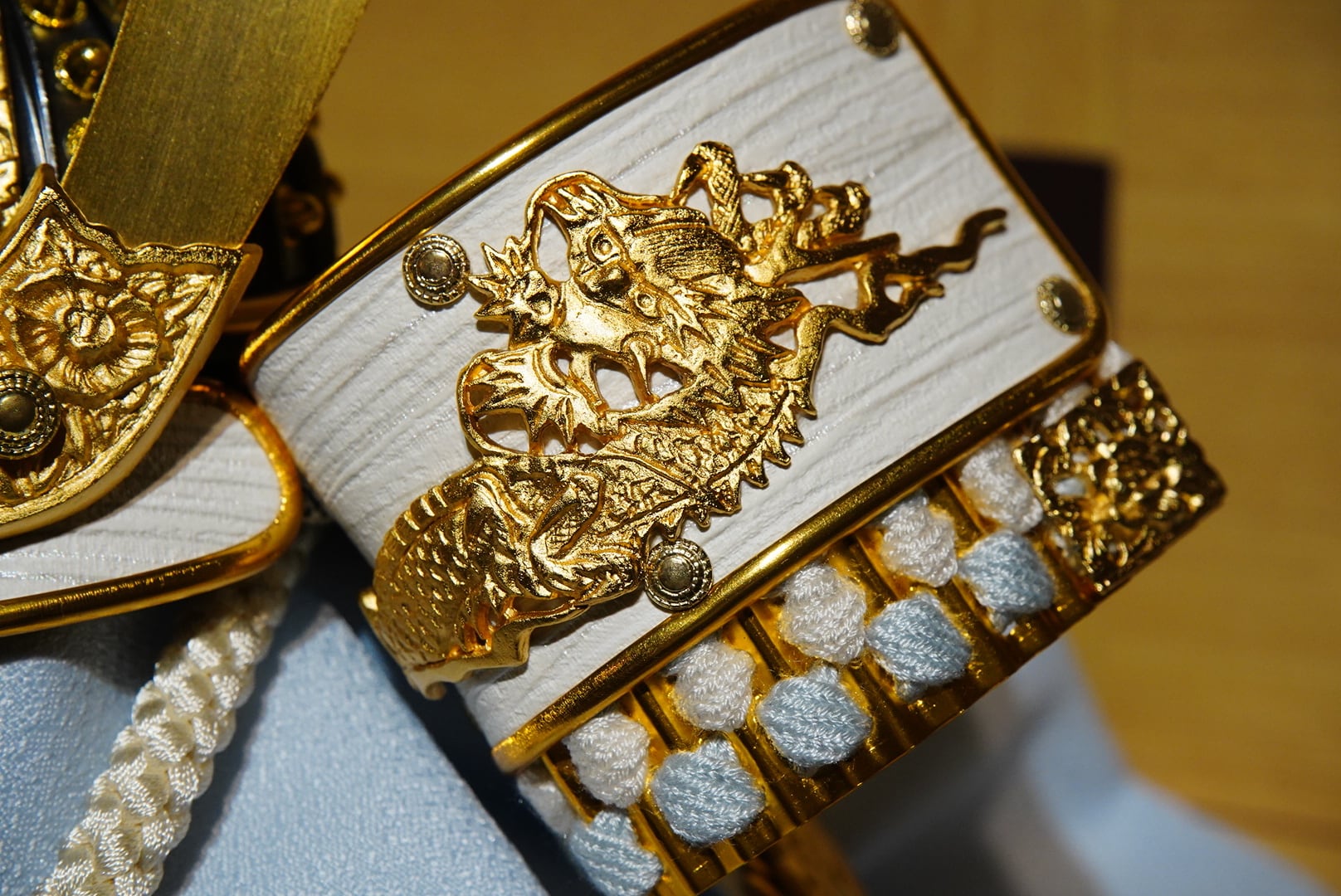 吹返しにも重厚な龍の金具細工を施し、白糸の威しと淡い水色の袱紗が清らかで上品な印象を演出。