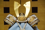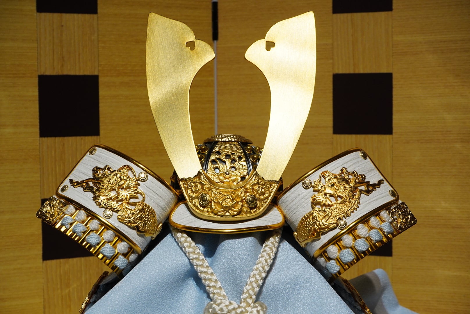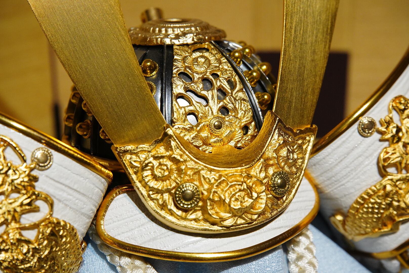 のびやかに立ち上がる金色の鍬形は、すっきりとした美しい曲線を描き、中央の精緻な彫金金具が格調の高さを際立たせます。