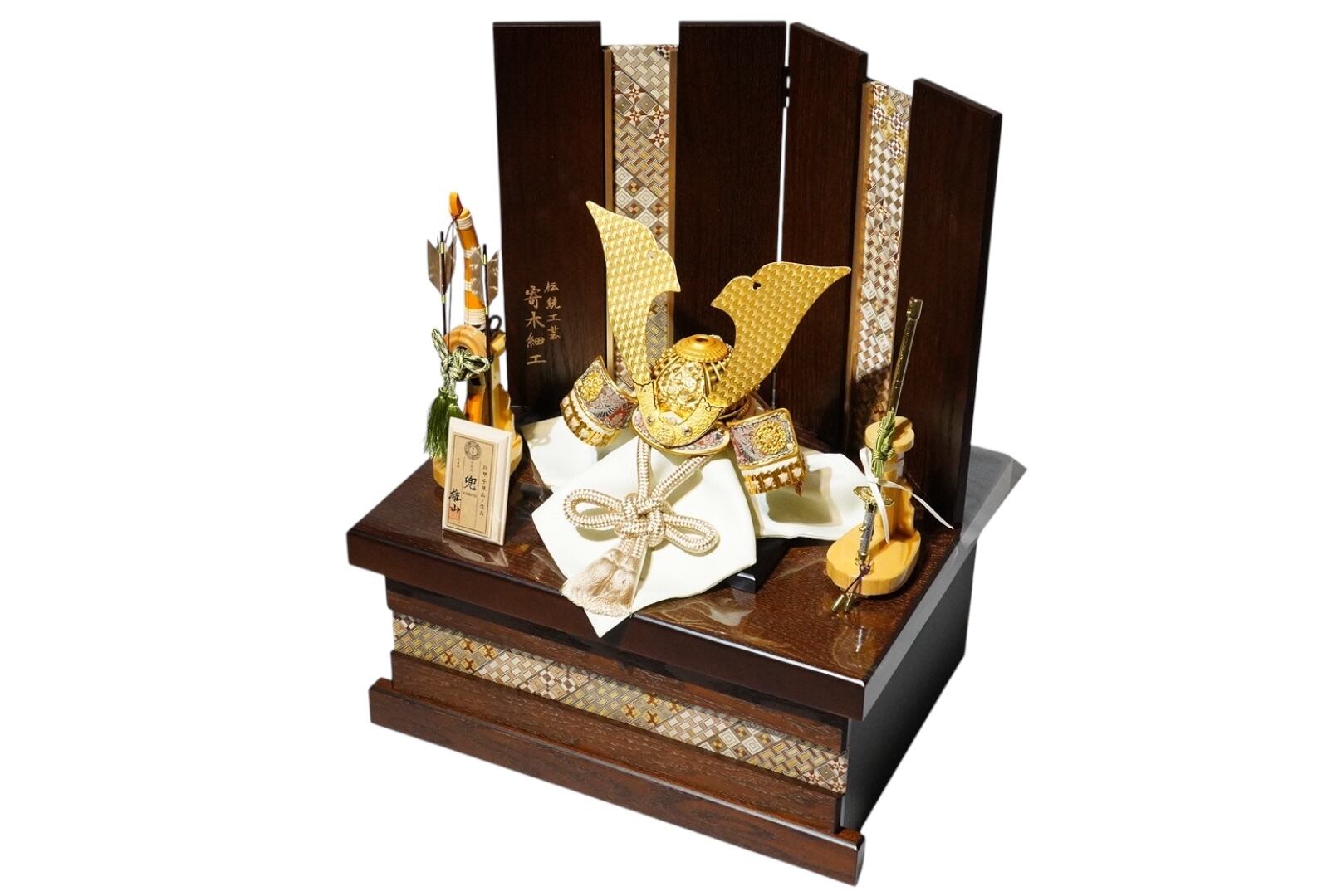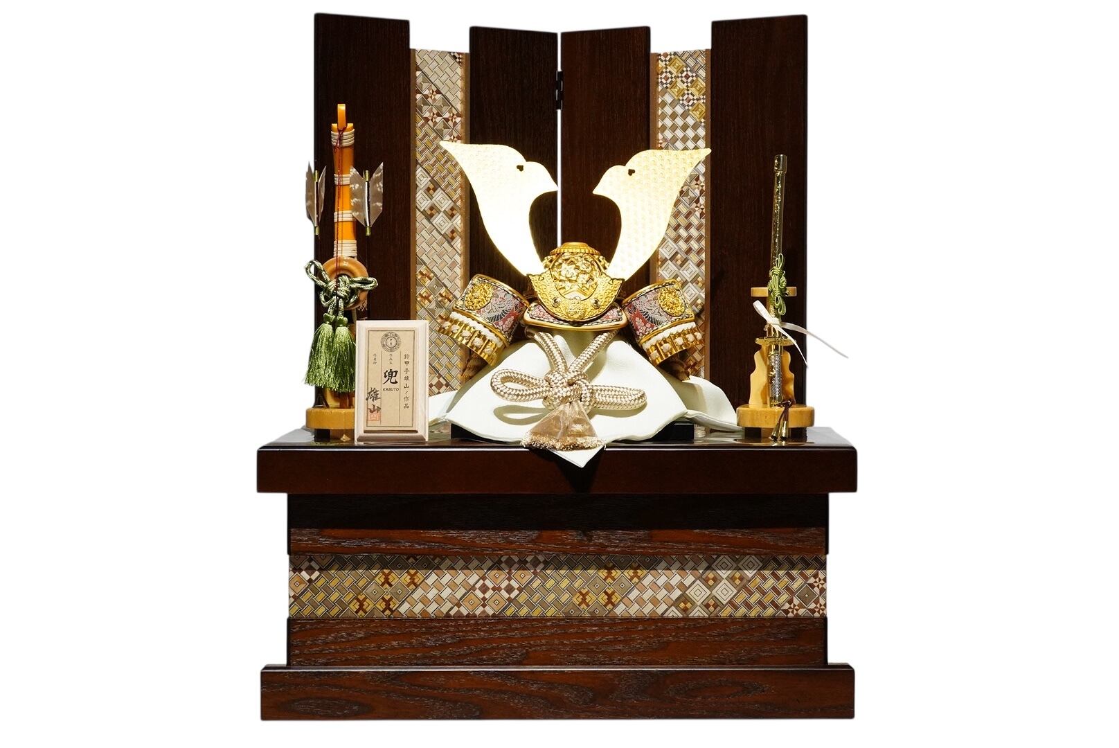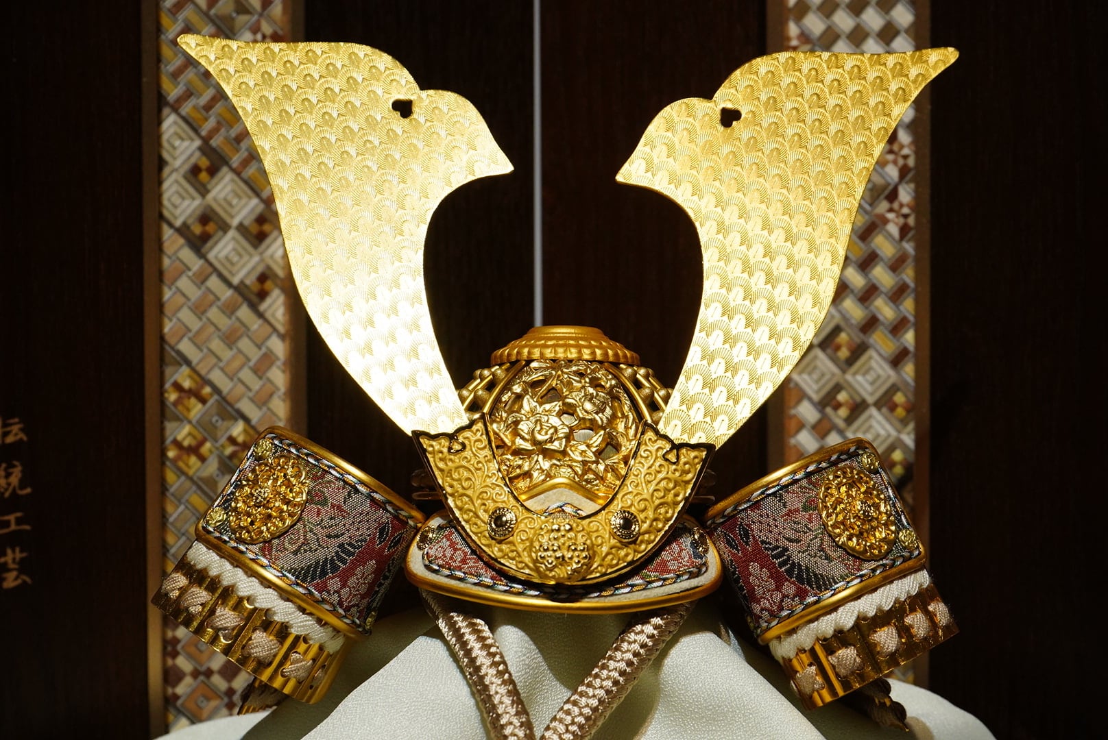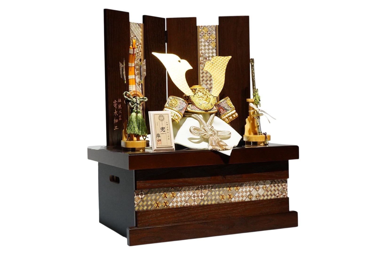 精緻な幾何学模様と深みのある木目が、兜の美しさを一層引き立て、空間に格調高い趣を添えます。
