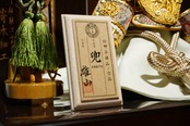 金色に輝く大鍬形が印象的な、雄山作の御兜飾り。