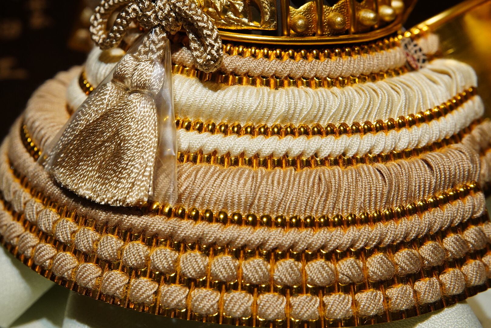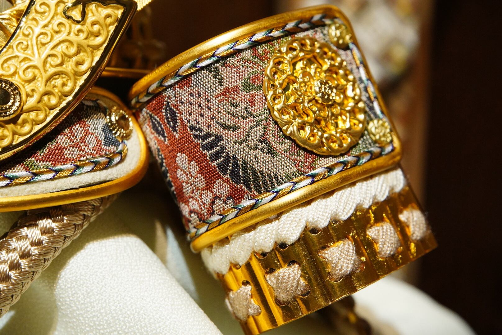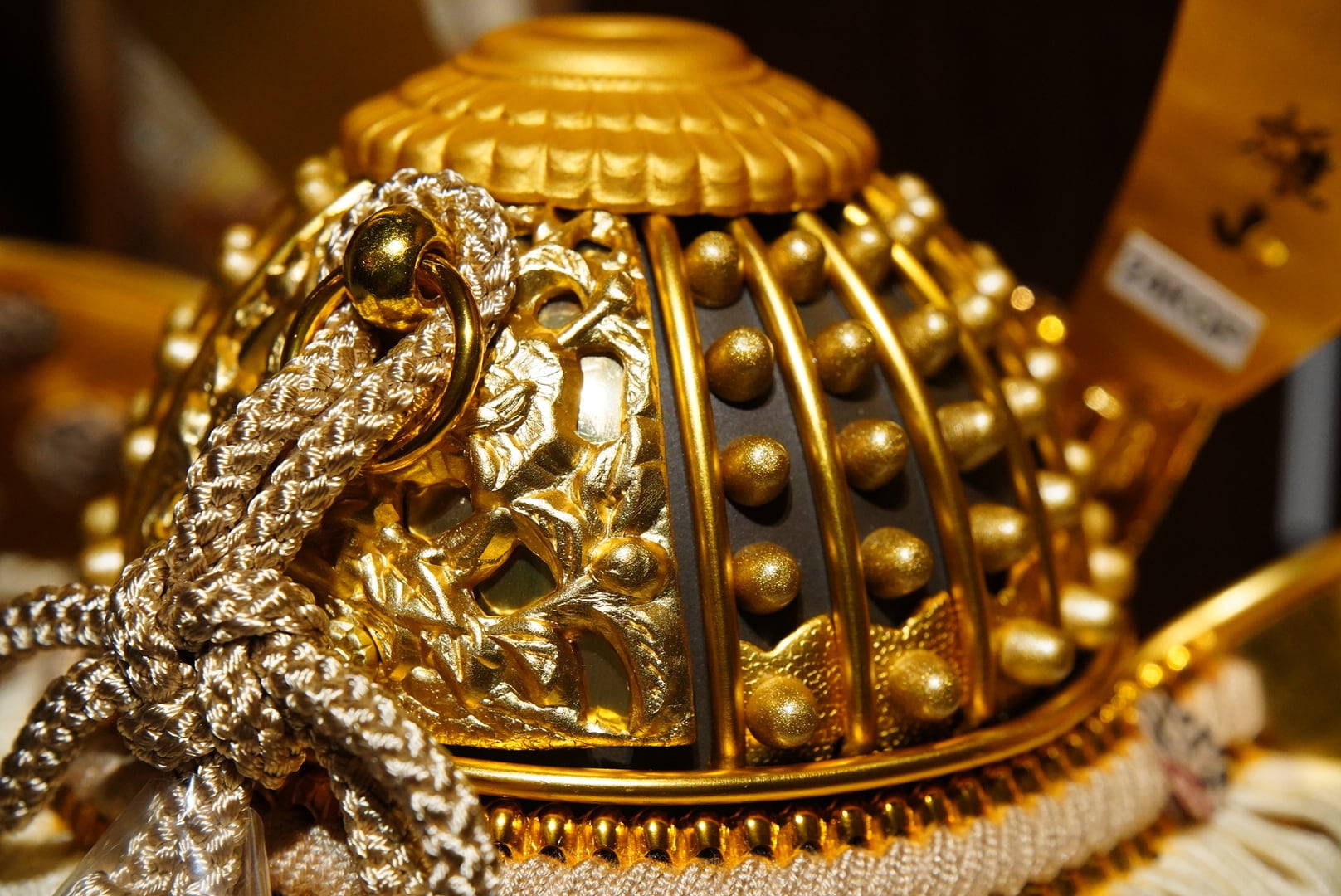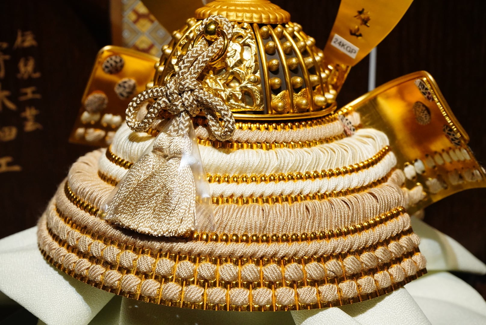 繊細な文様が施された兜は、柔らかな色合いの威し糸と調和し、上品で落ち着いた存在感を放ちます。