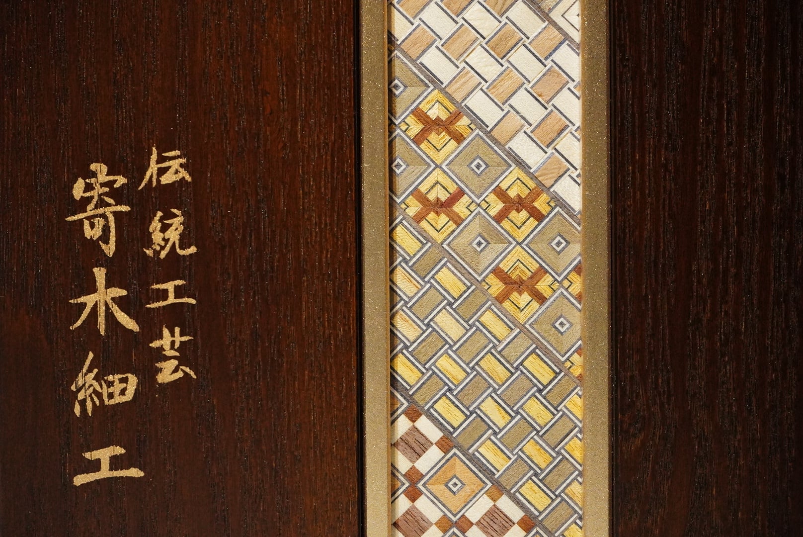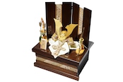 屏風と飾り台には箱根の寄木細工を使用。