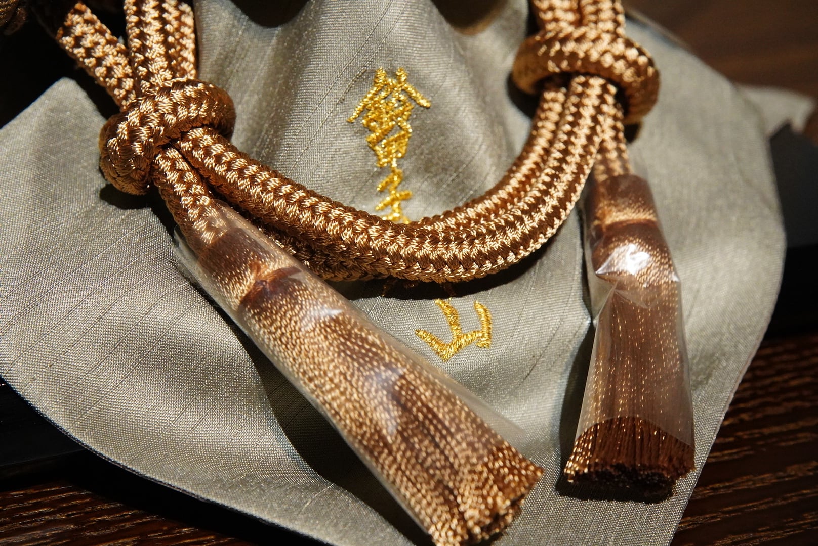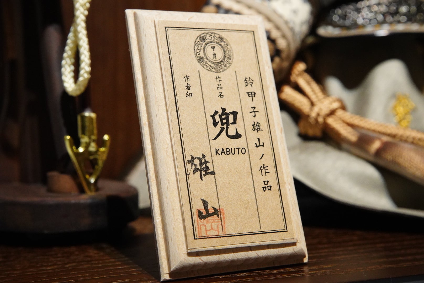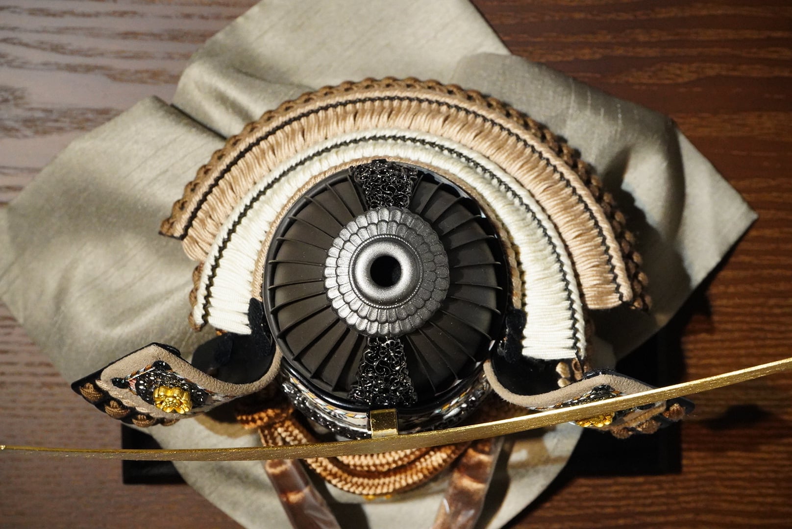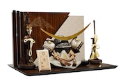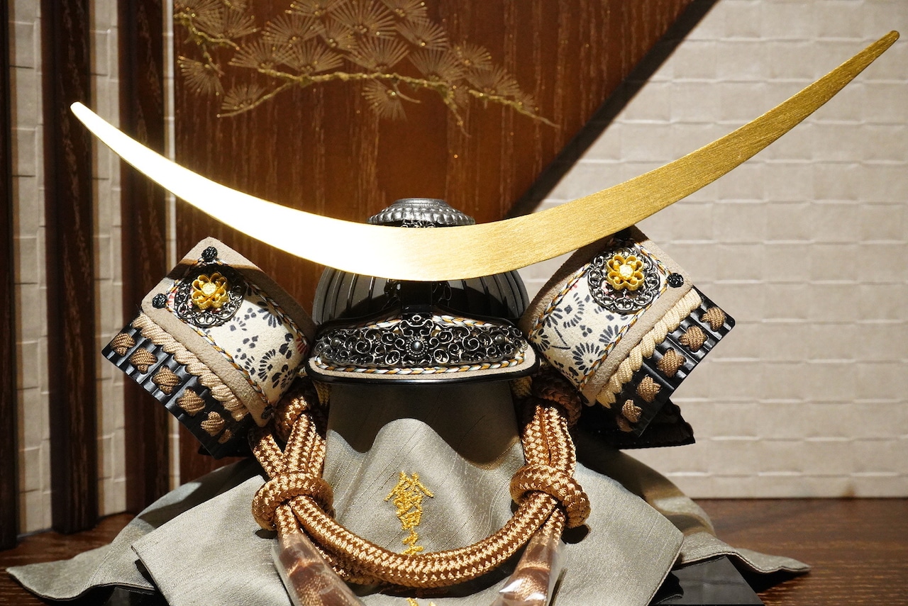 落ち着いた色味の忍び緒や袱紗が全体を上品にまとめ、武将飾りらしい堂々とした存在感を引き立てます。