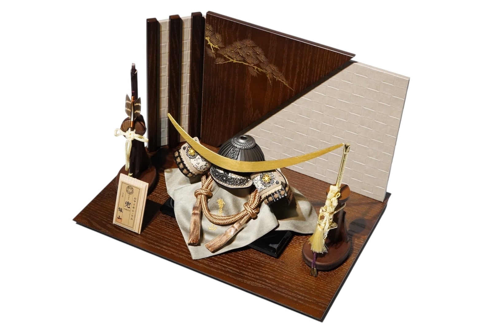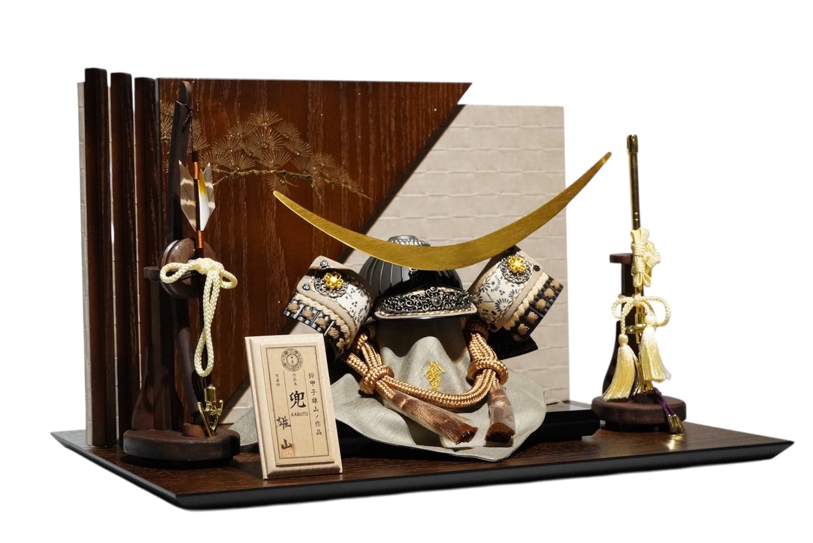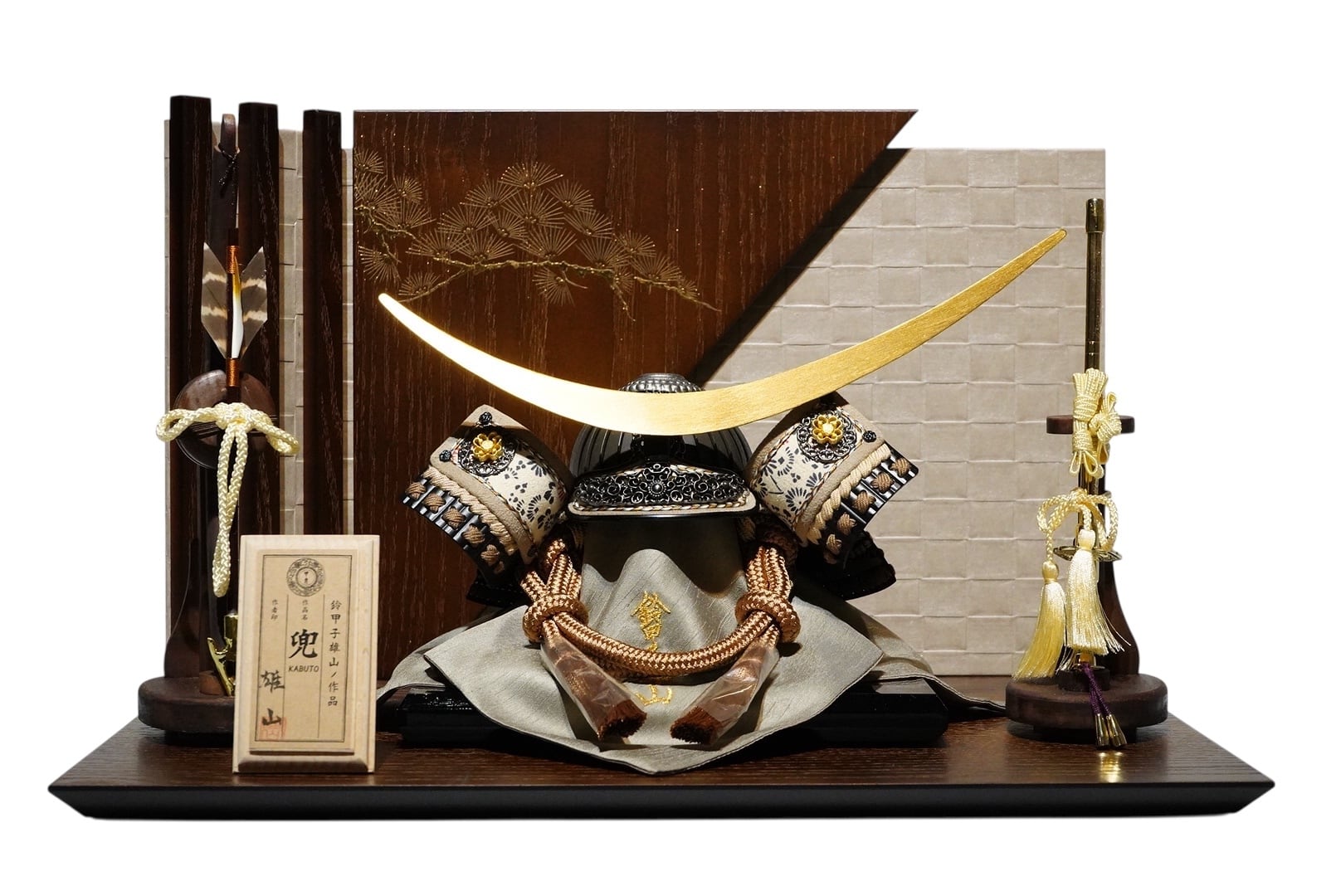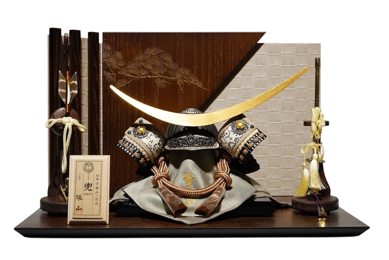 両脇には弓太刀を配し、格式ある兜飾りとしての風格を備えています。