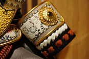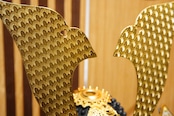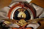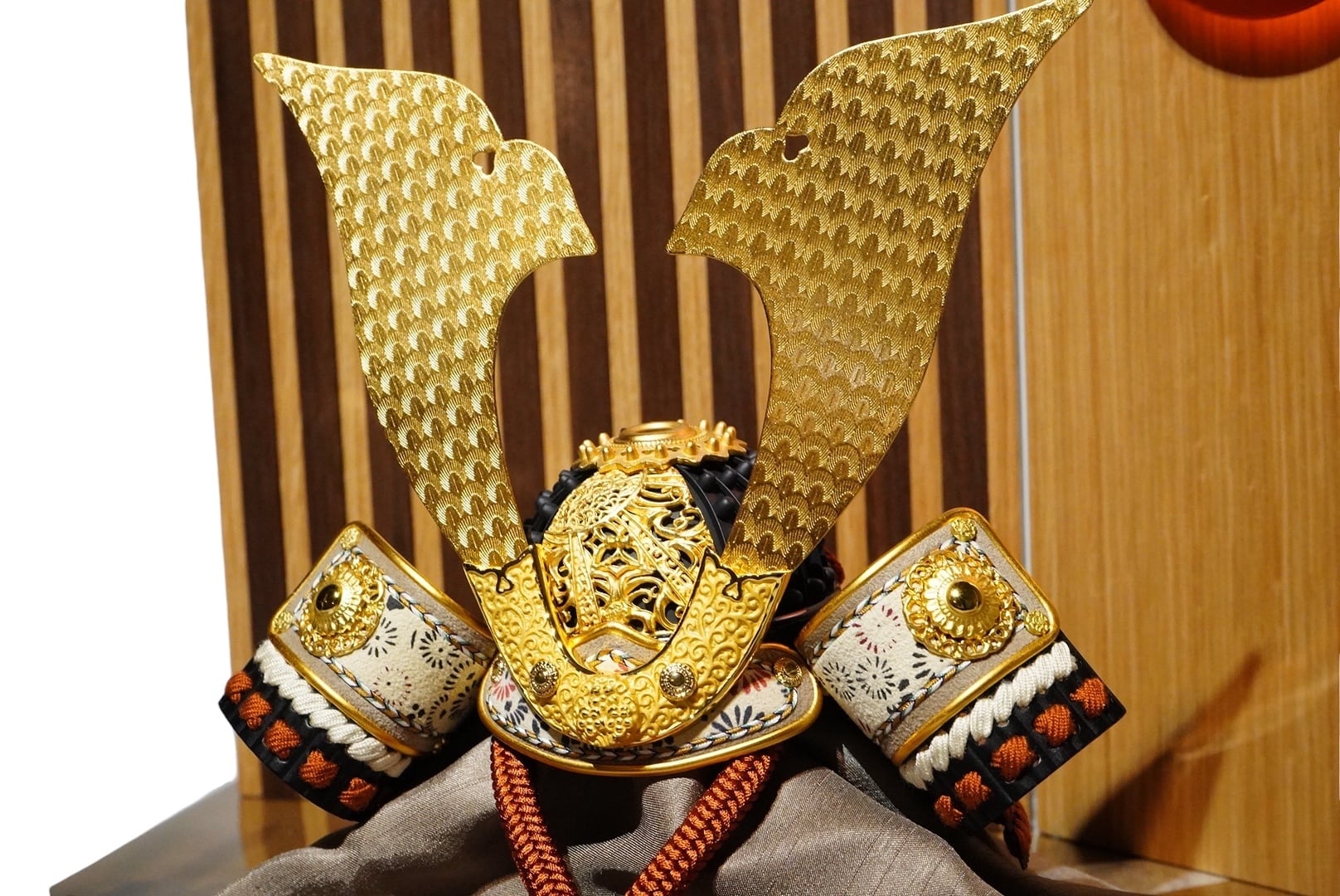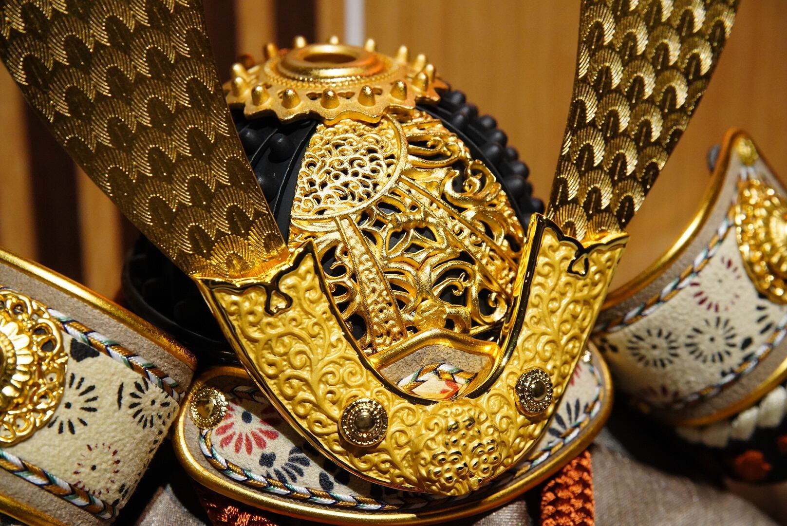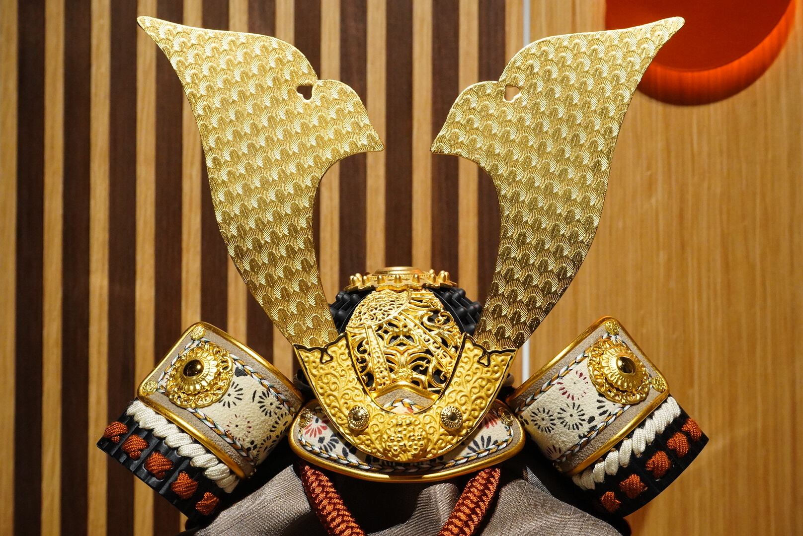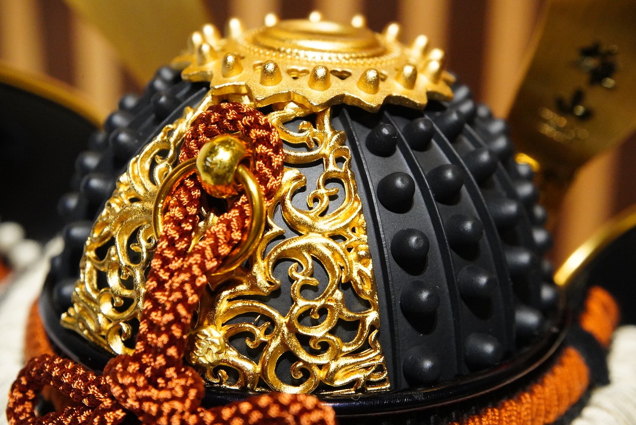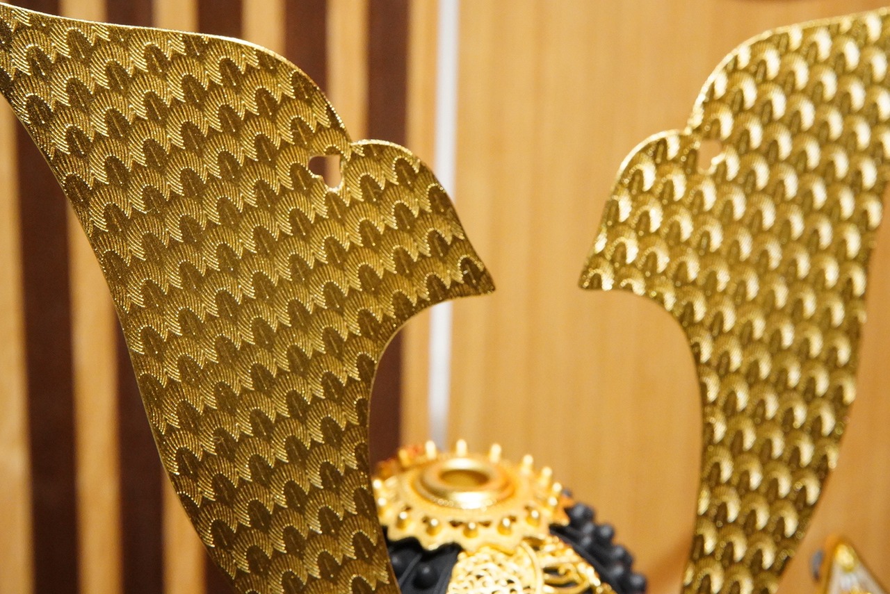 堂々と左右に広がる金色の前立ては、勇ましさの中にも気品を感じさせ、見る人の目を引く印象的な意匠となっています。