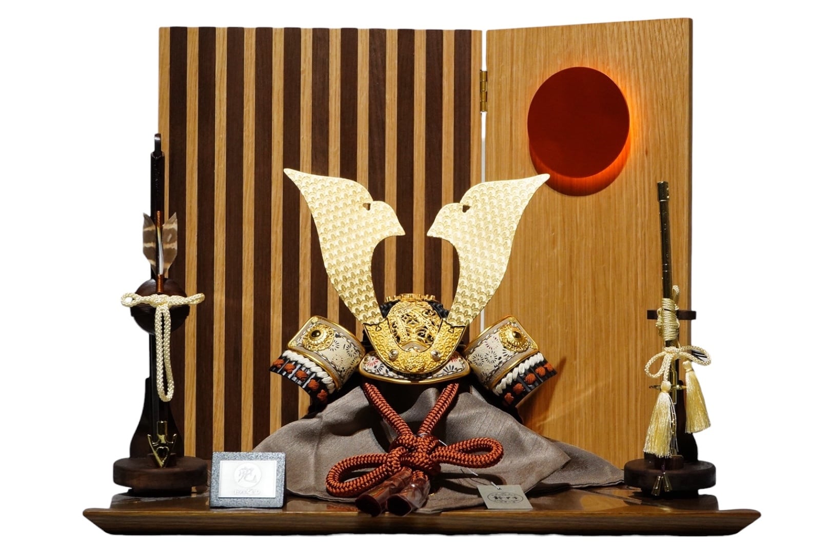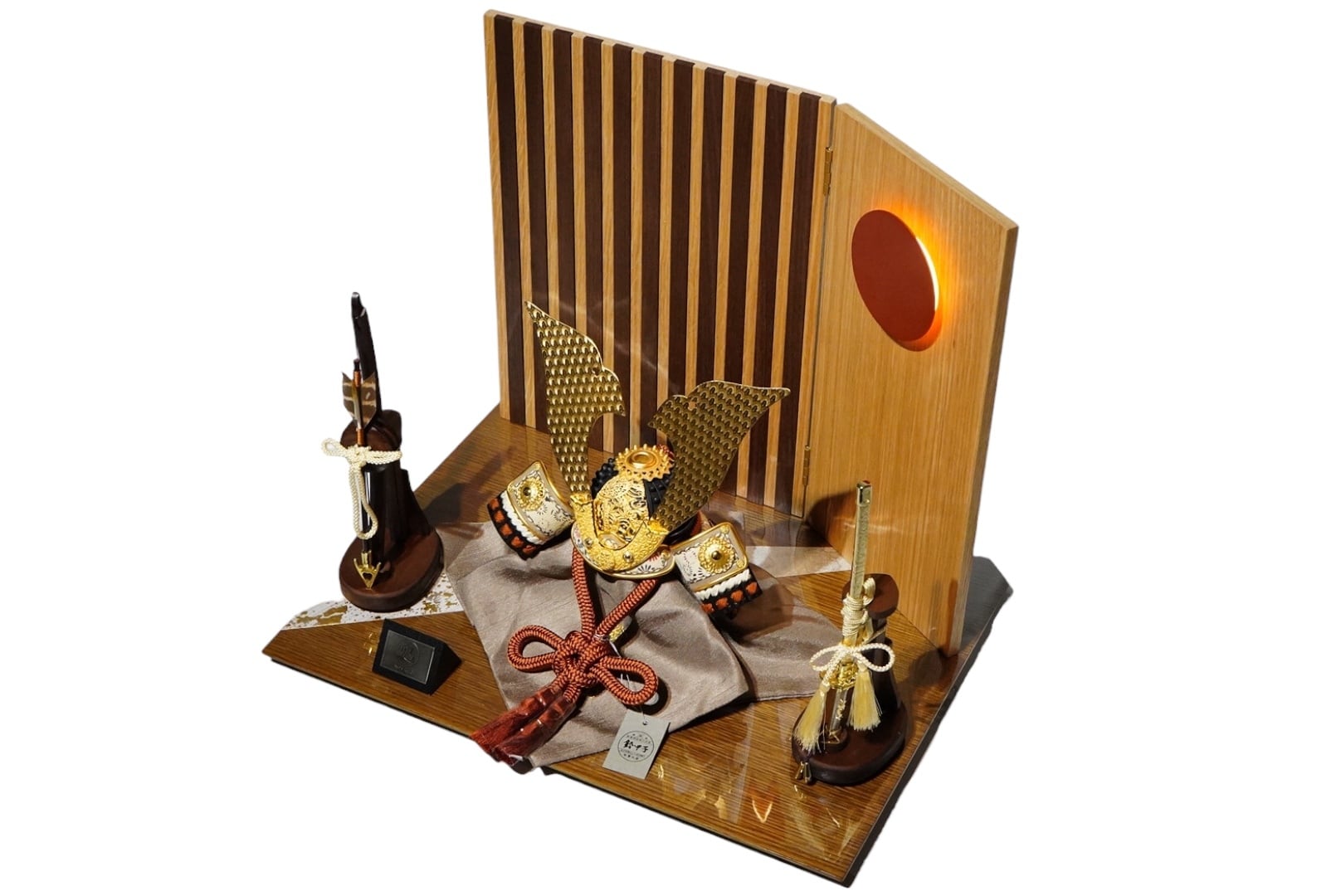 右上に配された太陽を思わせる円形の意匠にはLEDが内蔵されており、灯りをともすことでやわらかな光が広がり、兜をより一層印象的に引き立てます。