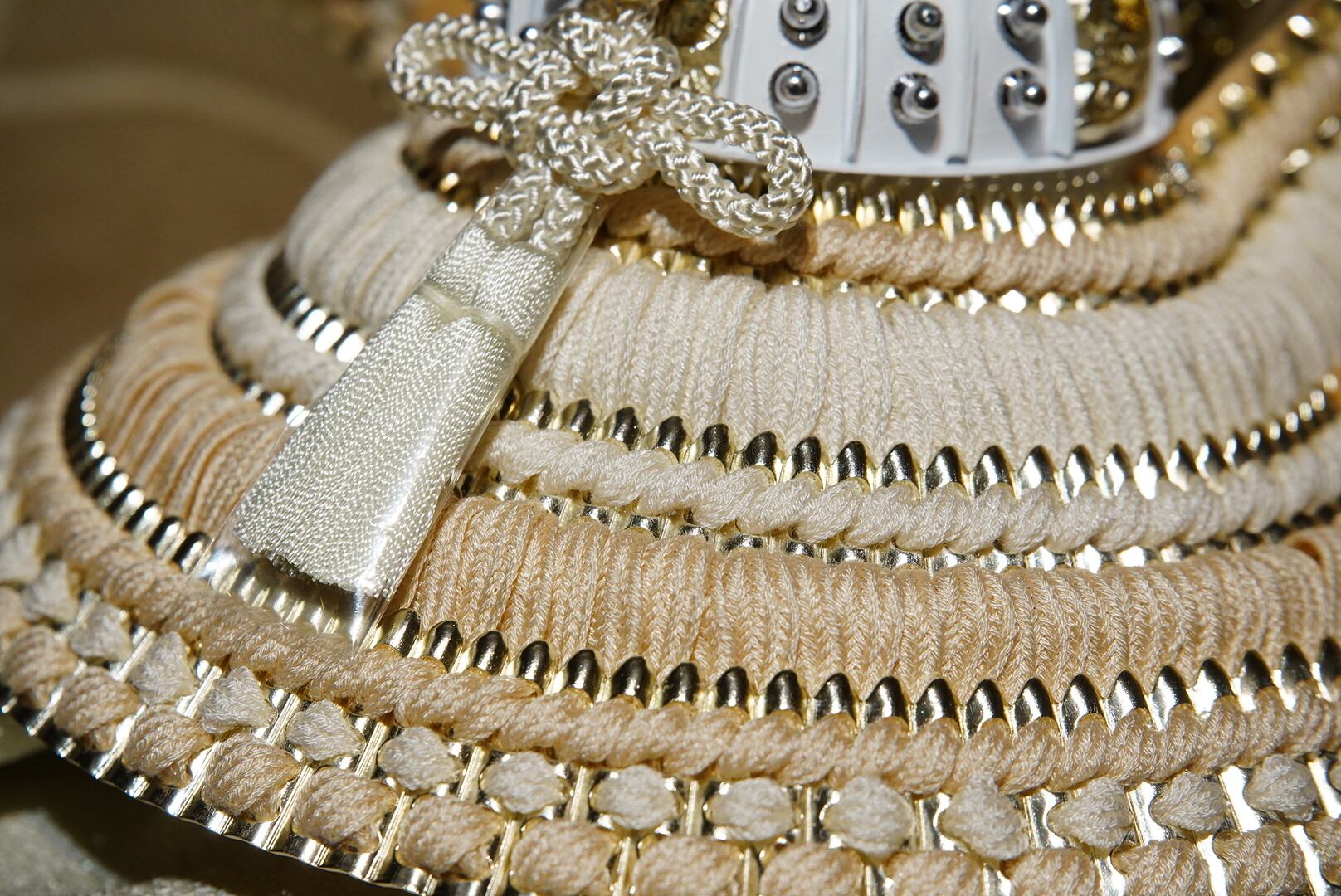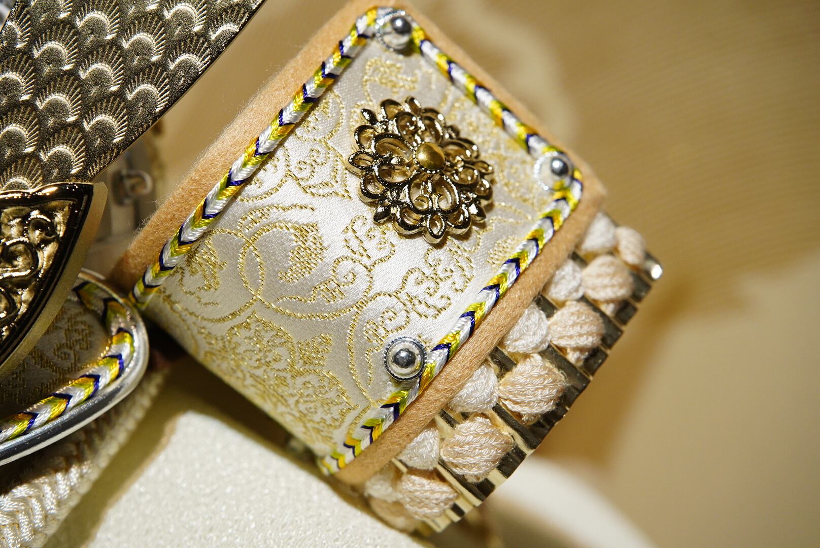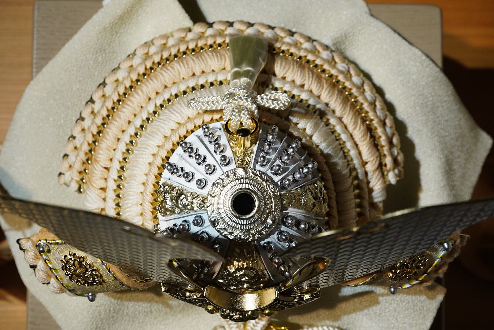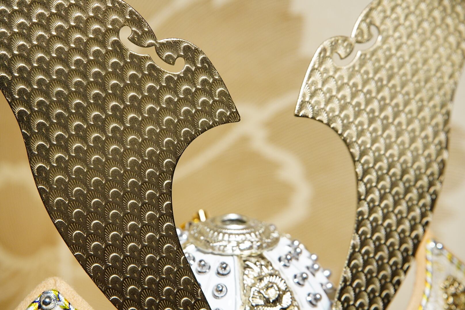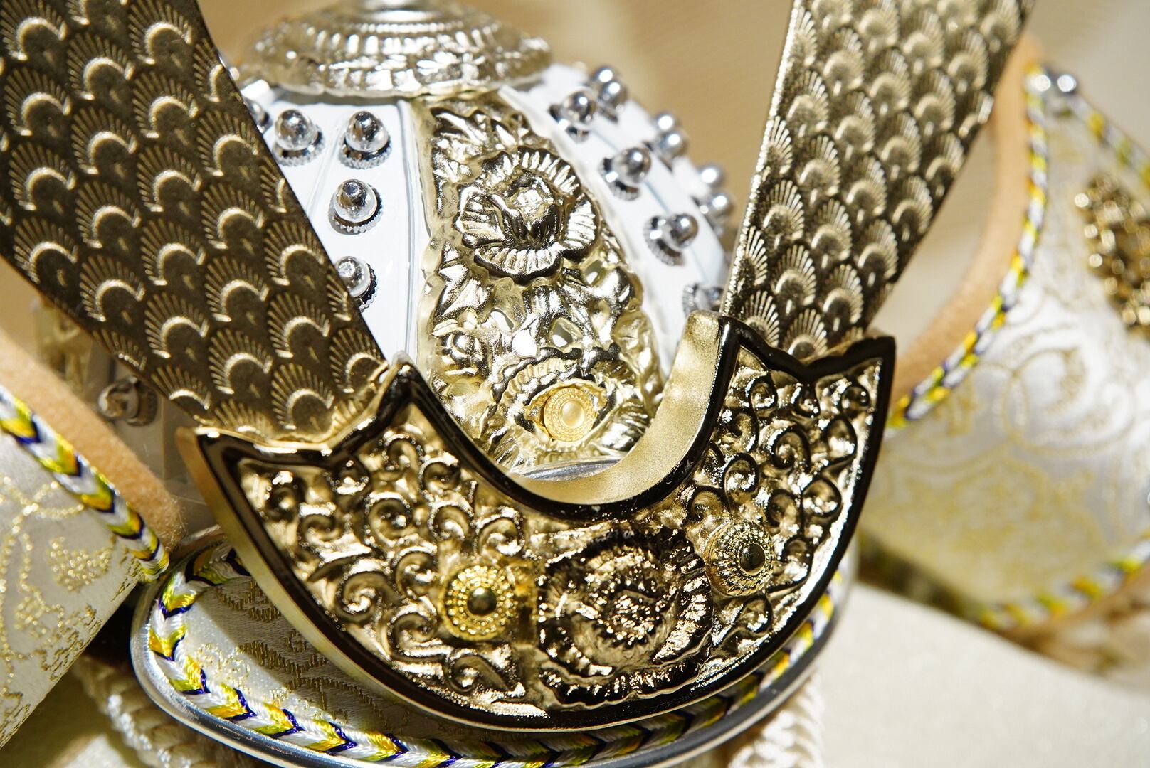白を基調とした兜は、清らかで上品な佇まいが印象的で、鍬形には繊細な文様が施され、光を受けるたびにやわらかな輝きを放ちます。