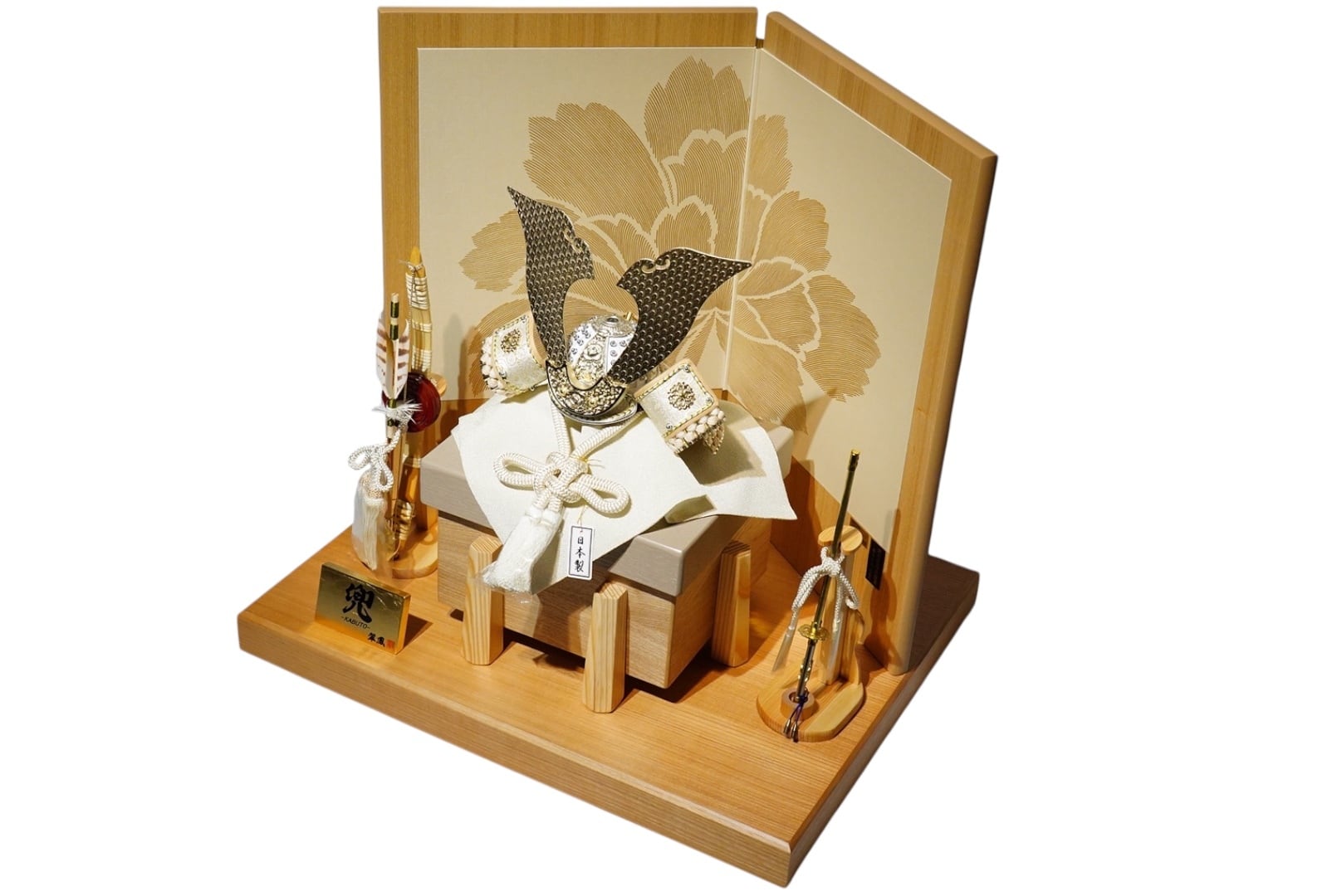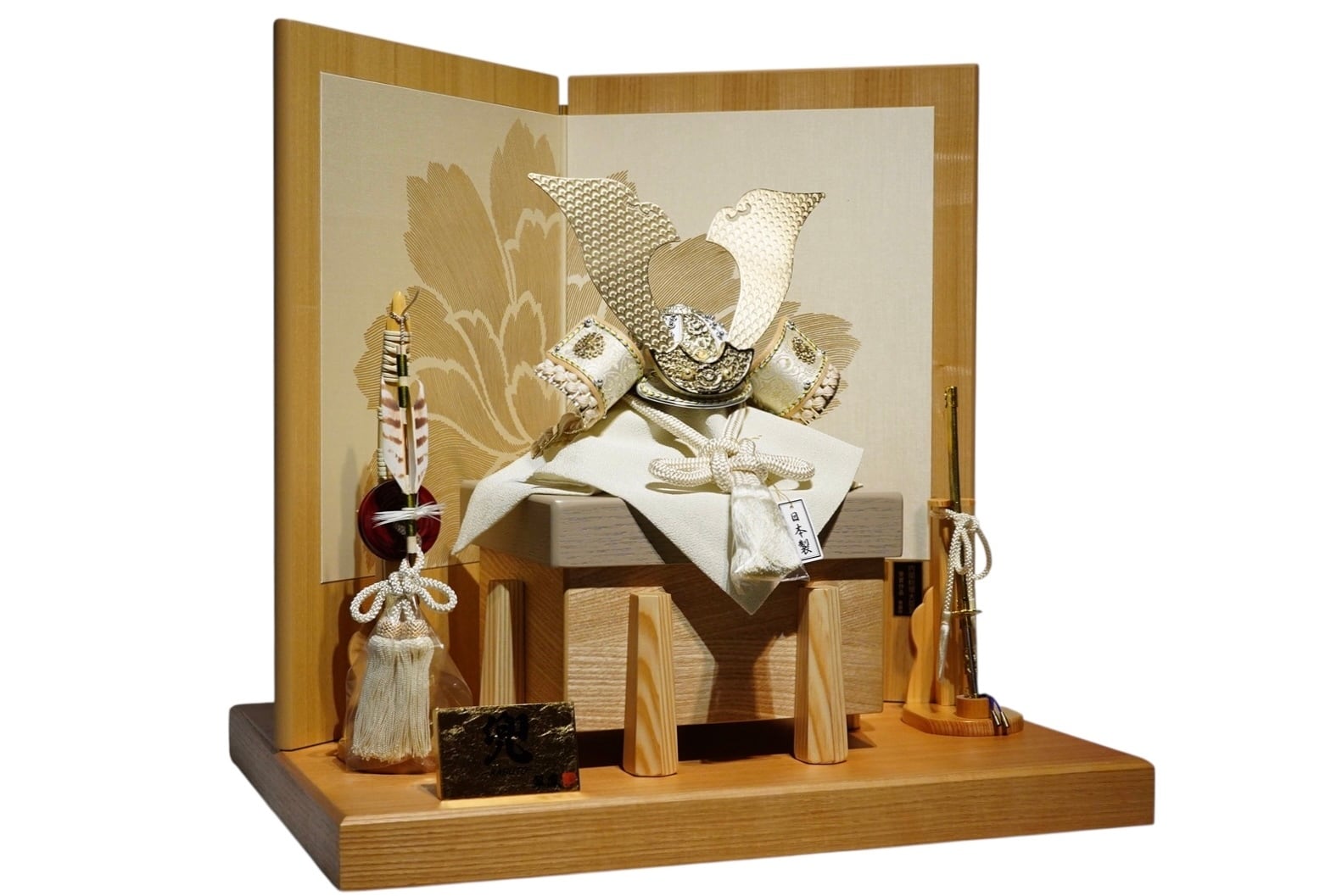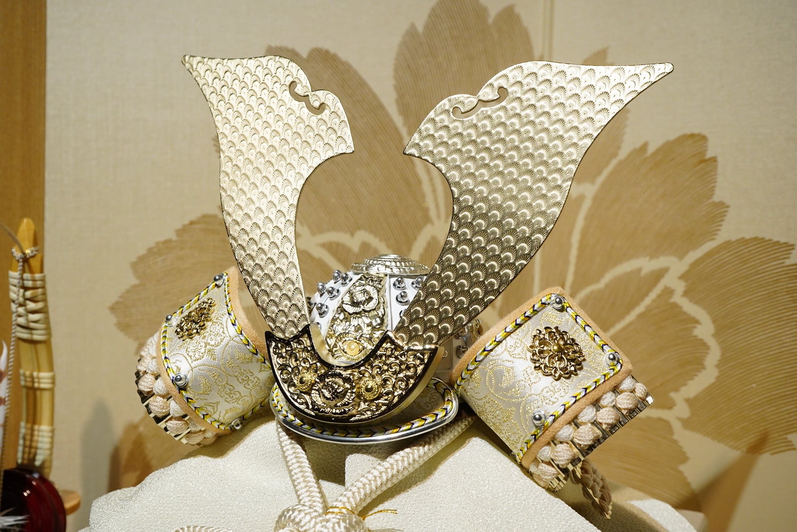 背後に配された屏風には、やわらかな金彩で優雅な花模様が描かれており、兜の気品ある白との調和が美しく、飾り全体に華やかさと格調を添えています。
