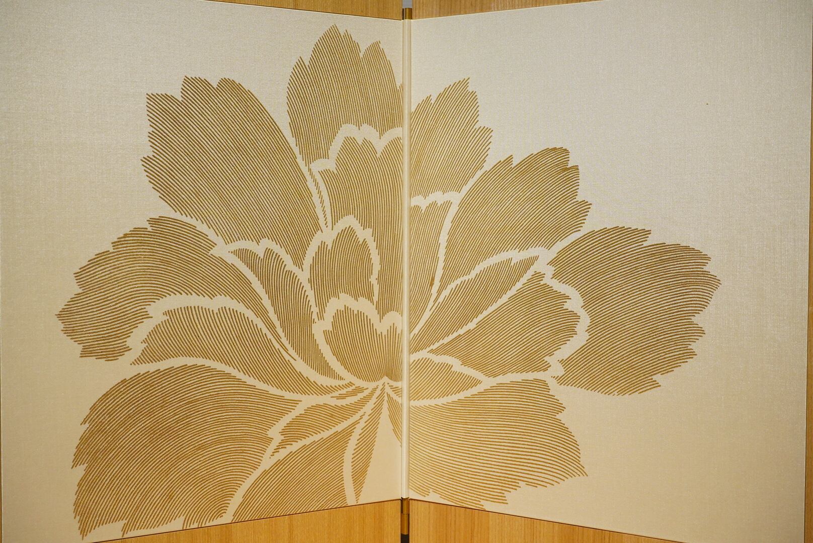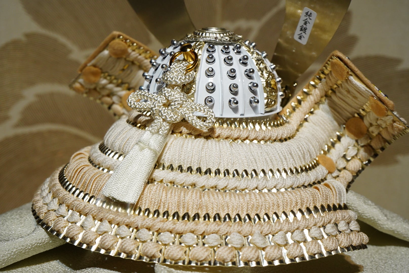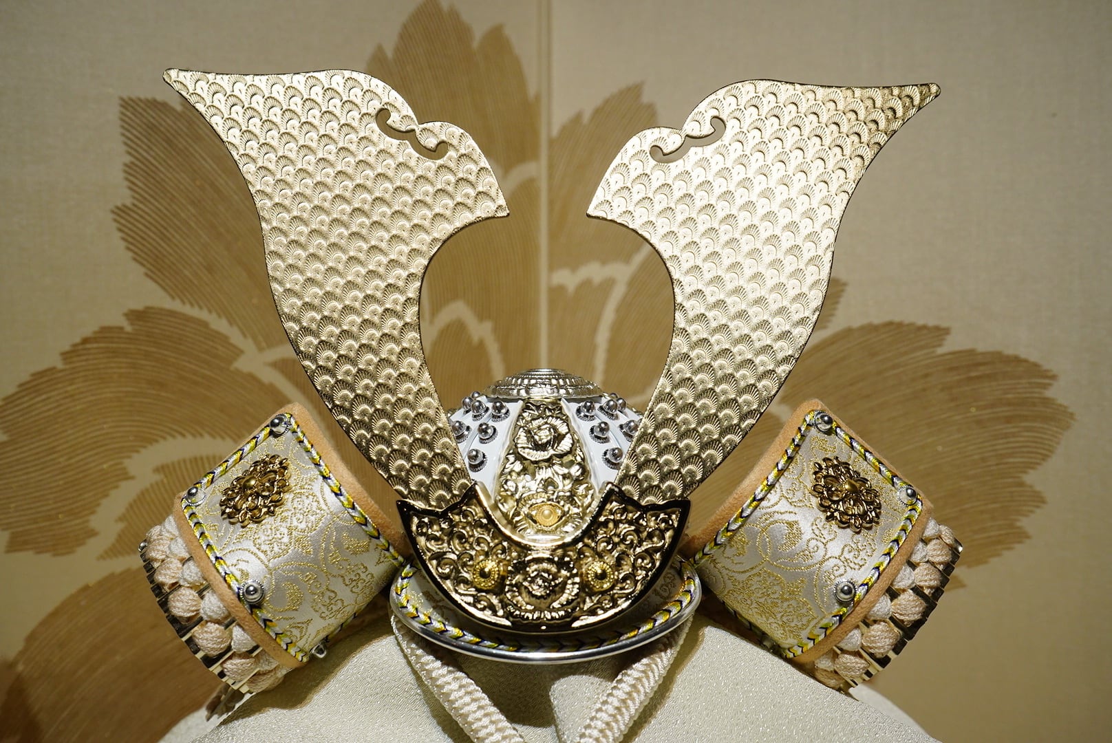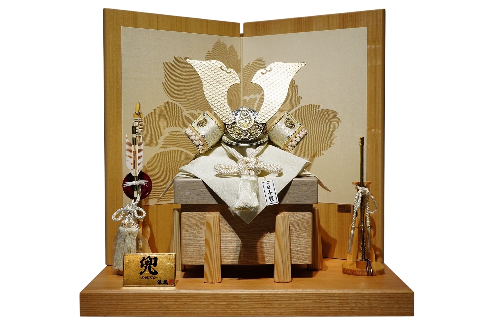 背後に配された屏風には、やわらかな金彩で優雅な花模様が描かれており、兜の気品ある白との調和が美しく、飾り全体に華やかさと格調を添えています。