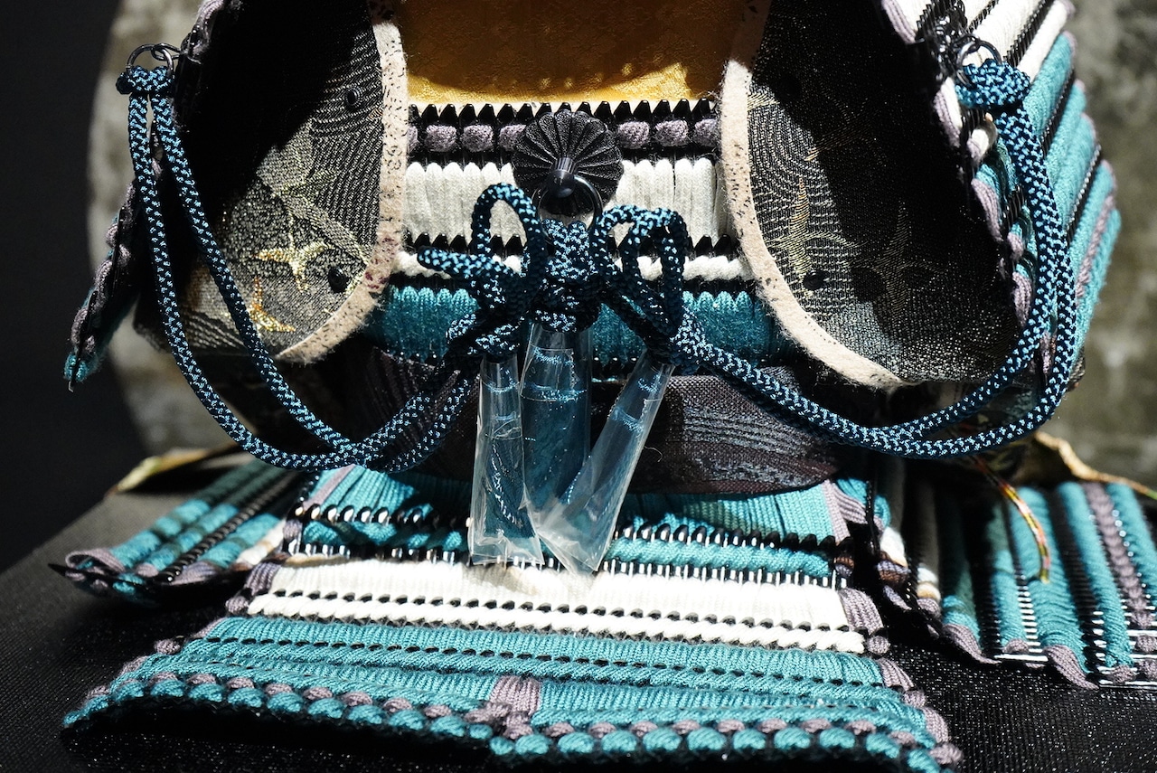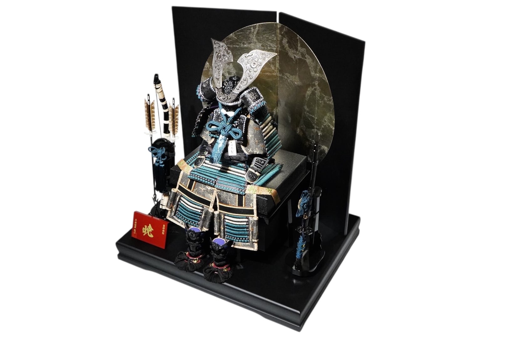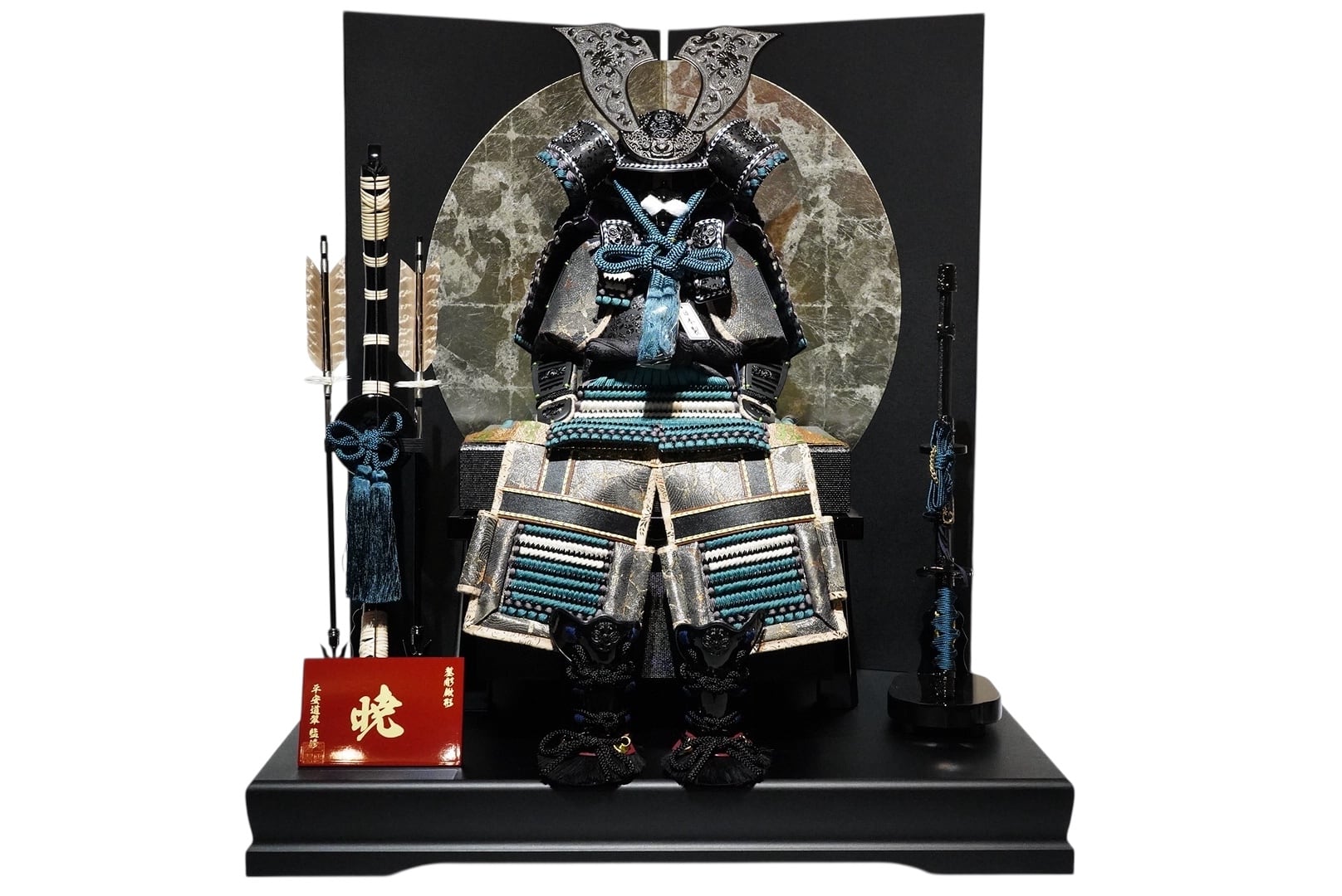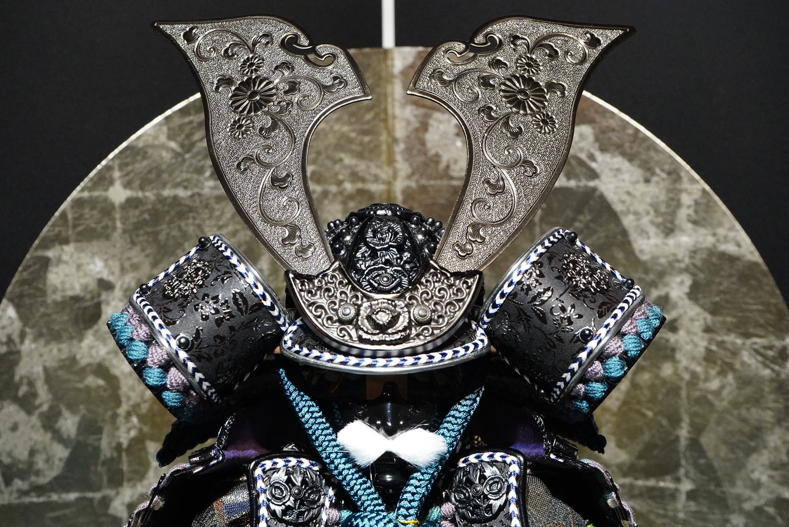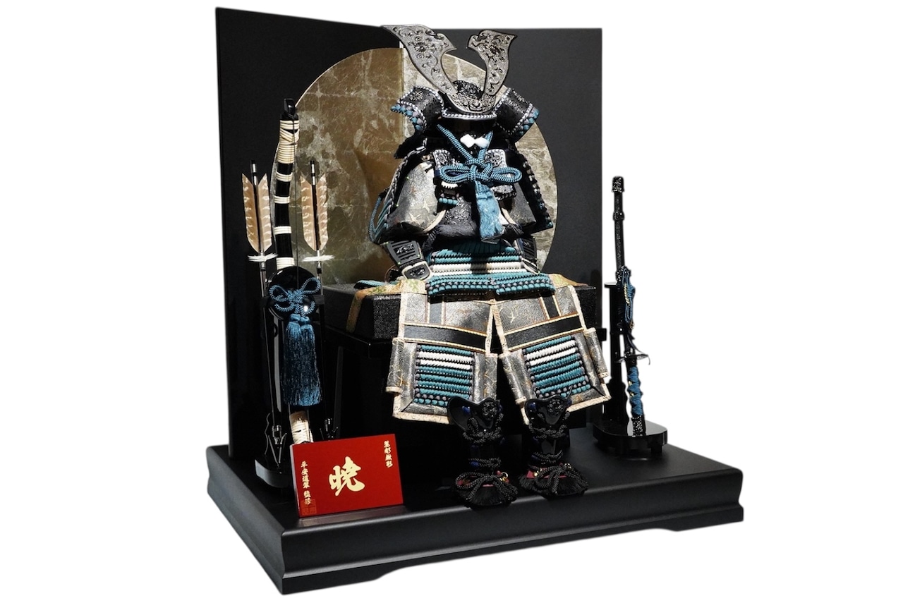 鎧は深みのある黒を基調とし、青緑色の威し糸が重厚さの中に洗練された彩りを添えています。背景には円形の意匠を配した屏風を据え、鎧の美しさを際立たせる落ち着いた飾り構成に。