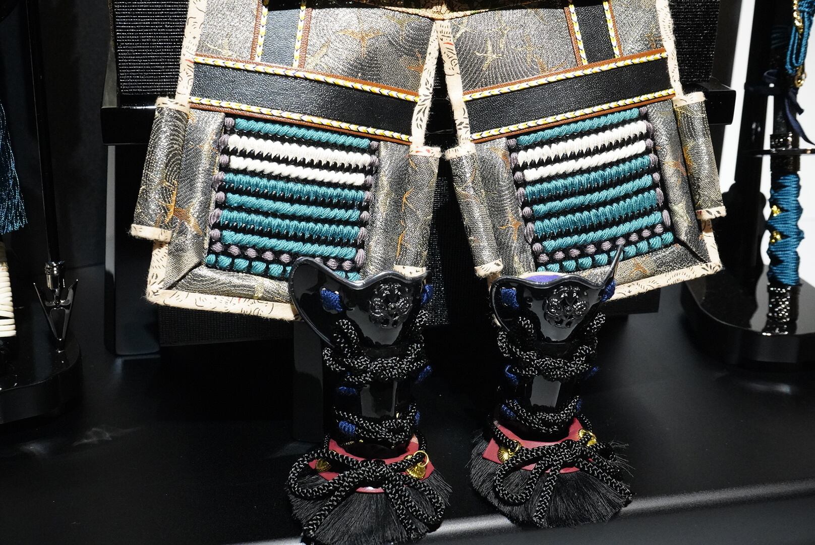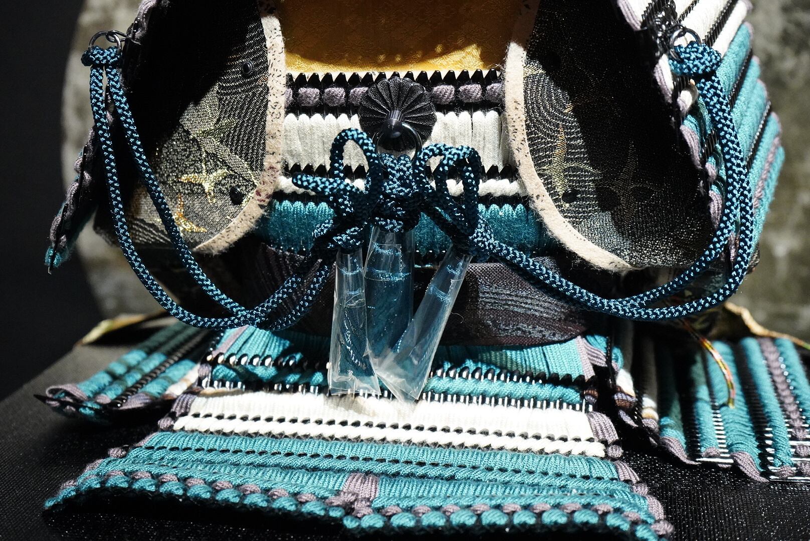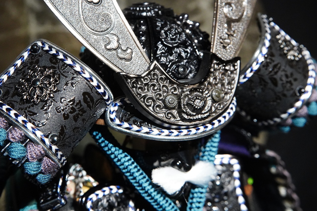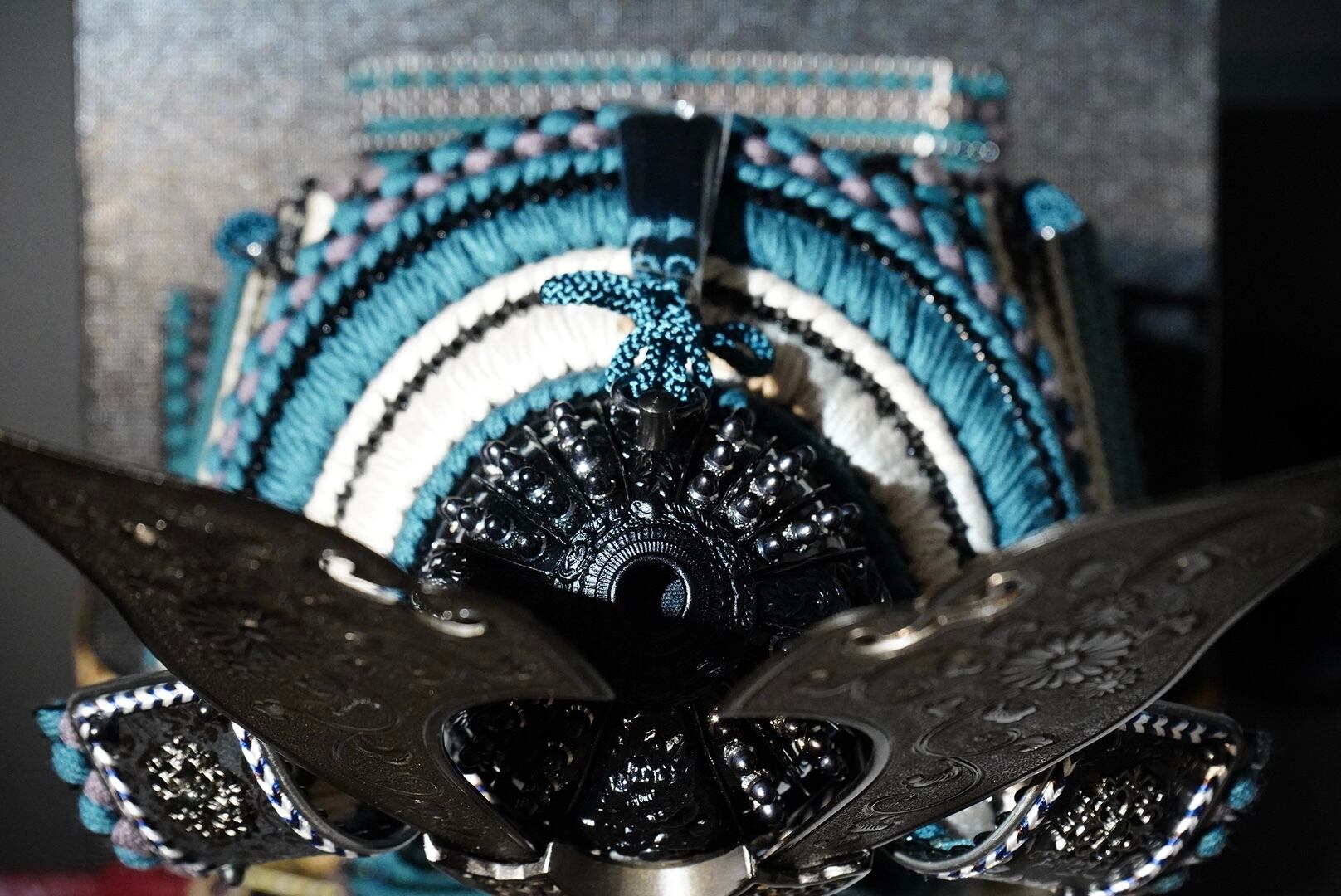 鎧は深みのある黒を基調とし、青緑色の威し糸が重厚さの中に洗練された彩りを添えています。背景には円形の意匠を配した屏風を据え、鎧の美しさを際立たせる落ち着いた飾り構成に。