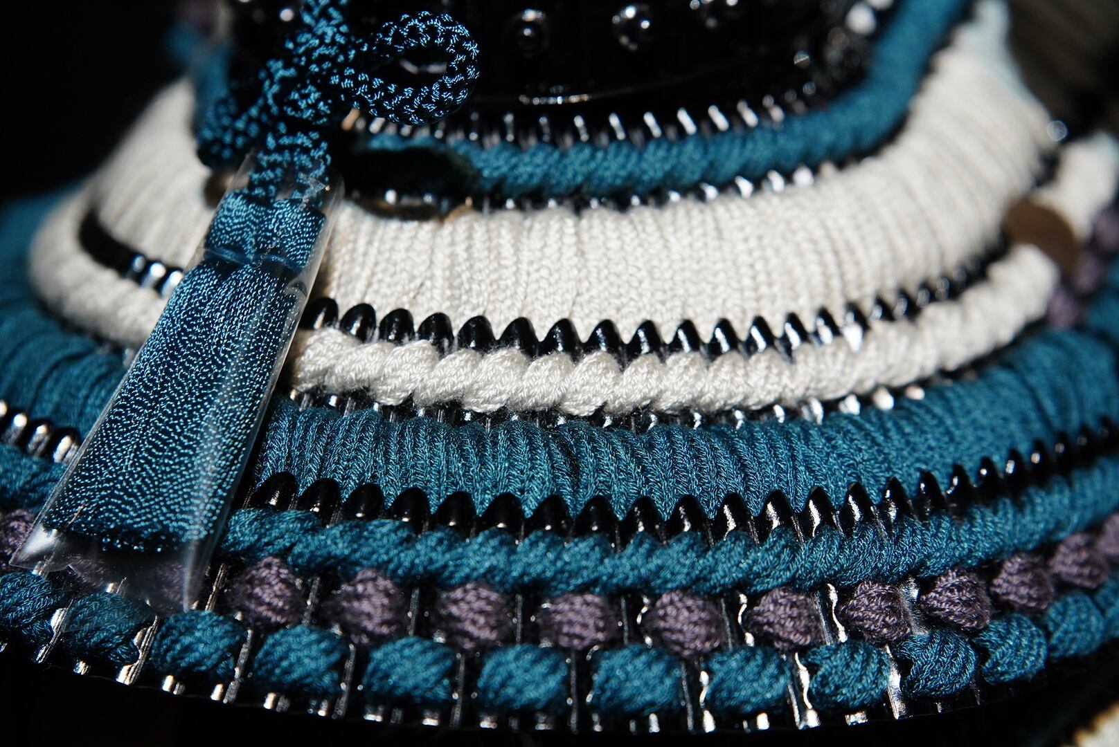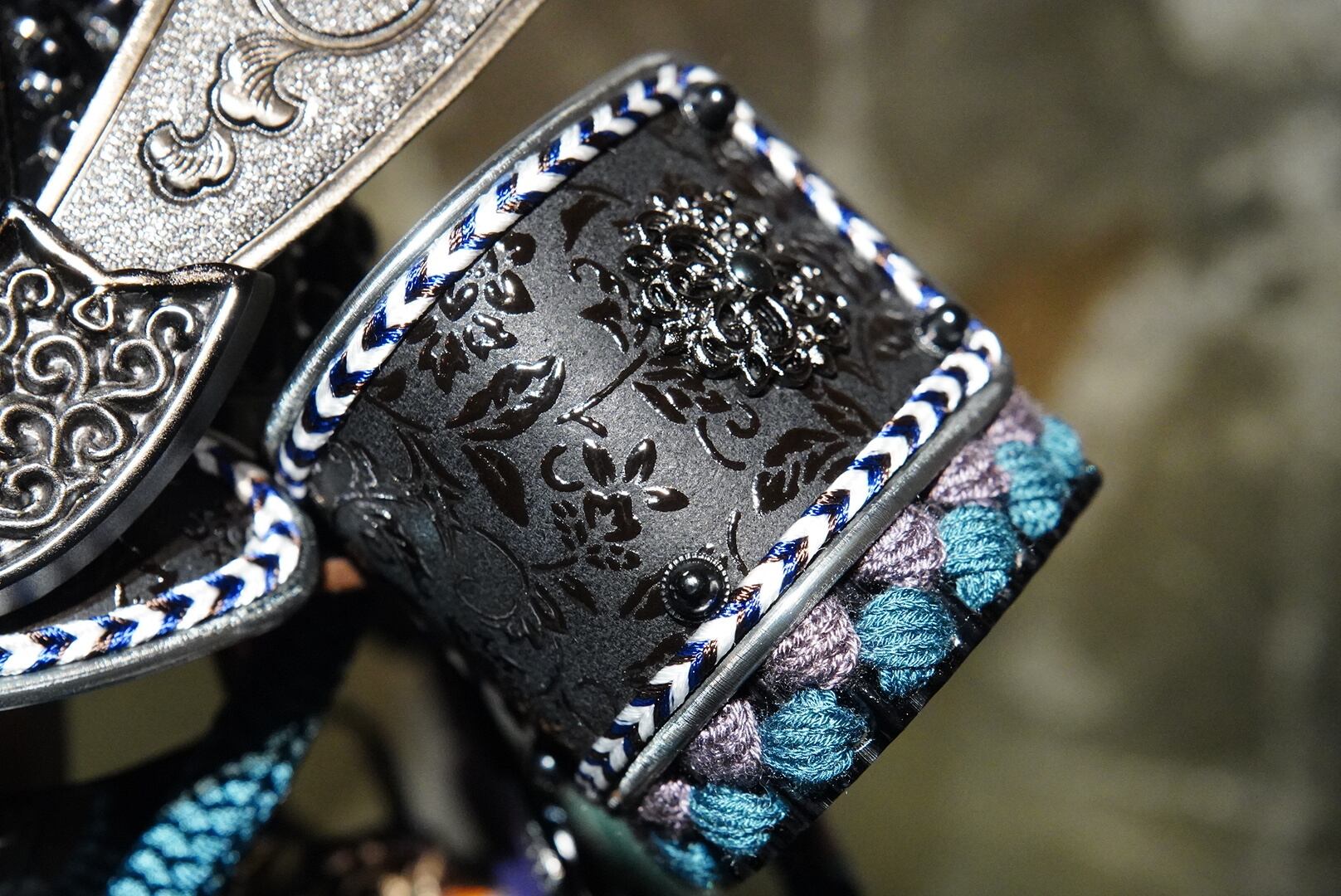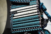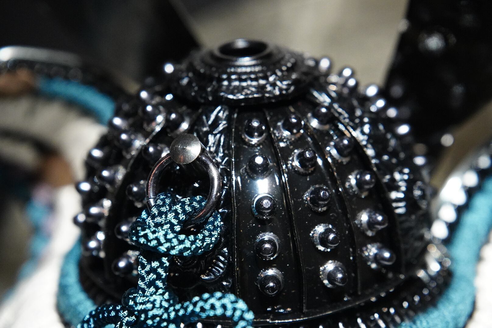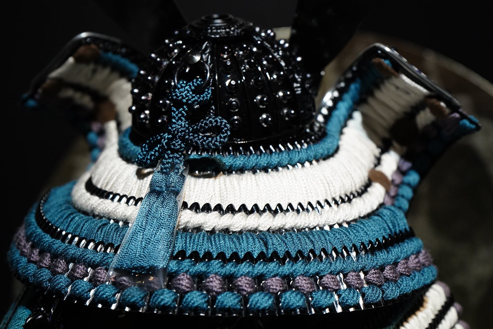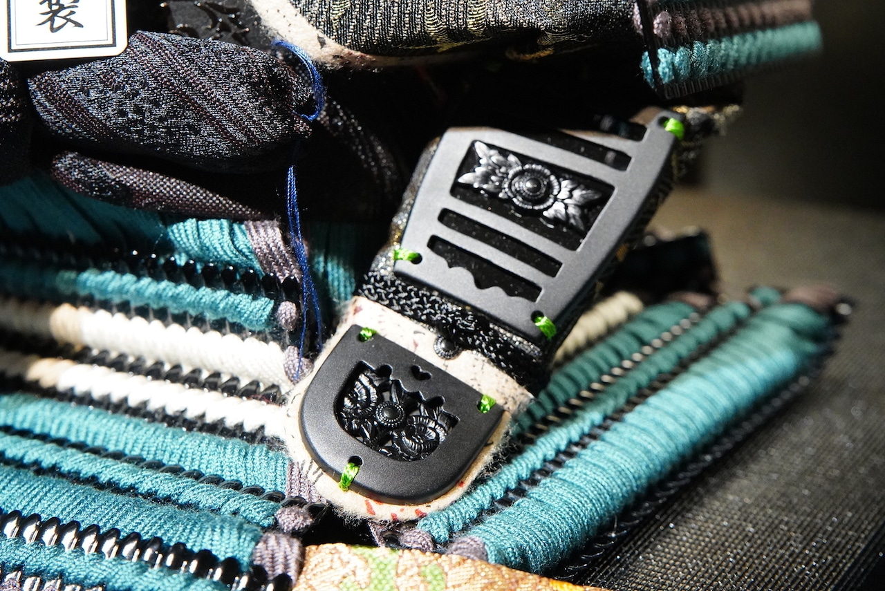 鎧は深みのある黒を基調とし、青緑色の威し糸が重厚さの中に洗練された彩りを添えています。背景には円形の意匠を配した屏風を据え、鎧の美しさを際立たせる落ち着いた飾り構成に。