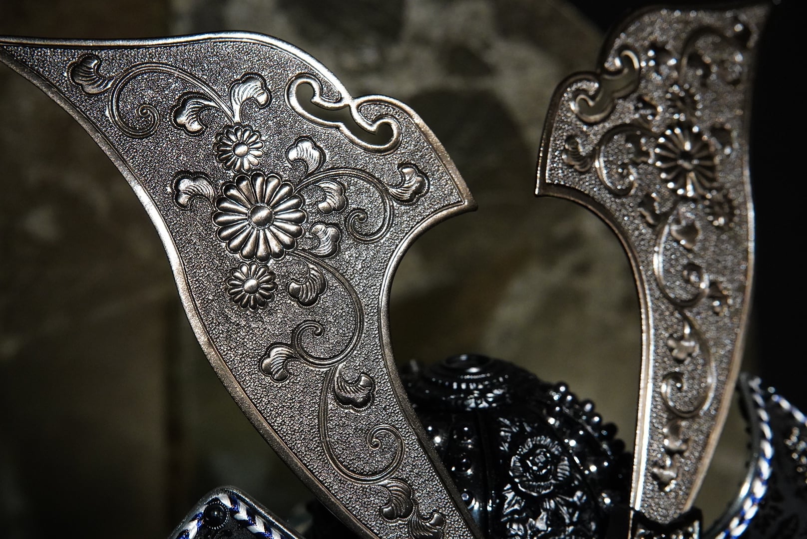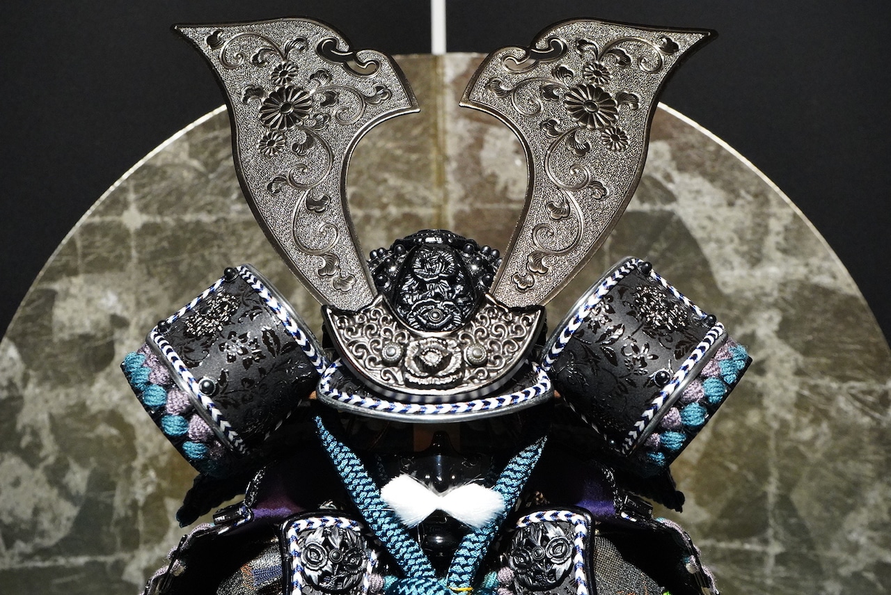兜の鍬形には、伝統技法である鏨彫(たがねぼり)が施されています。