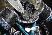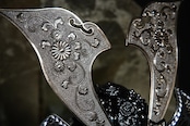 鏨彫とは、小さな鏨(たがね)と呼ばれる工具を用い、金属の表面を一打ち一打ち丁寧に打ち込んで文様を彫り上げていく高度な金工技術です。