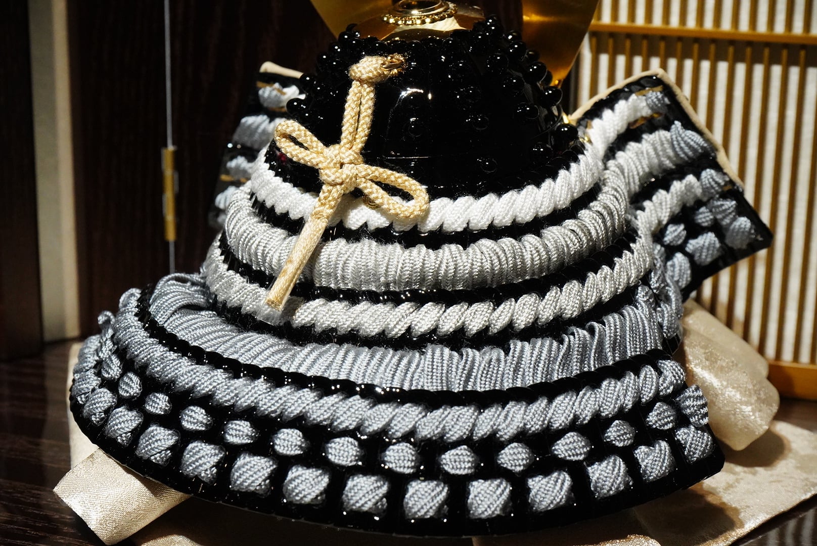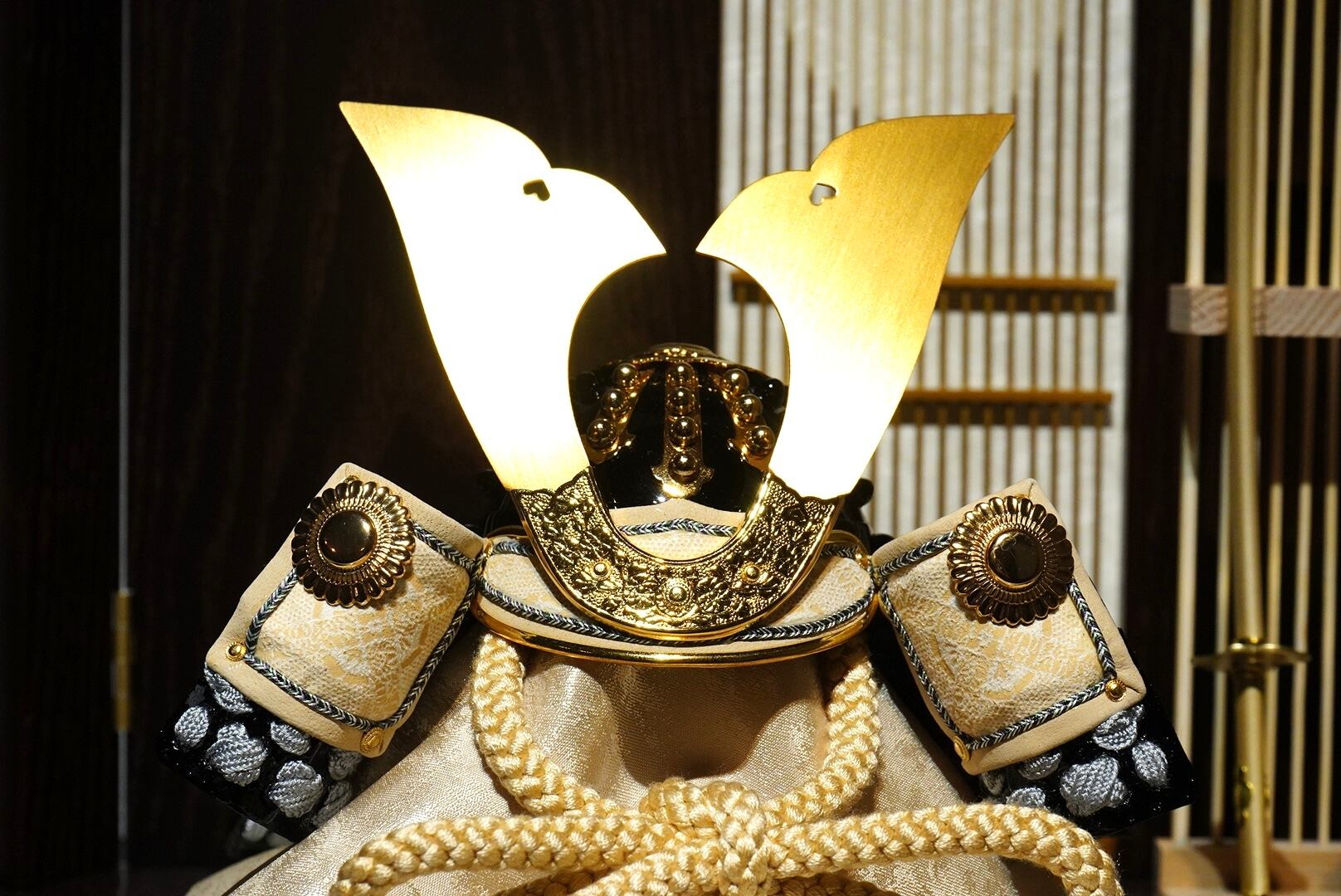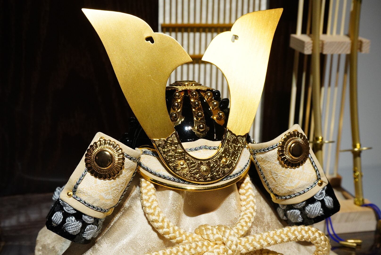 温かな光が兜の金具や正絹の質感を美しく引き立て、落ち着いた趣ある空間を演出します。