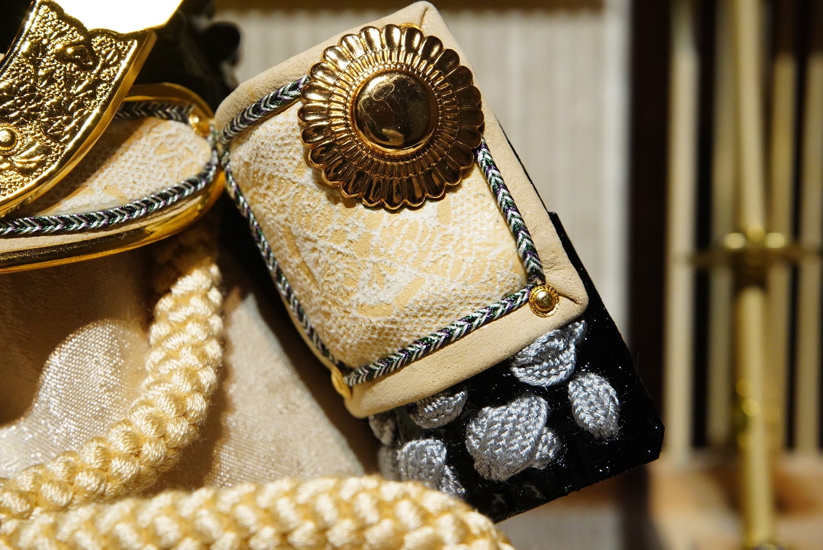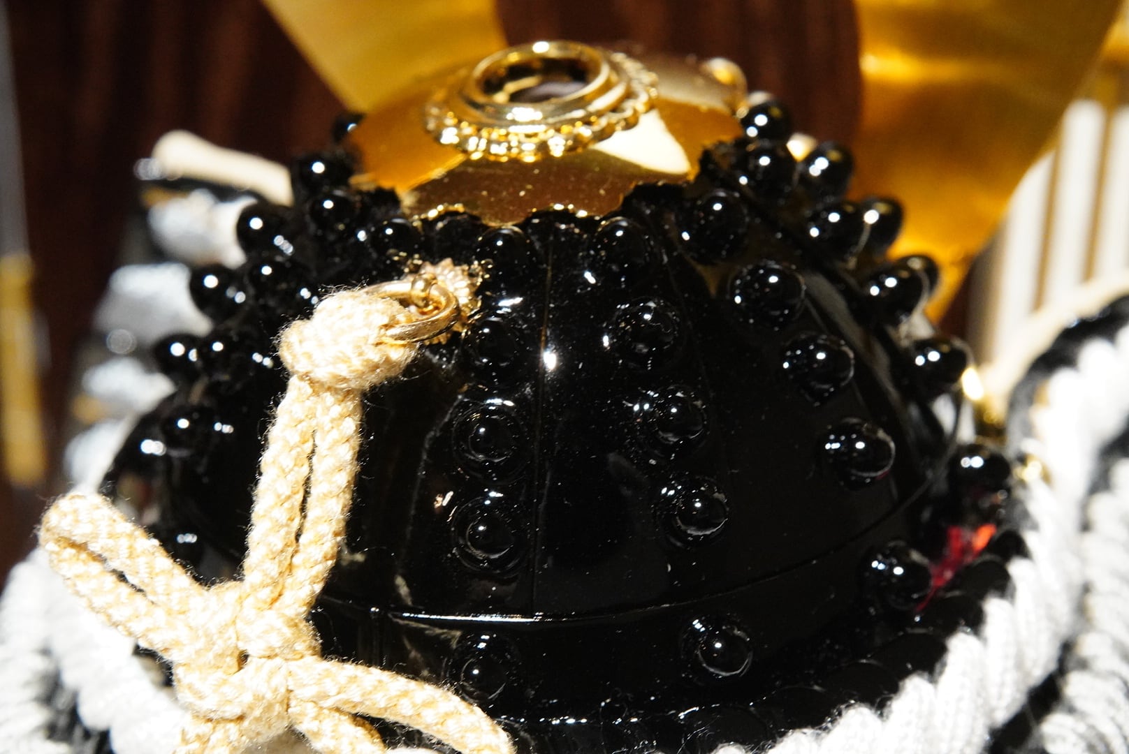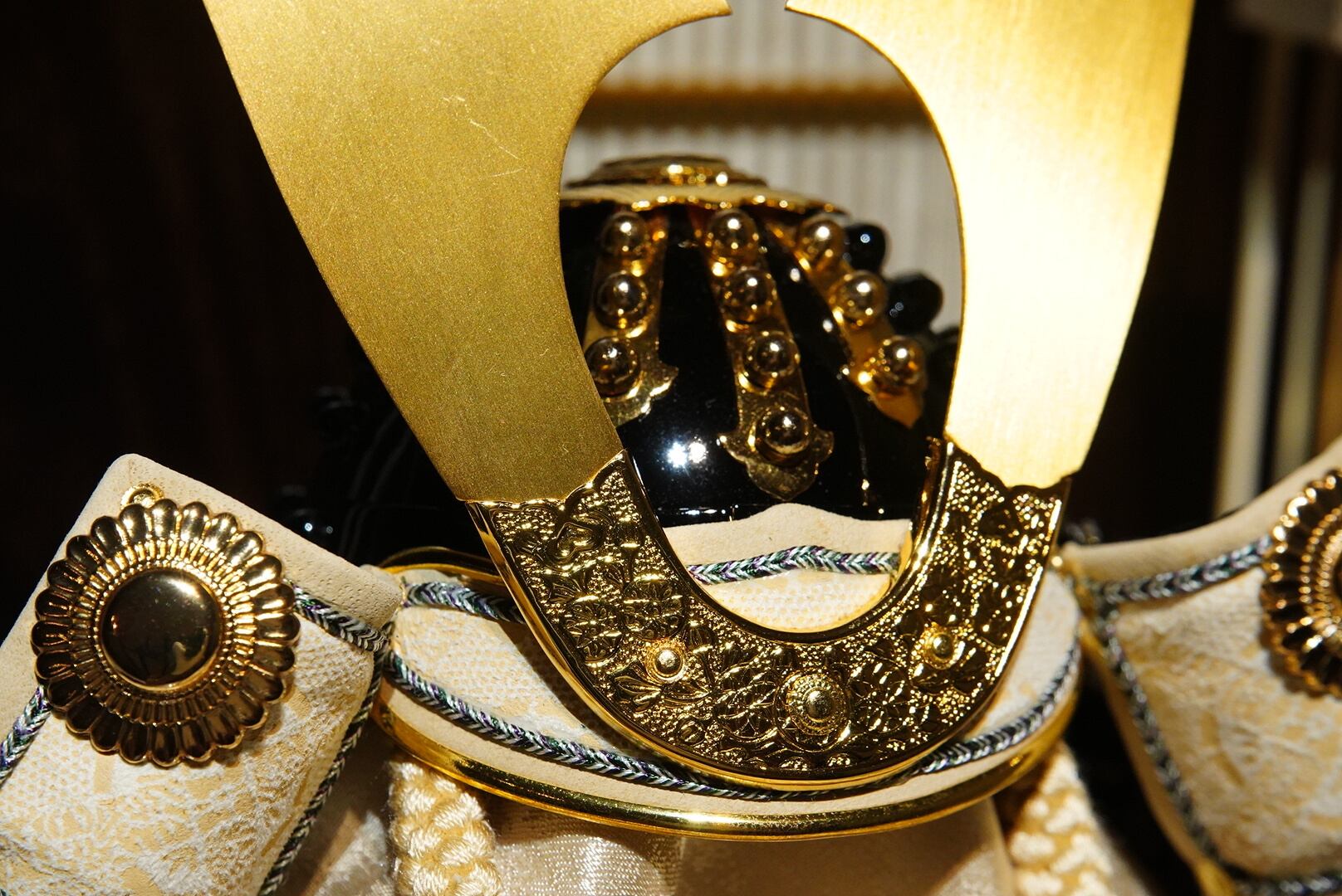 温かな光が兜の金具や正絹の質感を美しく引き立て、落ち着いた趣ある空間を演出します。