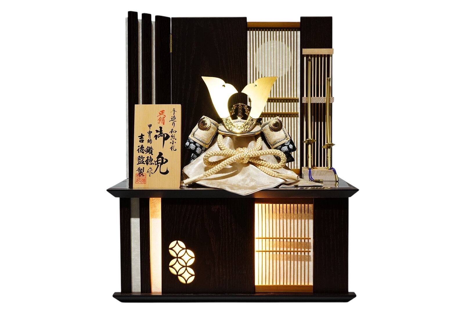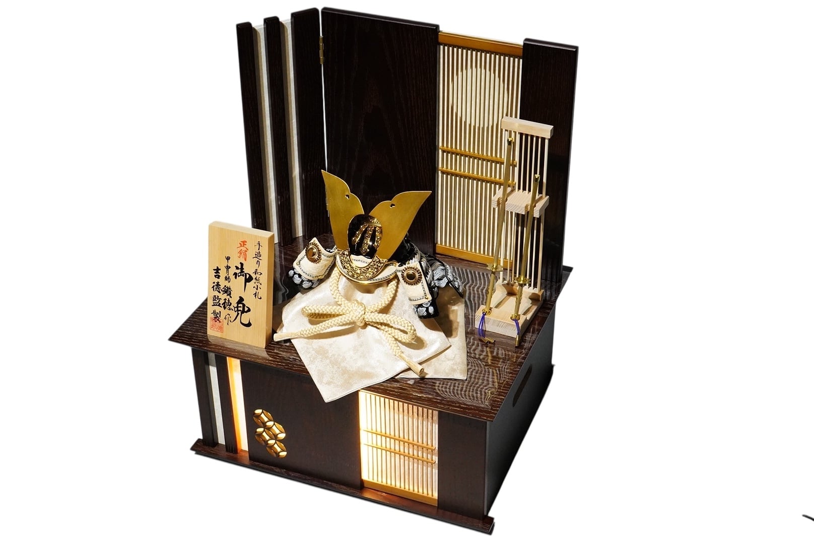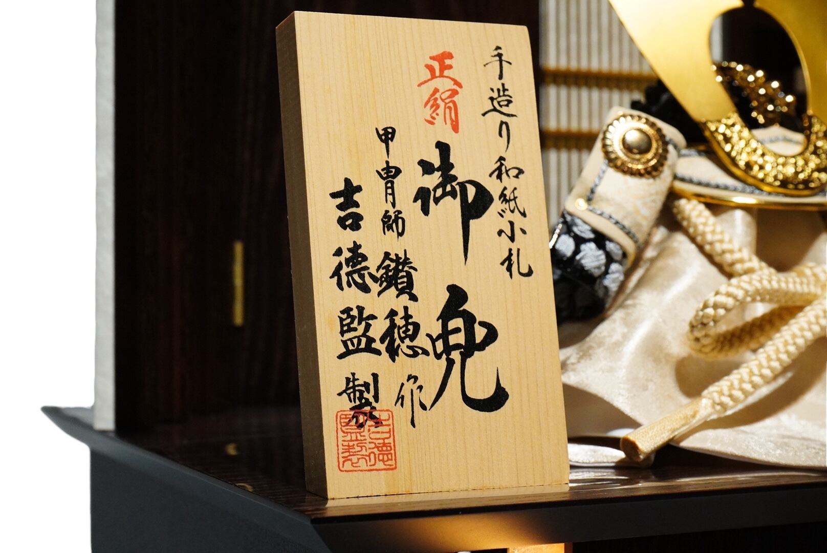 吉徳大光より、甲冑師・鑽穂(さんすい)が手がけた格調高い正絹御兜収納飾りです。