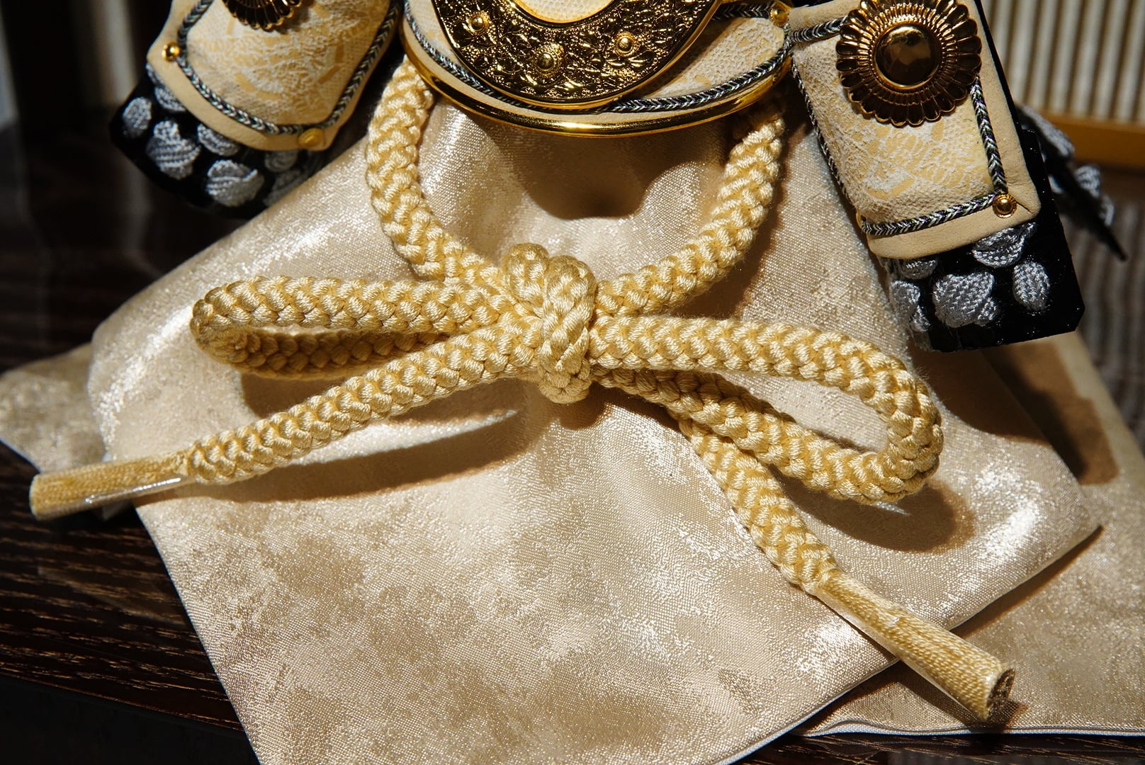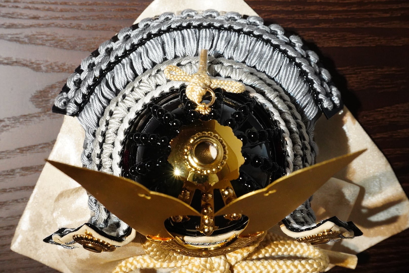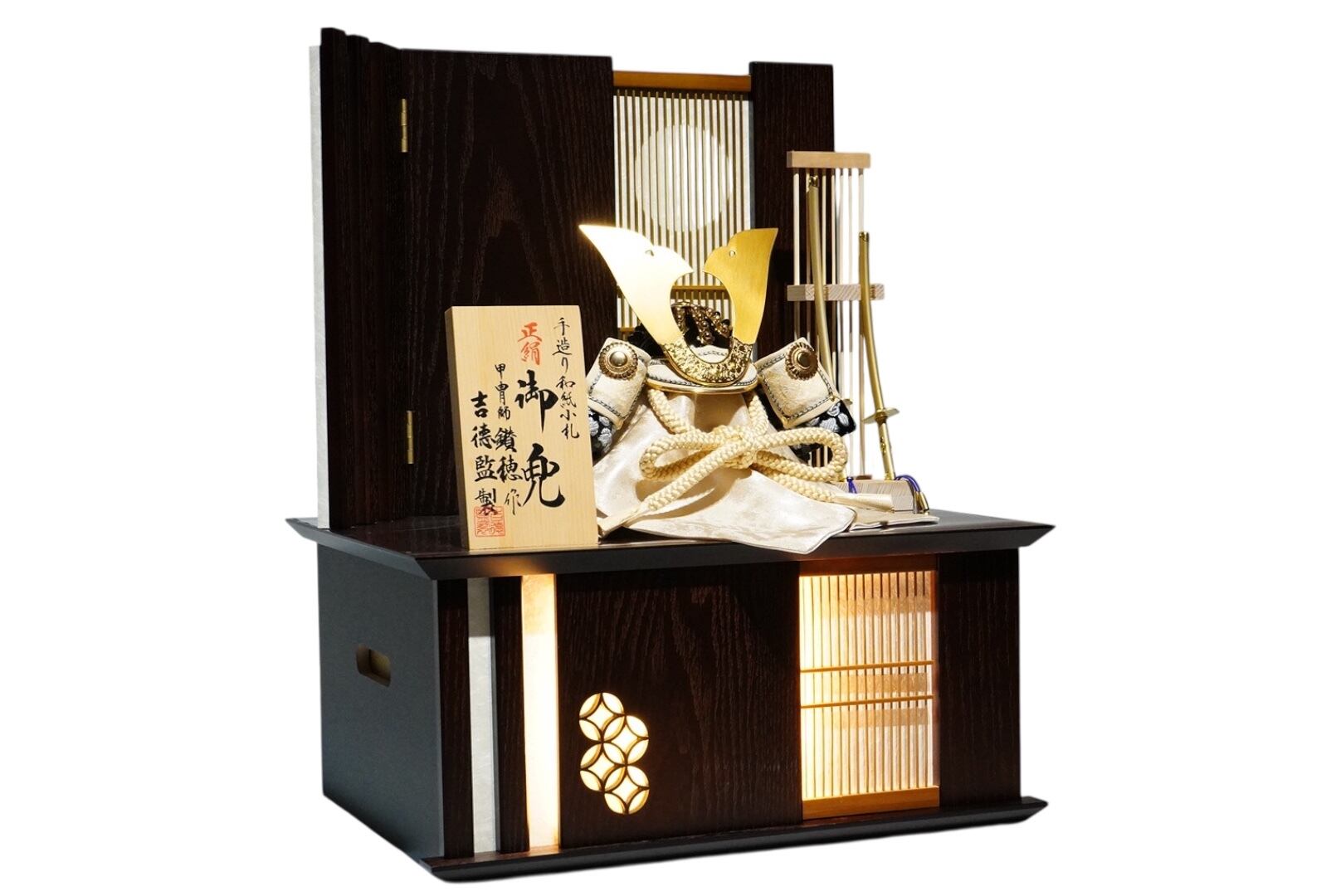 吉徳大光より、甲冑師・鑽穂(さんすい)が手がけた格調高い正絹御兜収納飾りです。