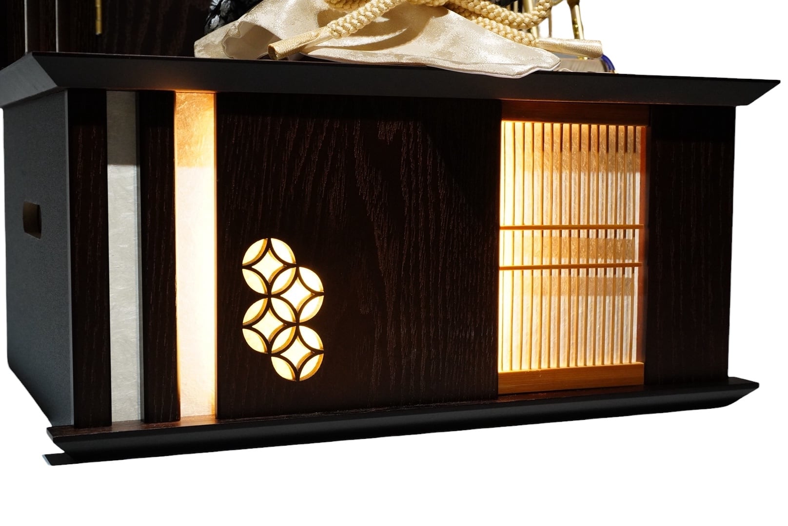 台の内部にはLEDが備えられており、灯りをともすことでやわらかな光が広がり、飾り全体を上品に照らし出します。