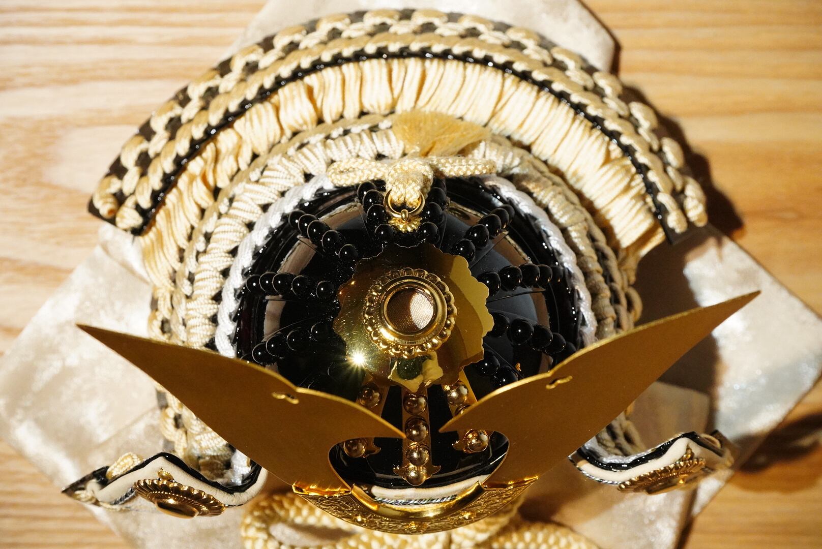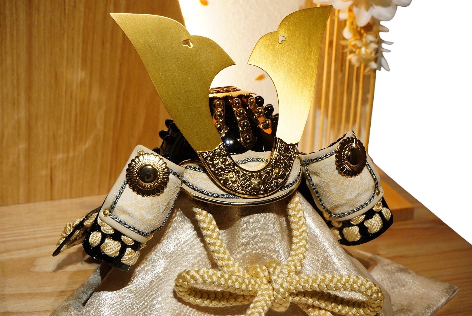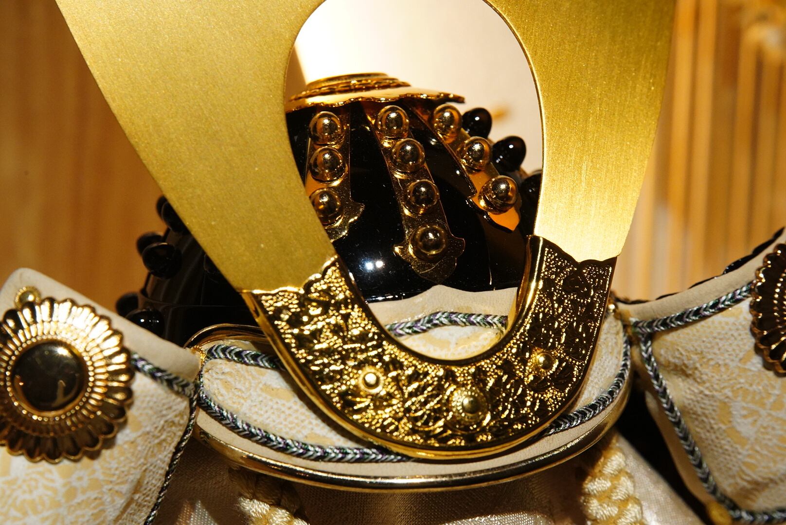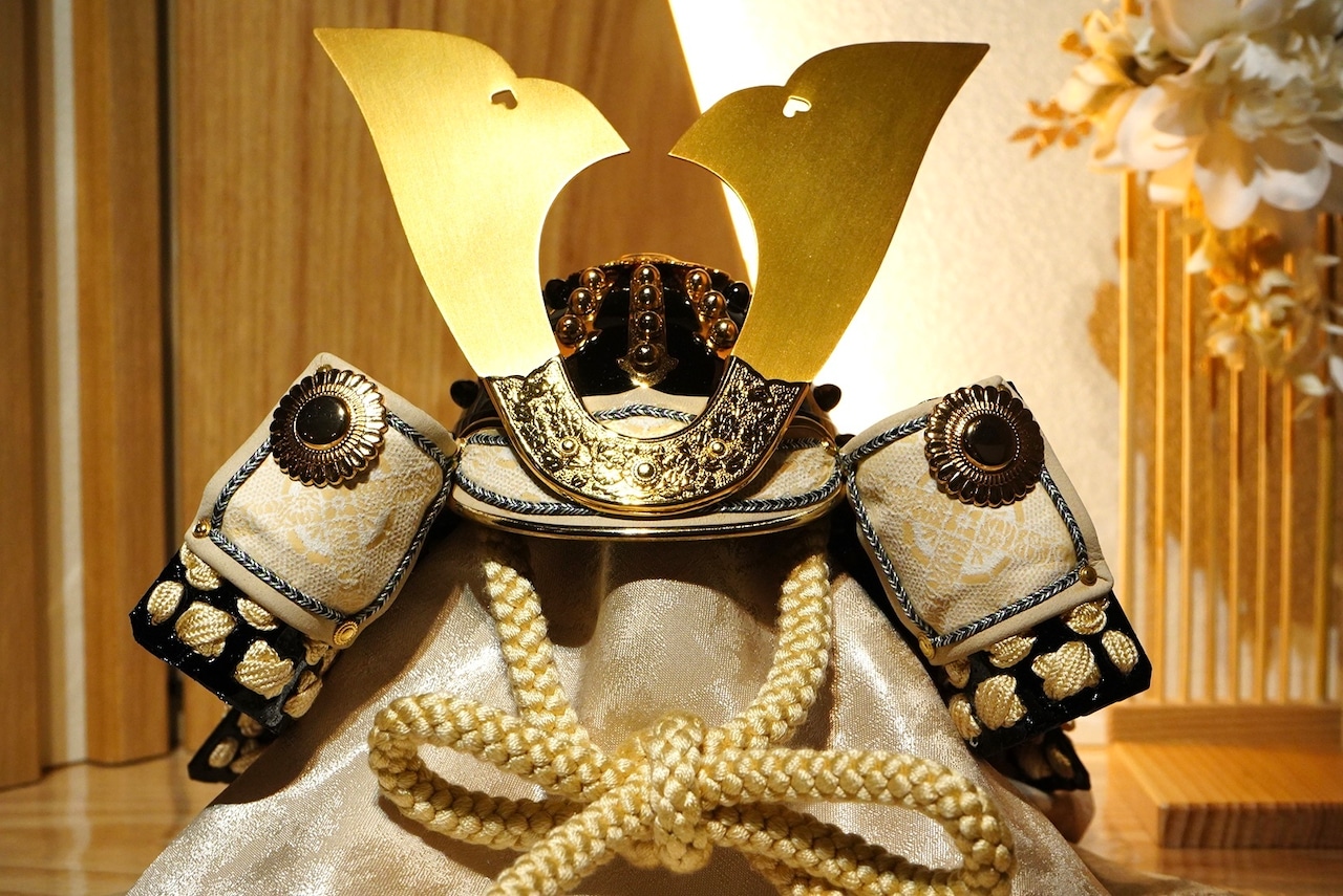 兜はやわらかな生成りの色合いを基調にまとめられ、金色に輝く鍬形が美しく広がり、気品ある存在感を放ちます。