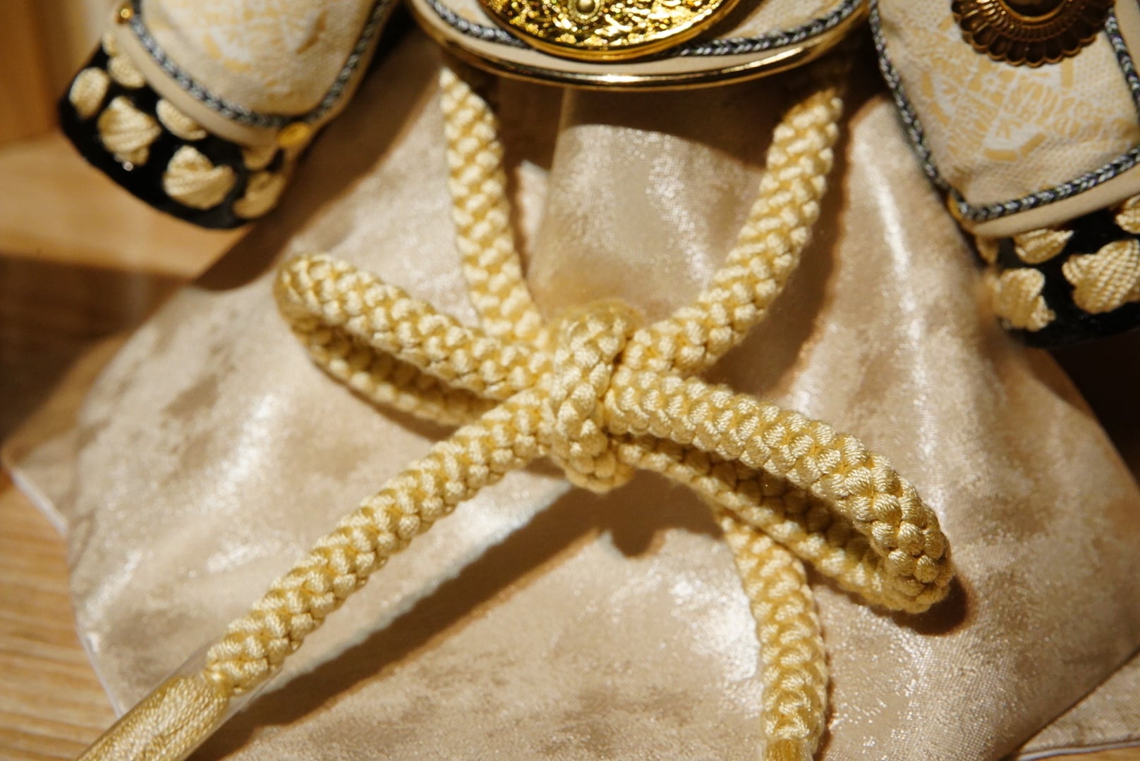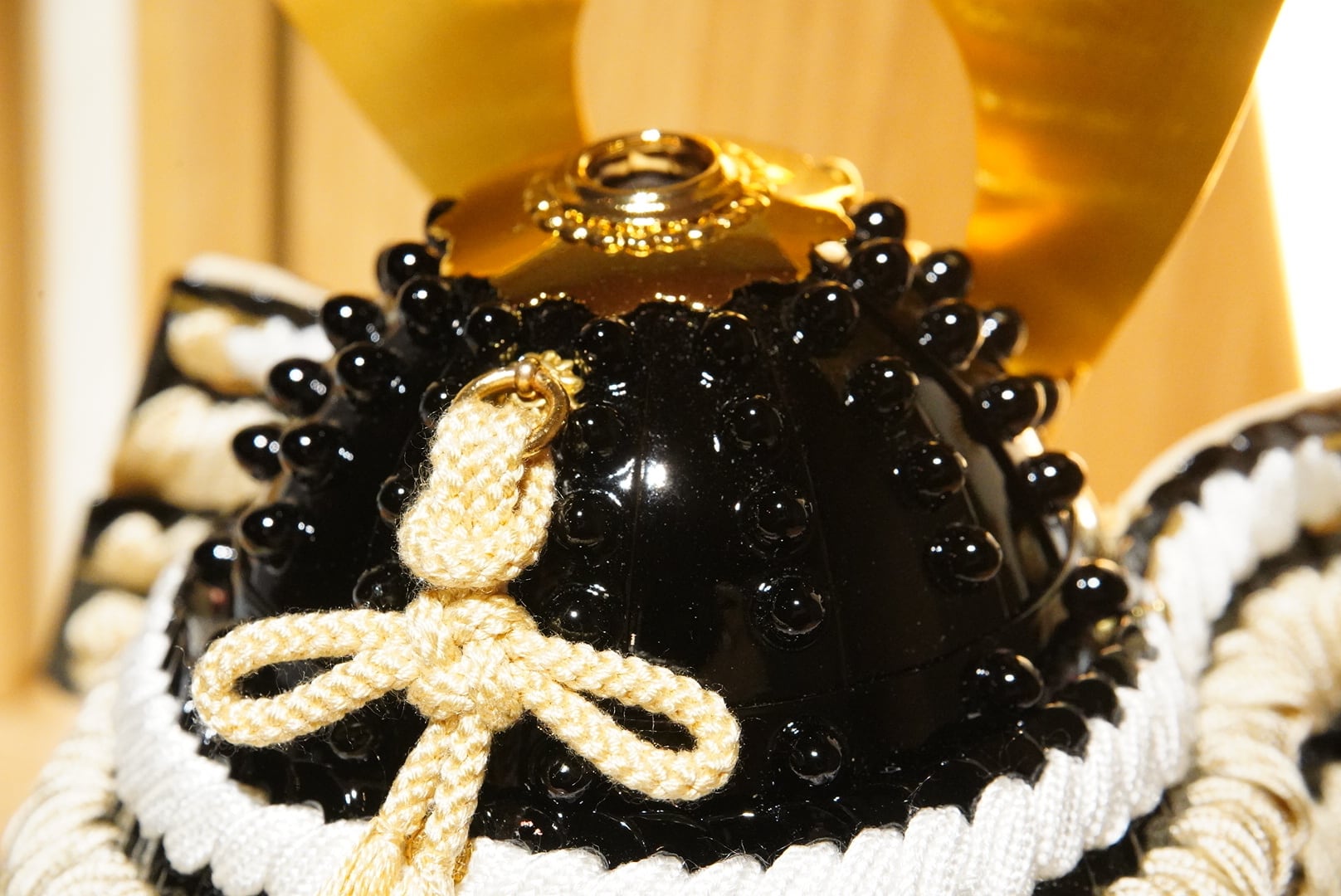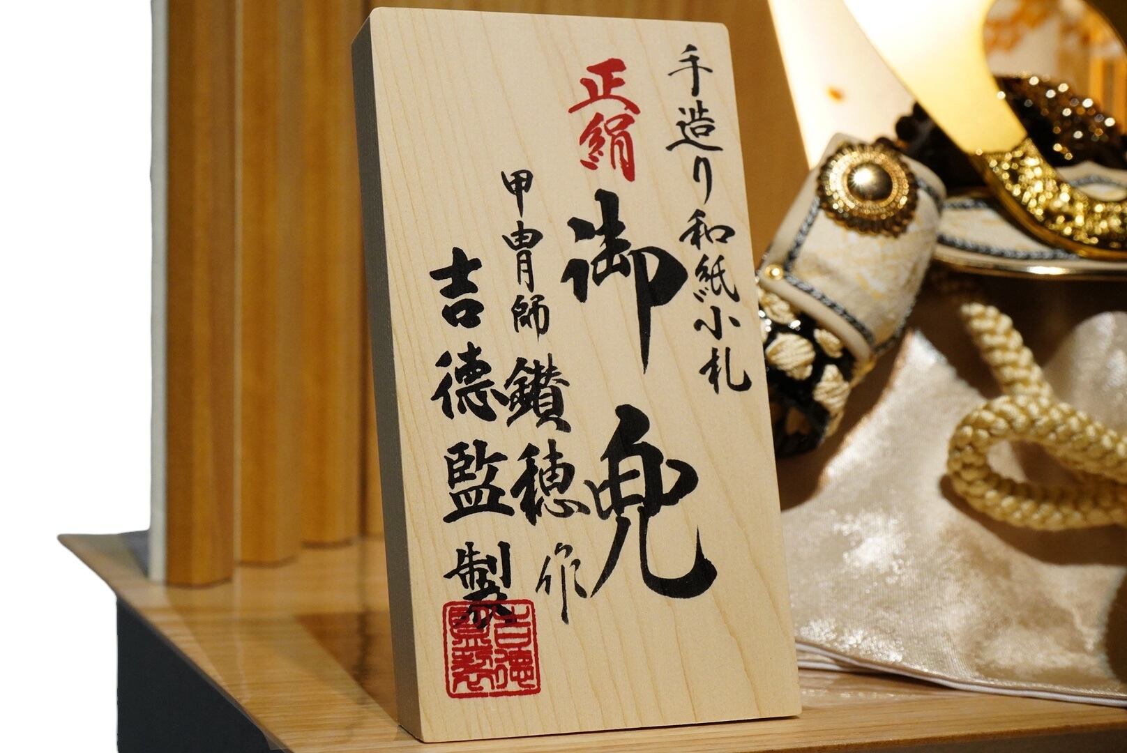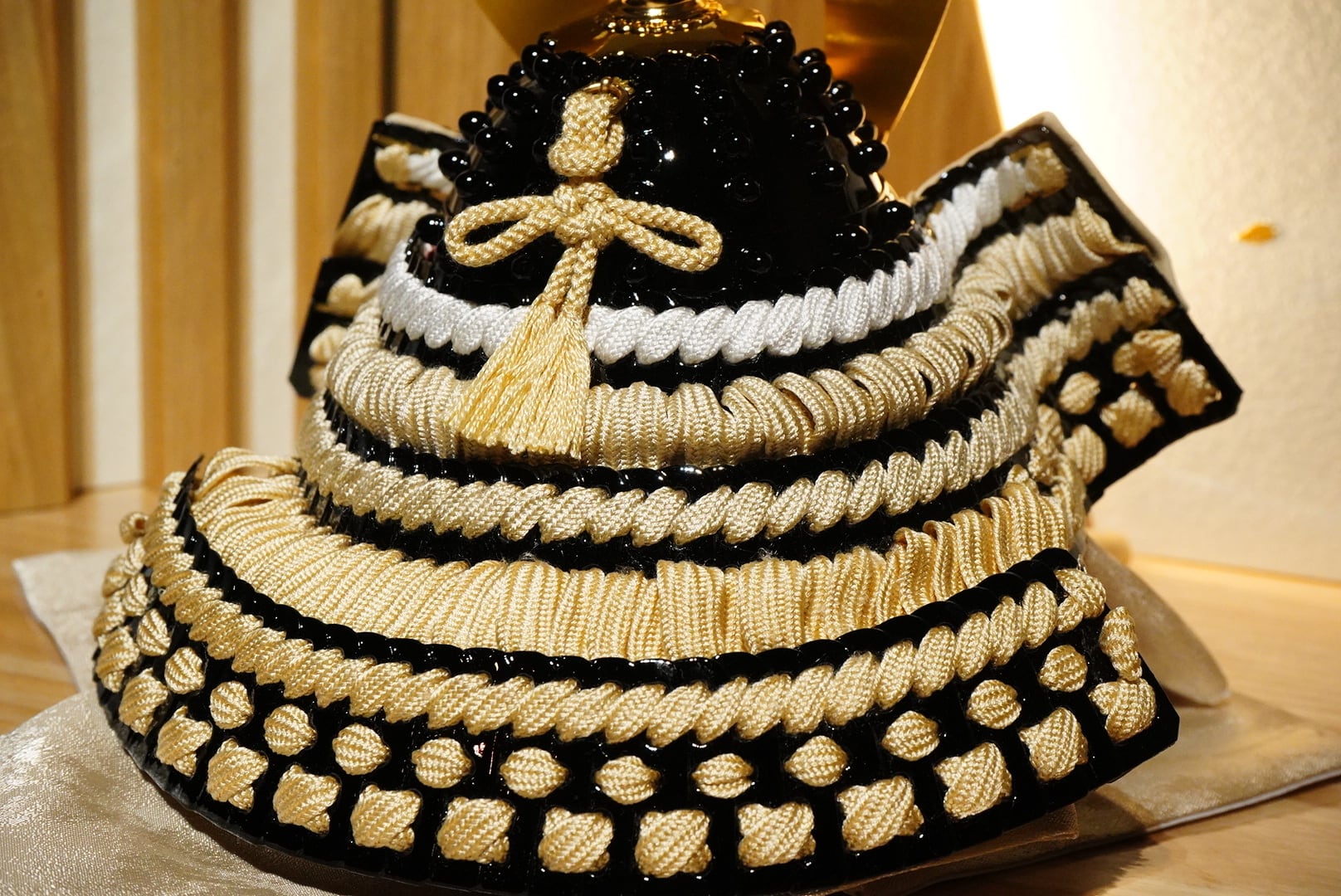 兜はやわらかな生成りの色合いを基調にまとめられ、金色に輝く鍬形が美しく広がり、気品ある存在感を放ちます。