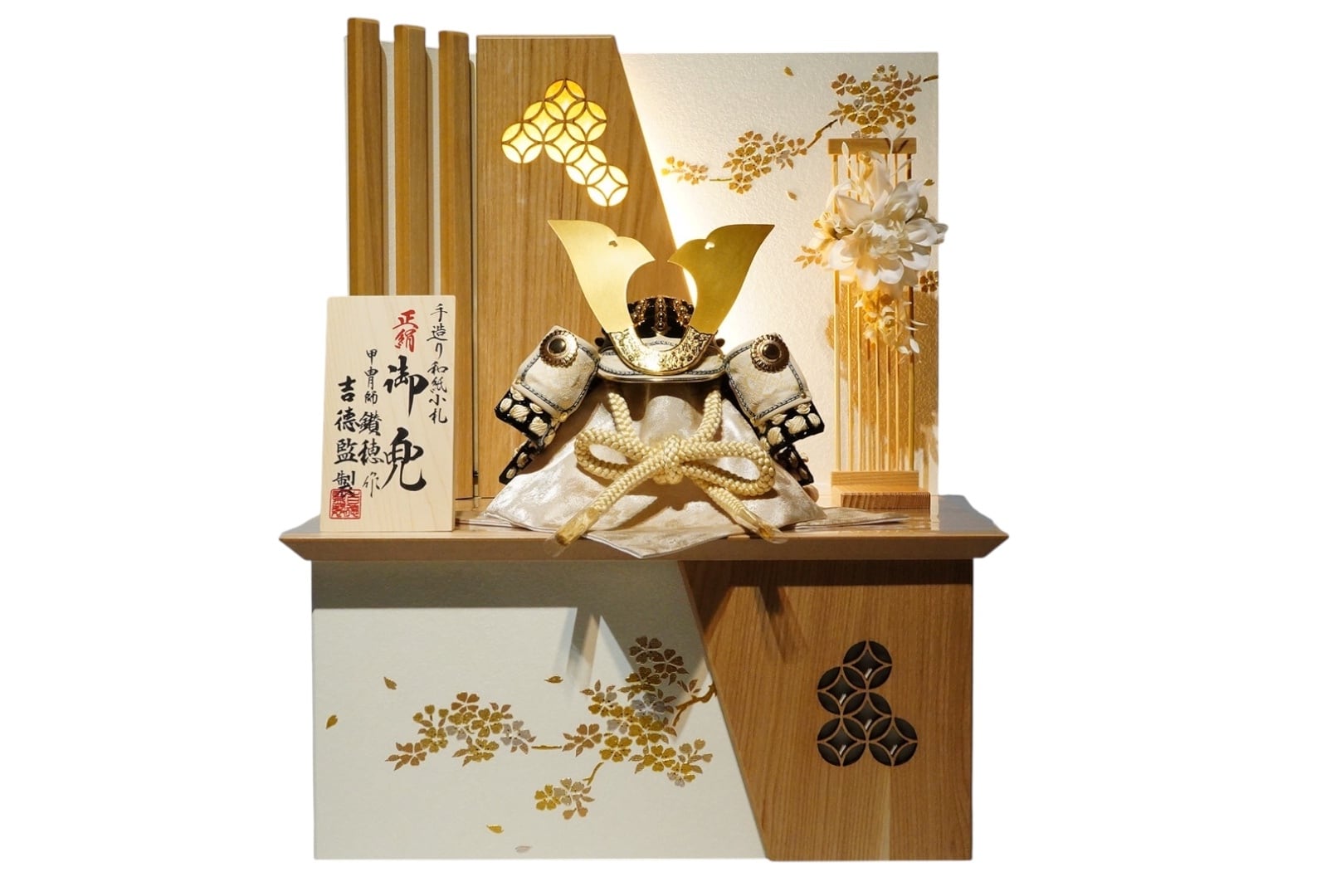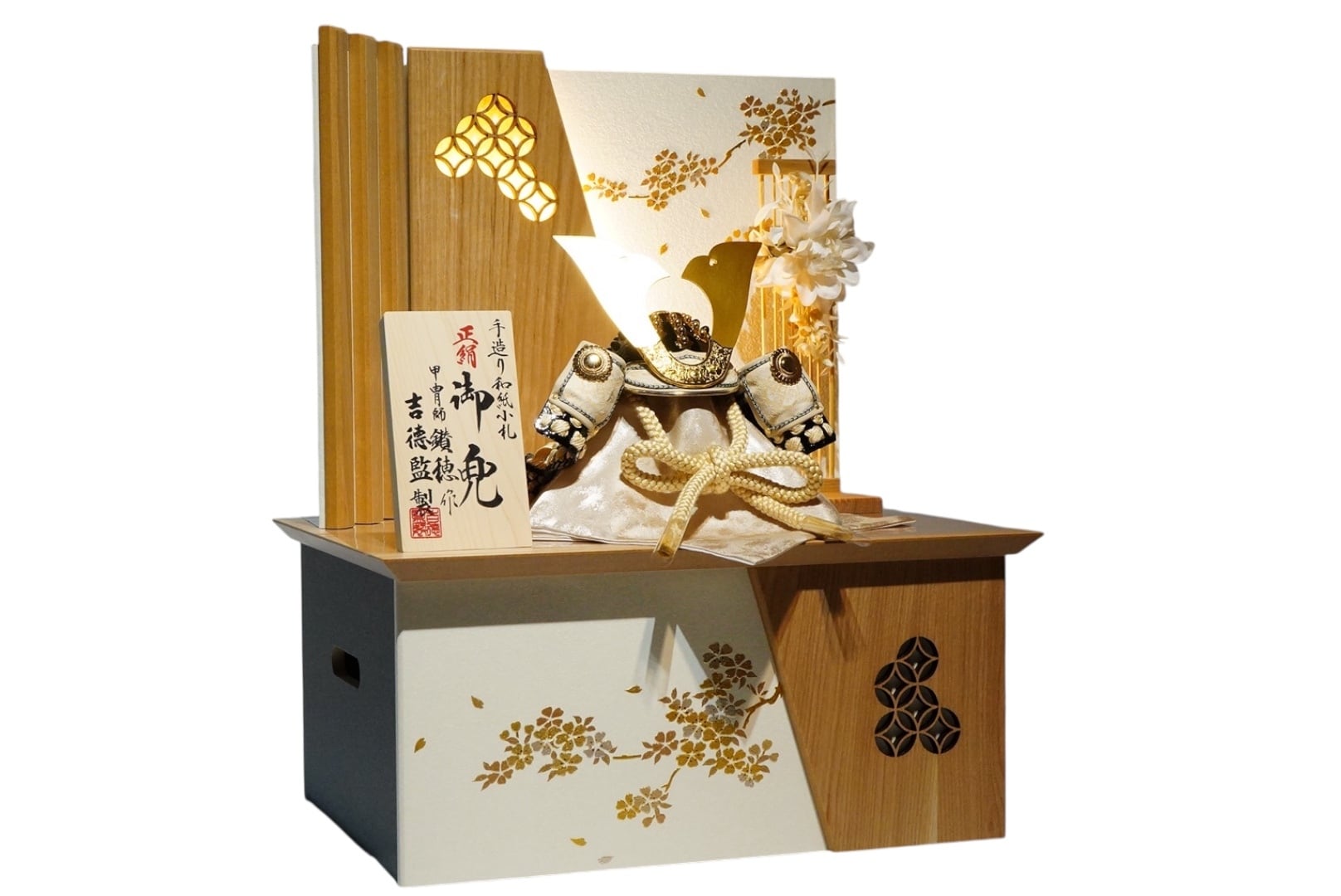 さらに屏風にはLEDの灯りが仕込まれており、やわらかな光が兜を優しく照らし、落ち着いた華やぎを添えます。