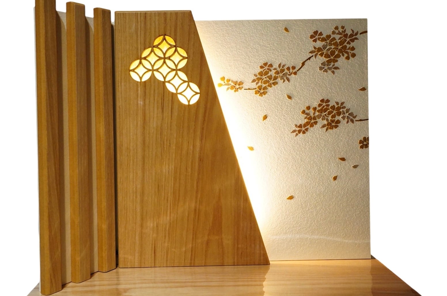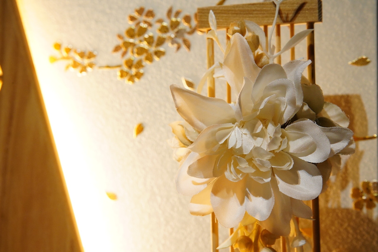 背景の屏風には、桜を思わせる優美な意匠が施され、木目の美しい飾り台とともに温かみのある空間を演出します。