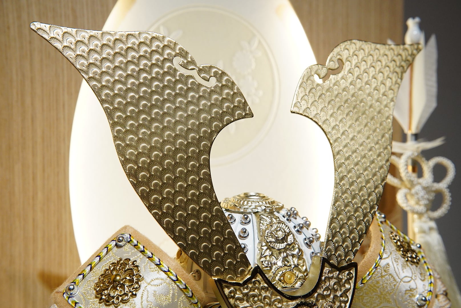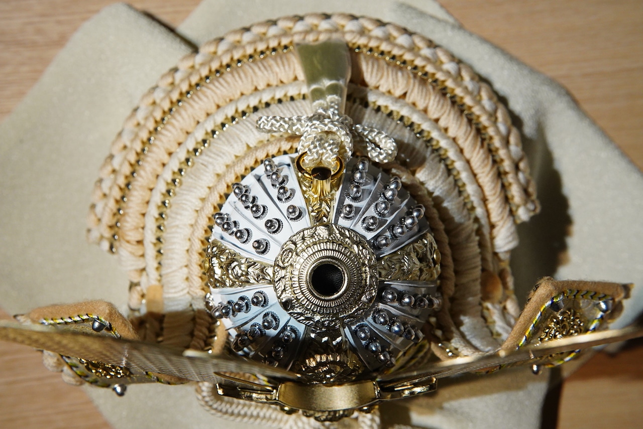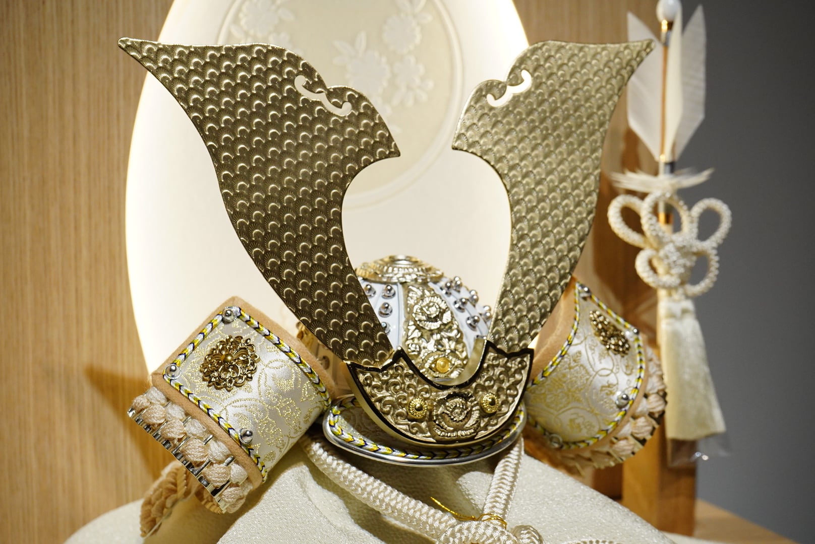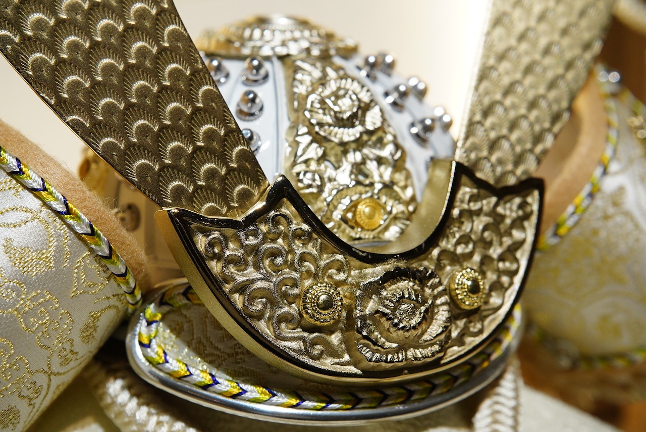 大きく広がる鍬形には繊細な鱗文様が施され、光を受けてやさしく輝きます。金色を基調とした兜は、統一感のある落ち着いた色合いでまとめられ、上品で端正な印象に。白を基調とした袱紗と組紐が、清らかで柔らかな雰囲気を添え、全体に穏やかな気品をもたらします。