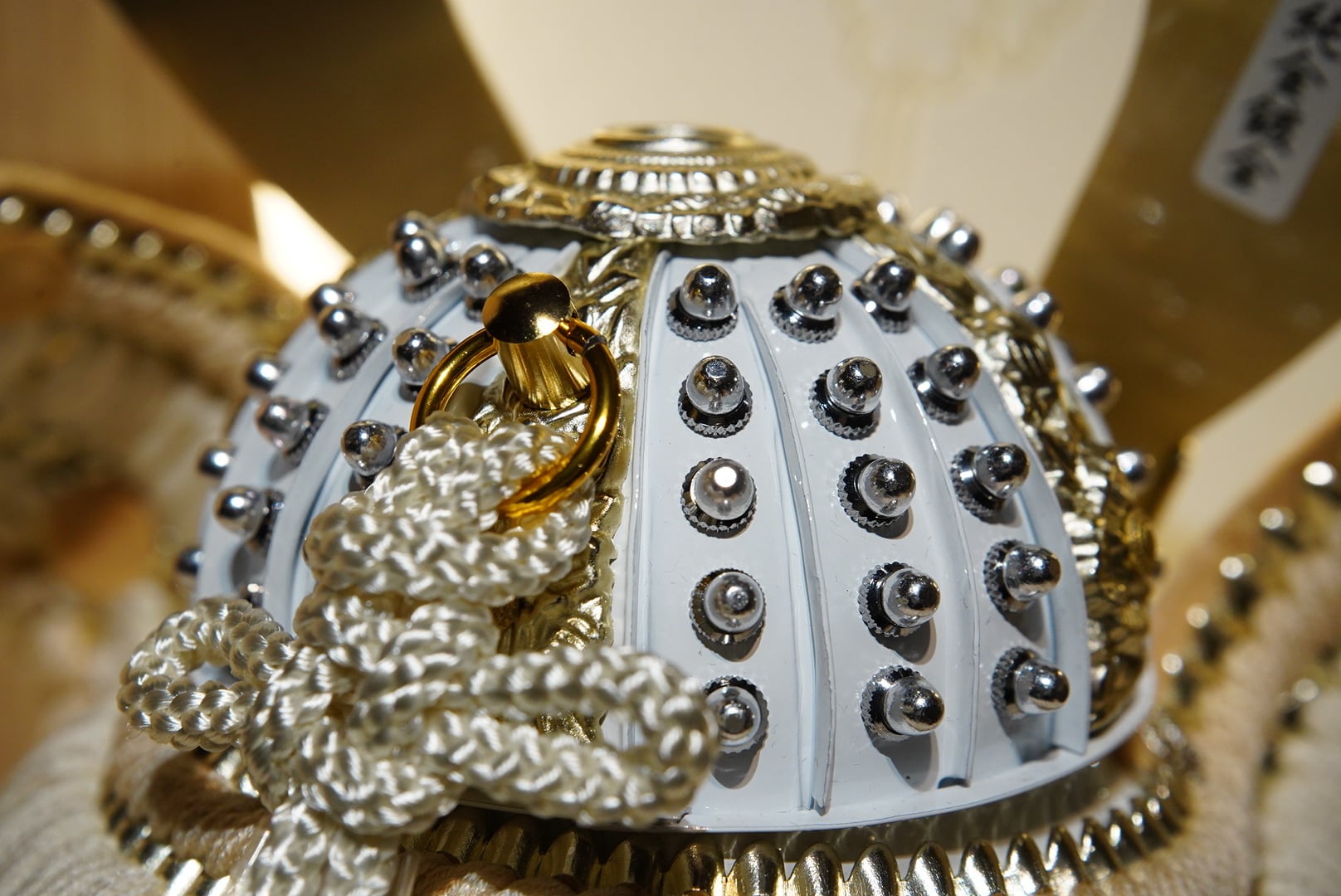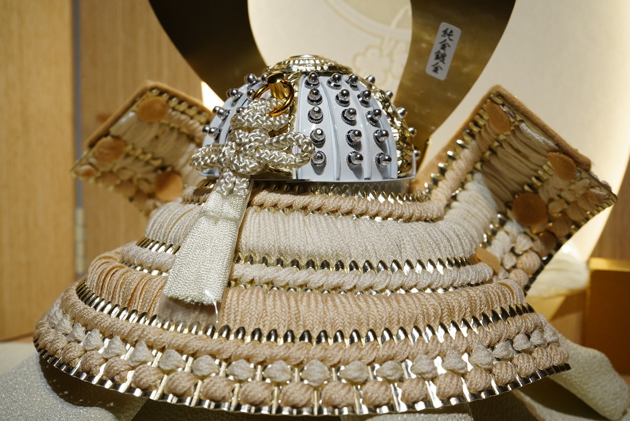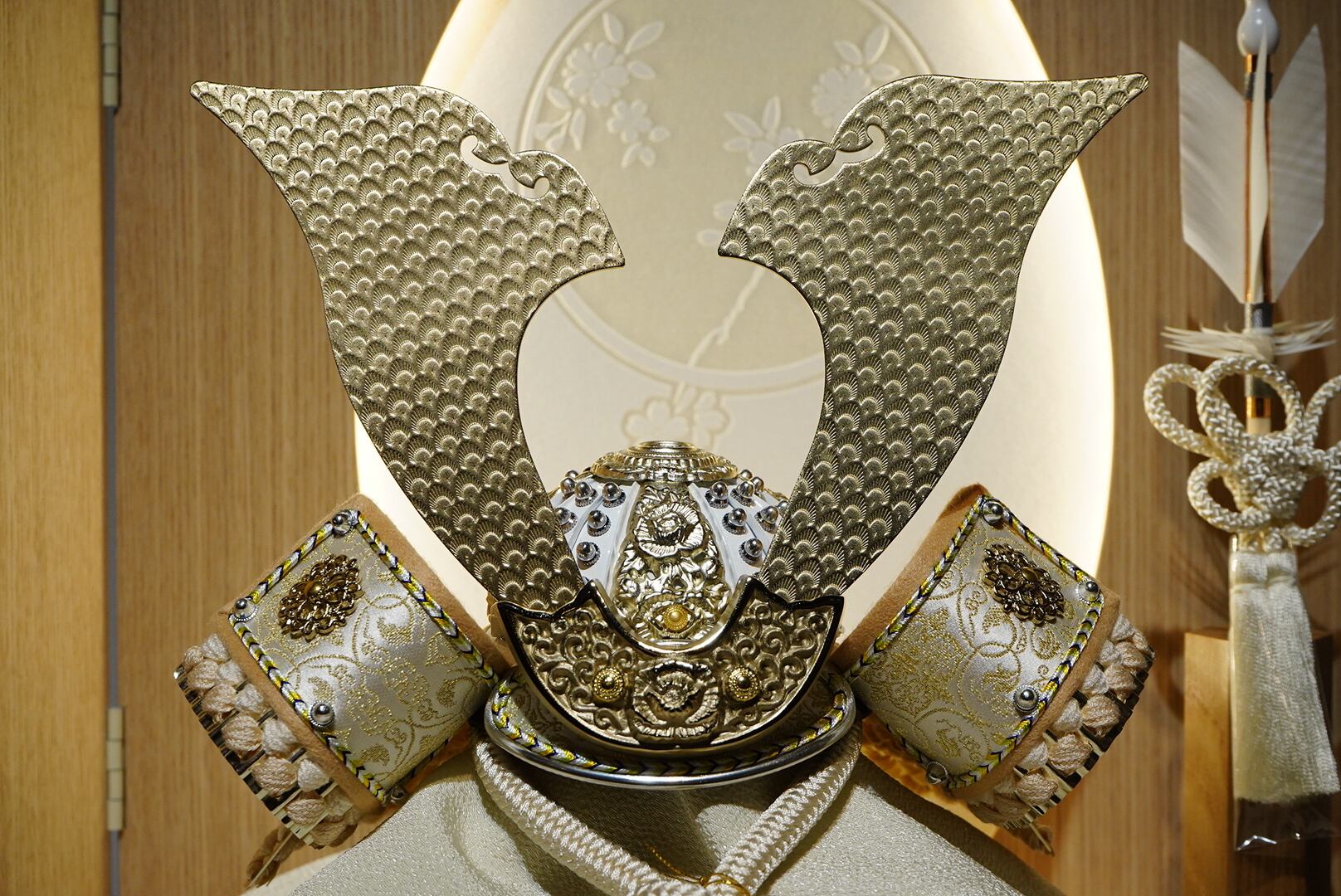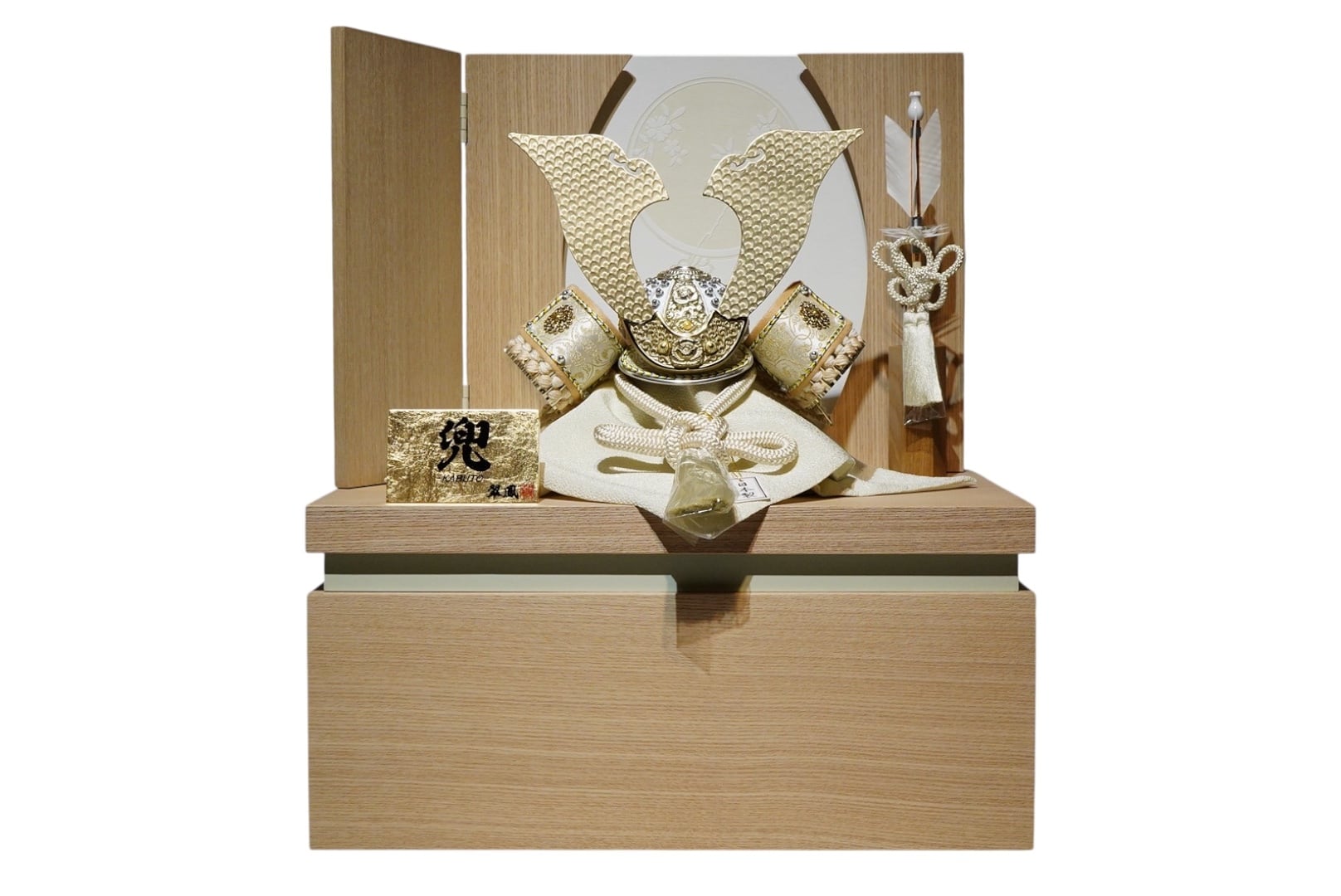 大きく広がる鍬形には繊細な鱗文様が施され、光を受けてやさしく輝きます。金色を基調とした兜は、統一感のある落ち着いた色合いでまとめられ、上品で端正な印象に。白を基調とした袱紗と組紐が、清らかで柔らかな雰囲気を添え、全体に穏やかな気品をもたらします。