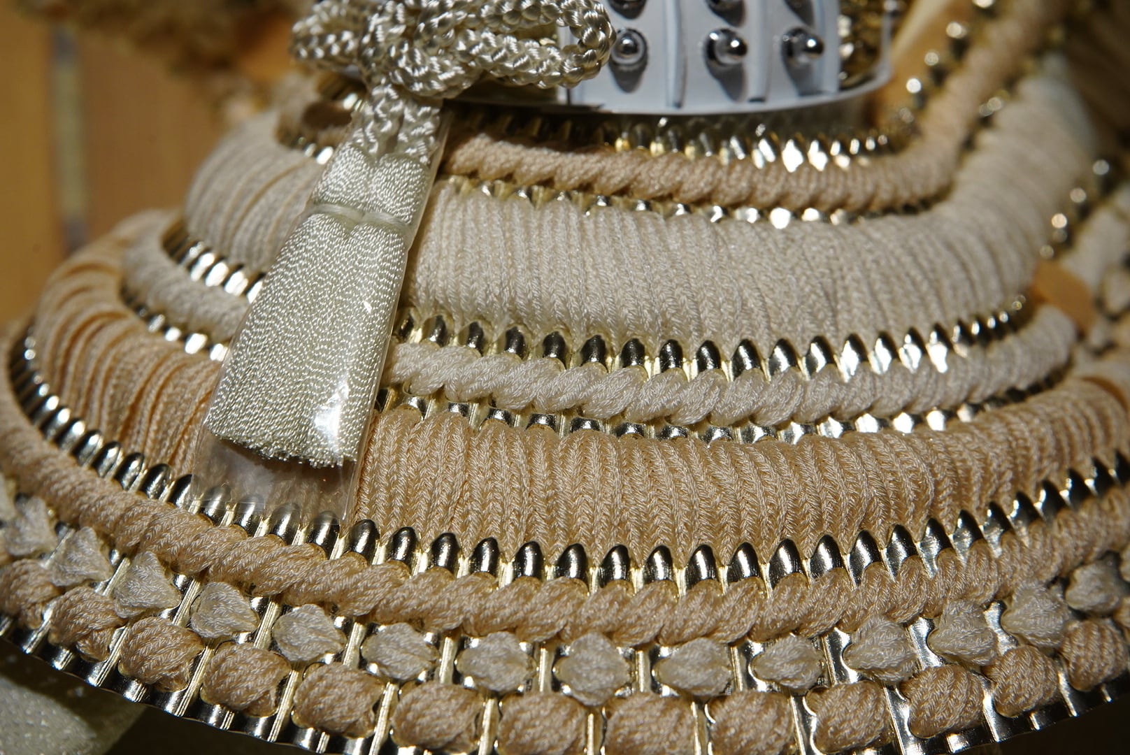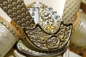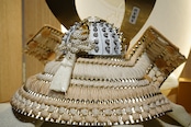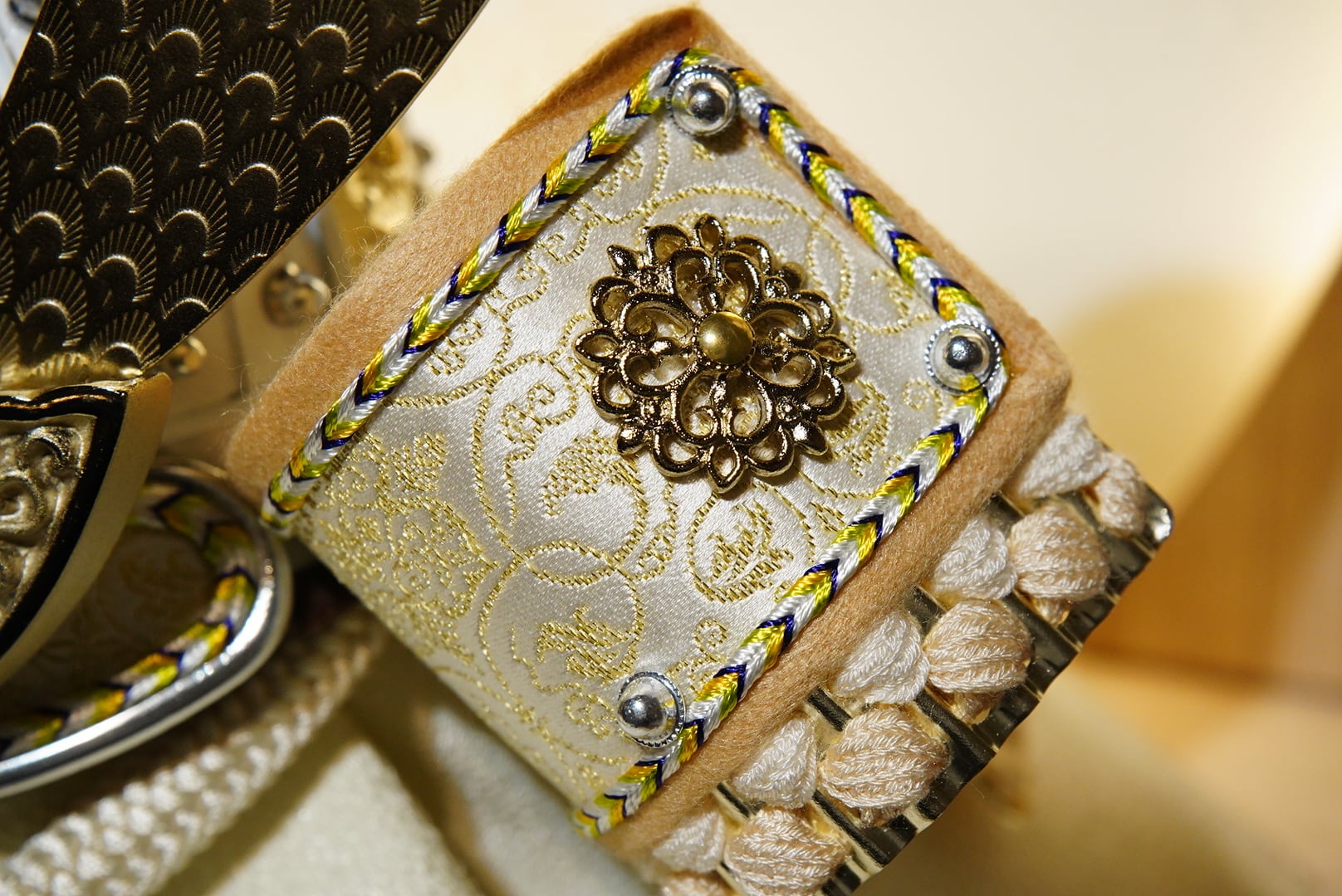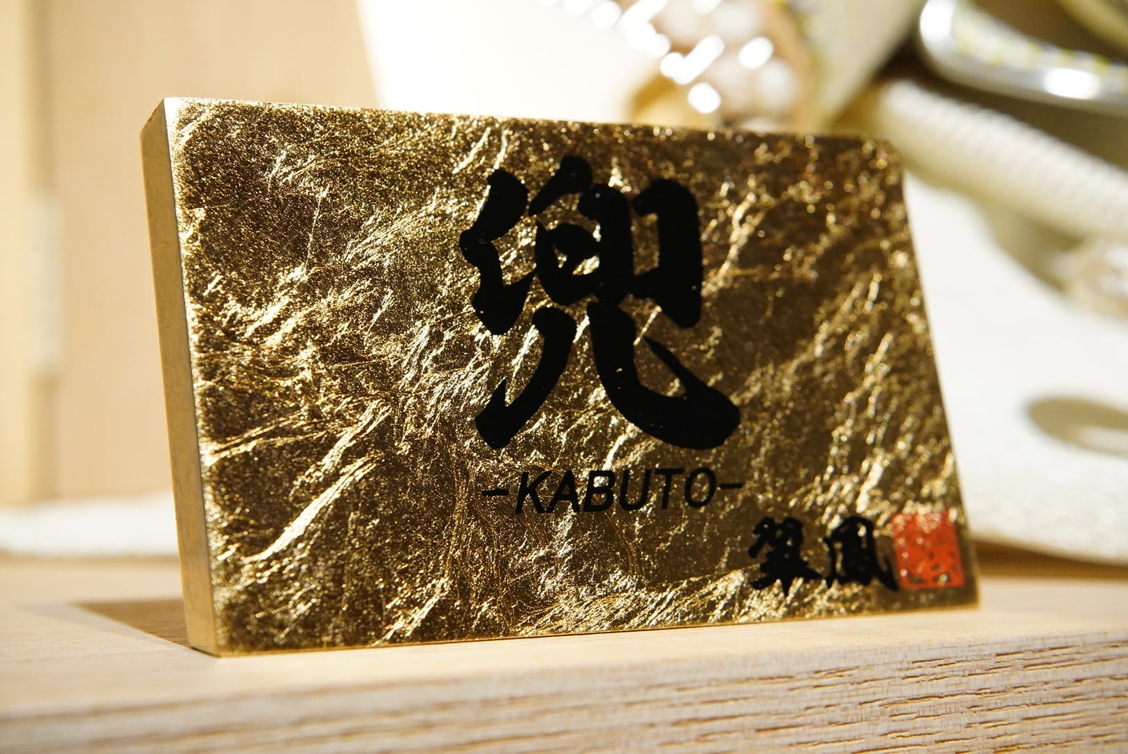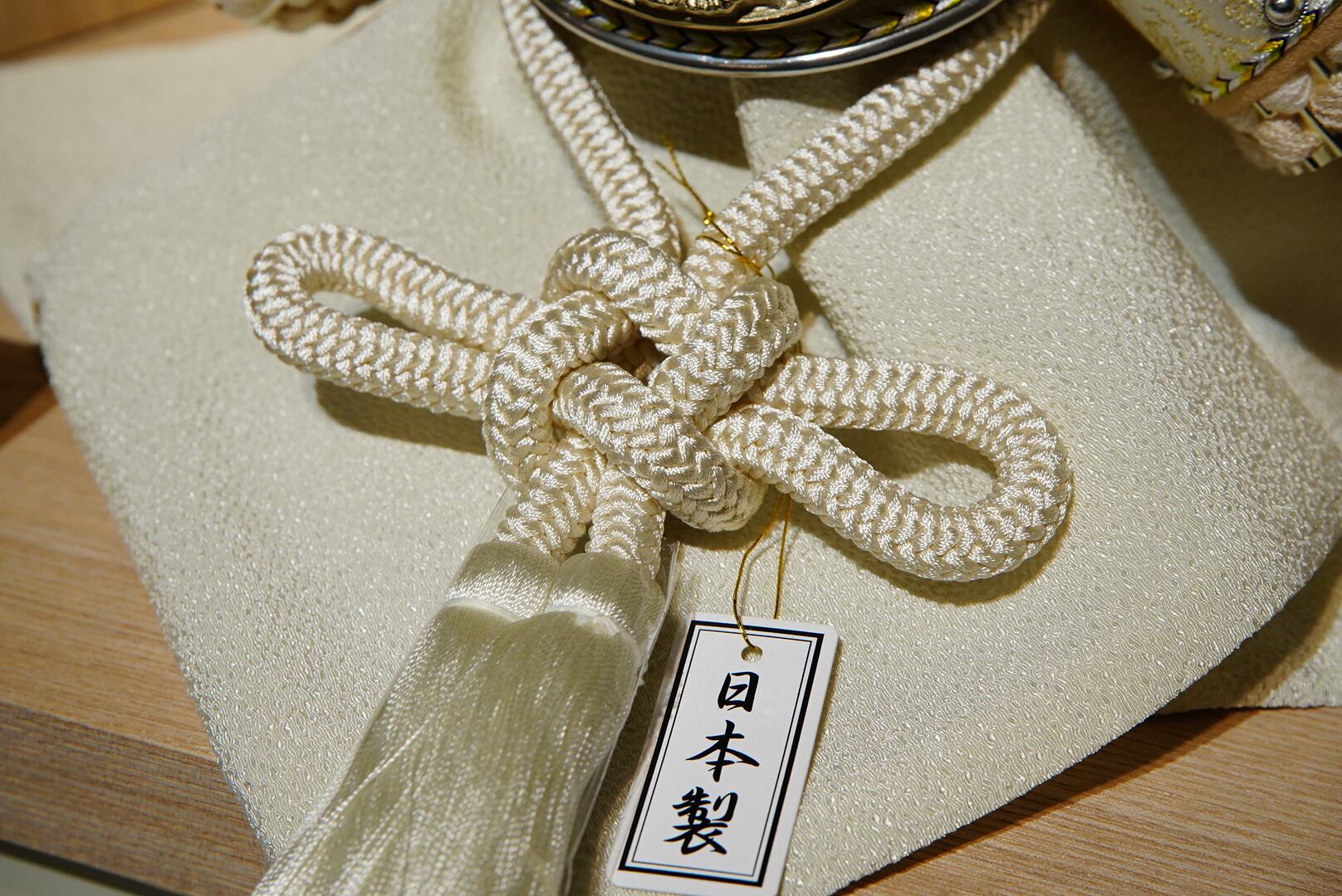大きく広がる鍬形には繊細な鱗文様が施され、光を受けてやさしく輝きます。金色を基調とした兜は、統一感のある落ち着いた色合いでまとめられ、上品で端正な印象に。白を基調とした袱紗と組紐が、清らかで柔らかな雰囲気を添え、全体に穏やかな気品をもたらします。