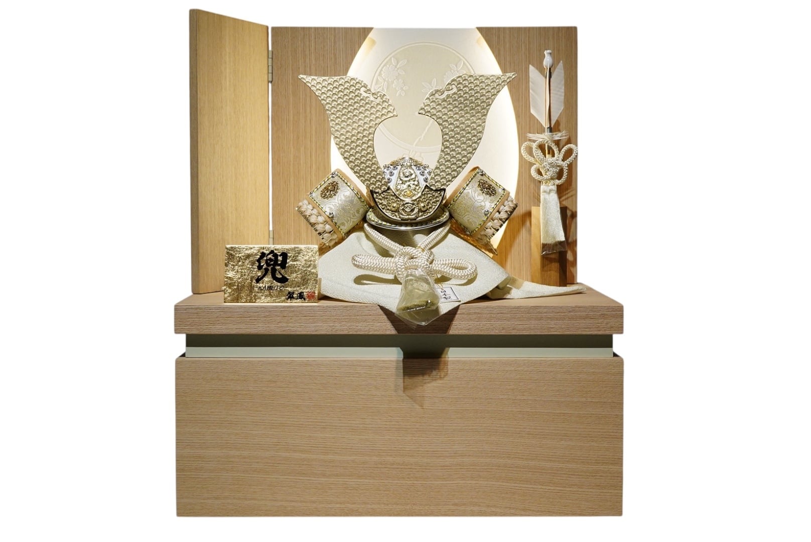 また、飾り台の下部は収納箱として設計されており、兜一式をすっきりと収めることが可能。飾る美しさとしまう機能性を兼ね備え、現代の住まいにも心地よく調和します。