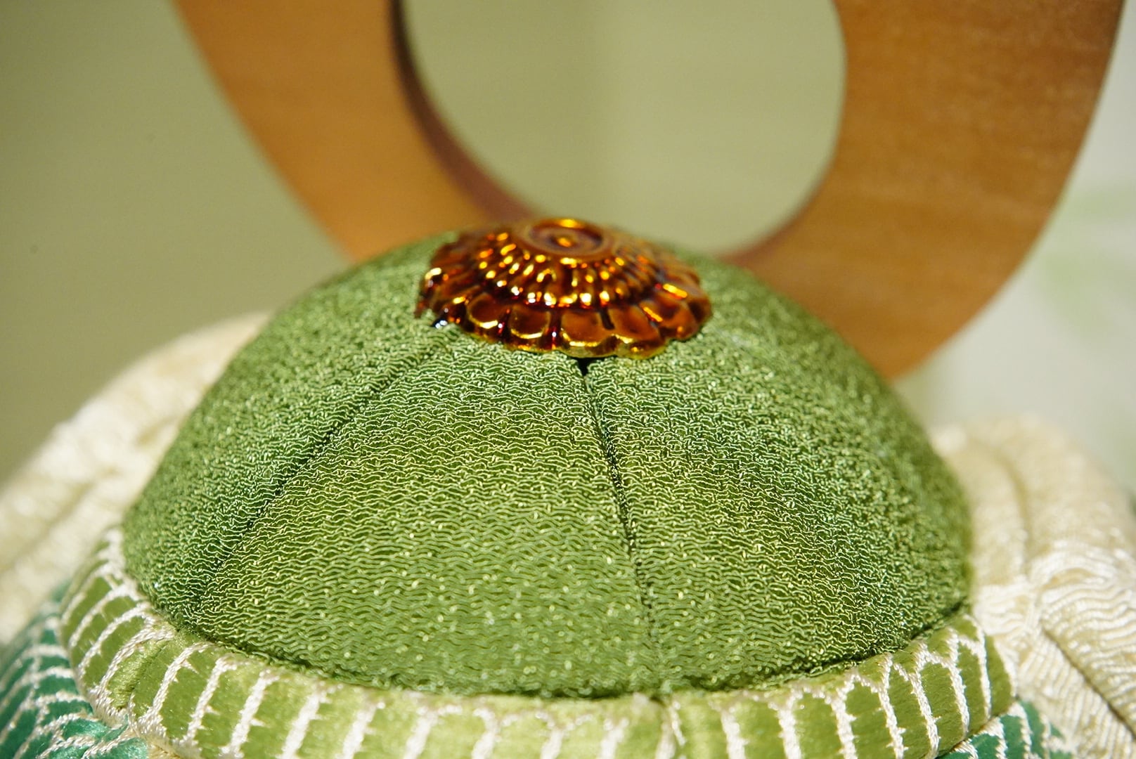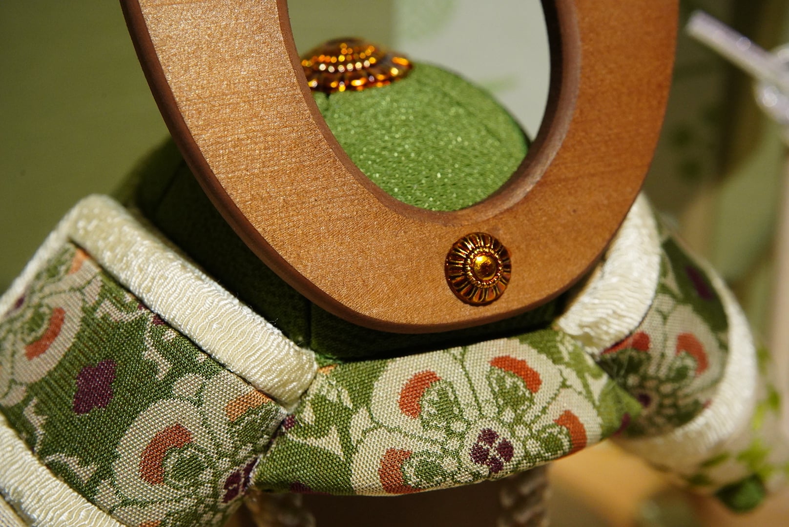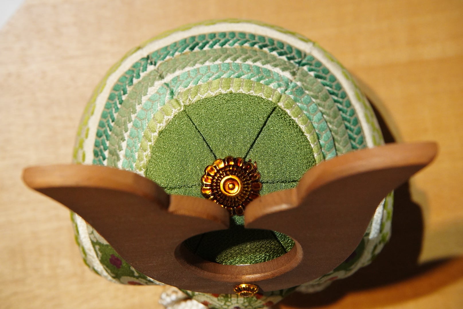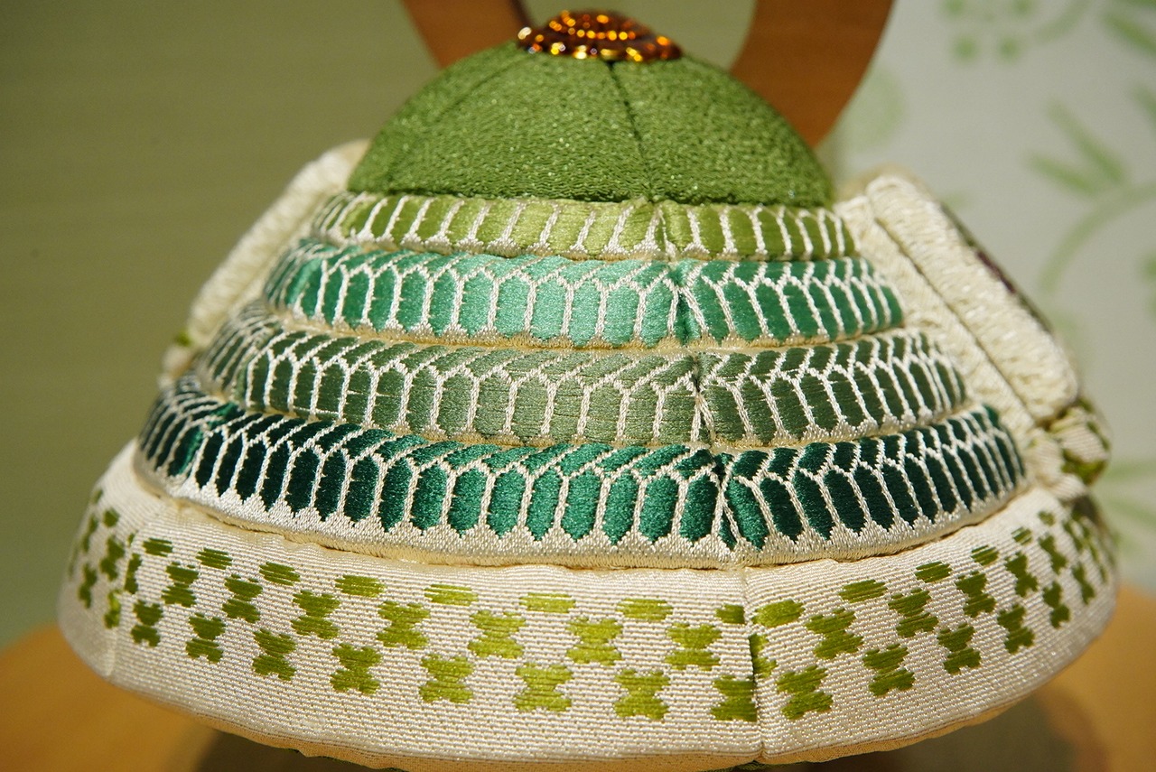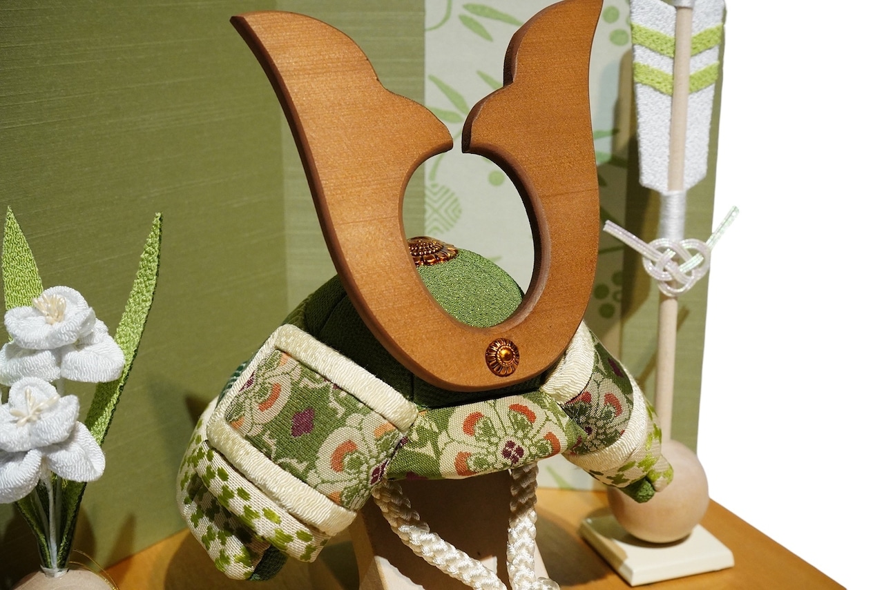 伝統的な木目込みの技法により、一つひとつ丁寧に仕立てられた兜は、布地の温もりと繊細な表情を感じさせます。