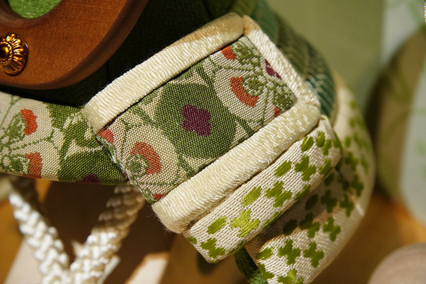 萌葱色を基調とした吹き返しには、可憐な文様が施され、自然を思わせる落ち着いた彩りが印象的です。