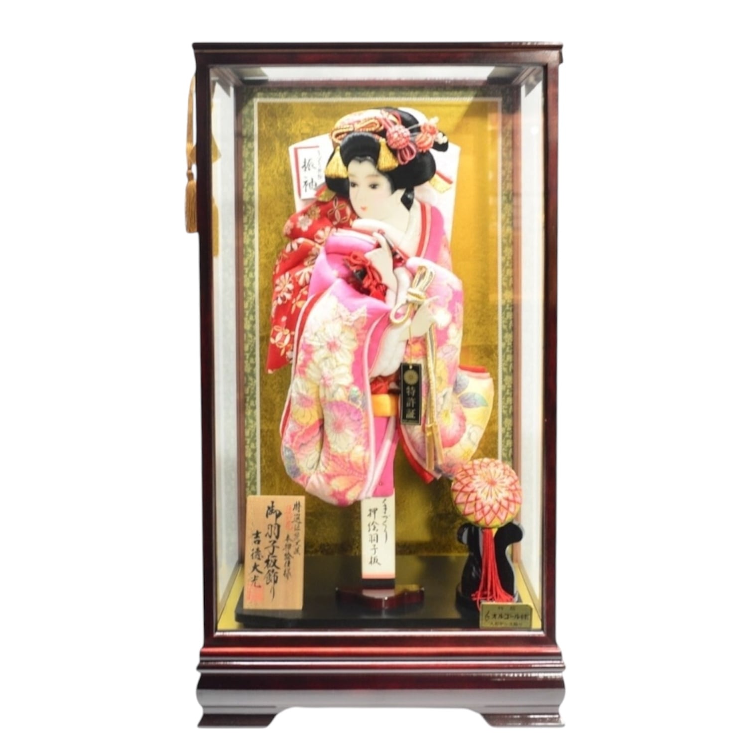 落ち着いた木枠と金彩が彩る、優美な羽子板飾り。