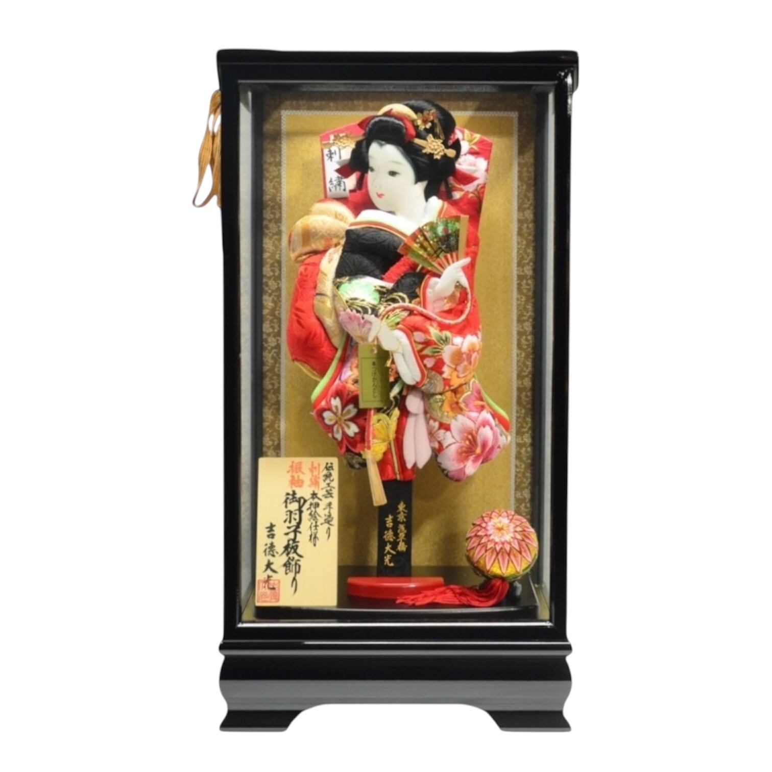鮮やかな赤の振袖に咲き誇る花々が華やかに映える、優美な羽子板飾りです。