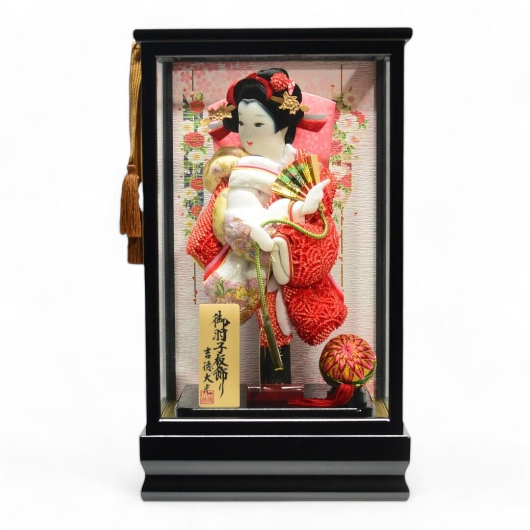 鮮やかな朱色を基調とした豪華な衣裳が目を引き、手にした扇と鞠(まり)飾りが、雅な美しさを際立たせます。