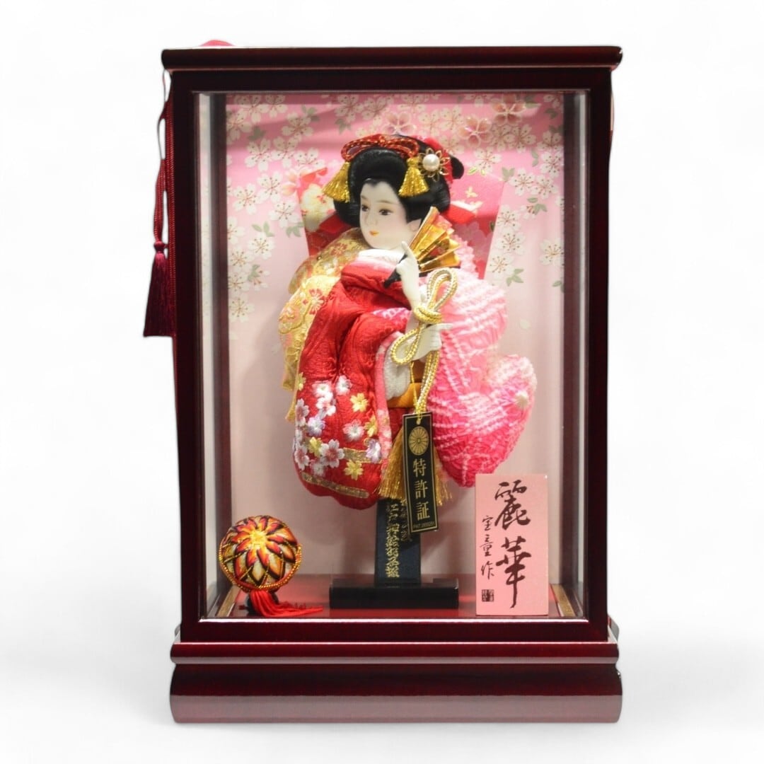 鮮やかな赤とピンクを基調とした華やかな衣裳に、手にした扇と鞠(まり)飾りが、雅な美しさを際立たせます。