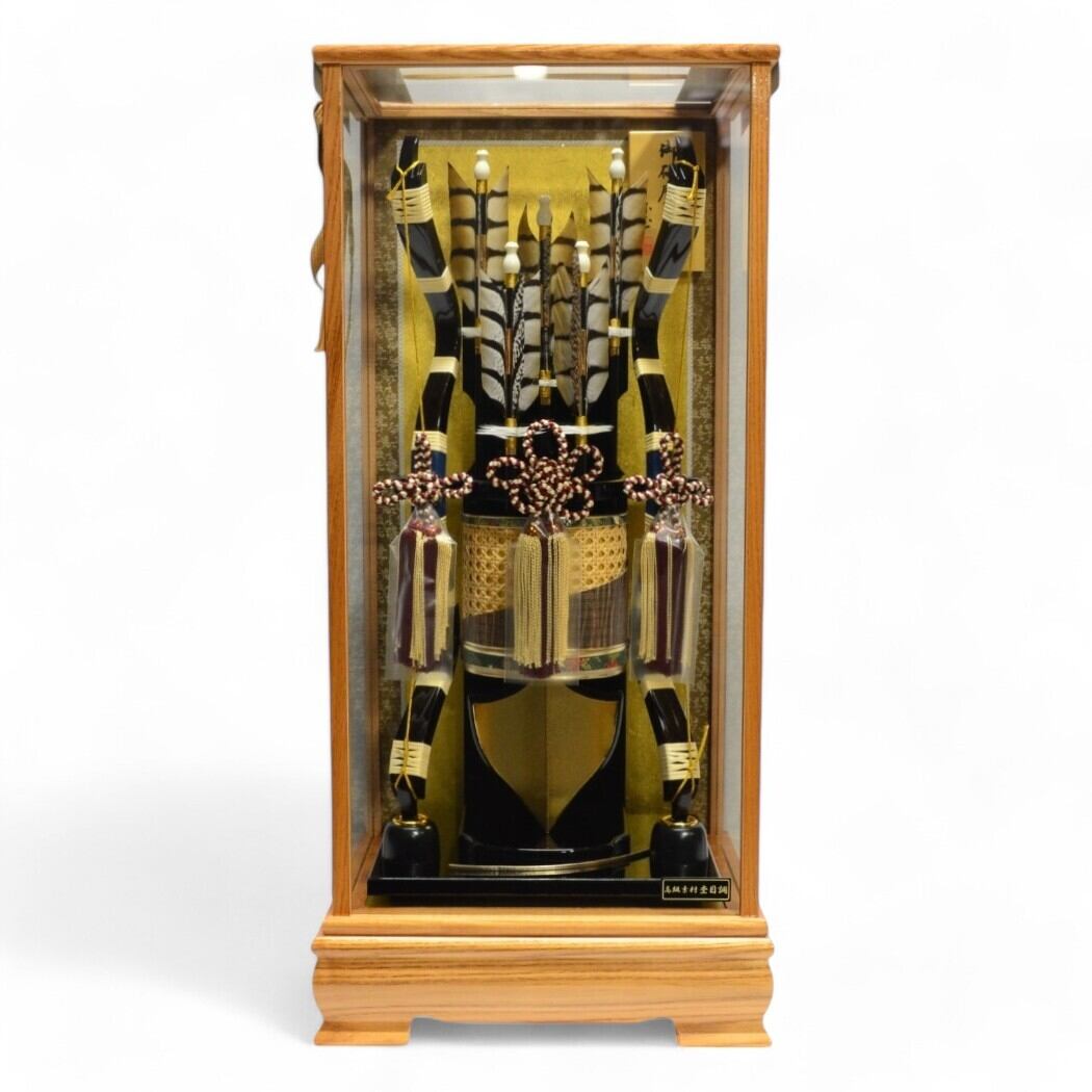 温かみのある木目調のケースと、漆黒の台座・弓がモダンで力強いコントラストを演出。金色の背景と茶・黒の組紐が、格調高い美しさを際立たせます。