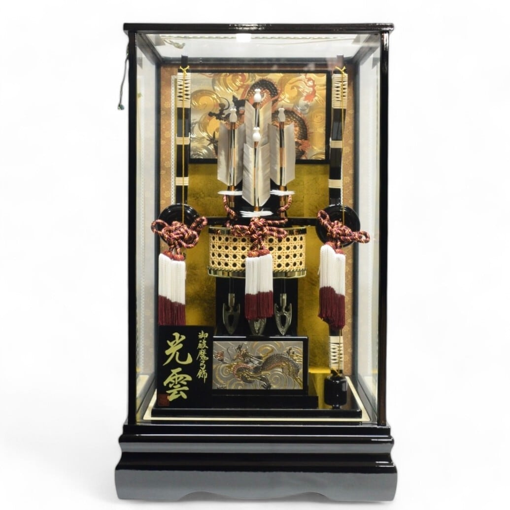 艶やかな黒塗りケースと、金色の龍の絵柄が重厚な風格を演出。矢筒の籐巻(とうまき)と赤茶の組紐が、伝統的な美しさを際立たせます。