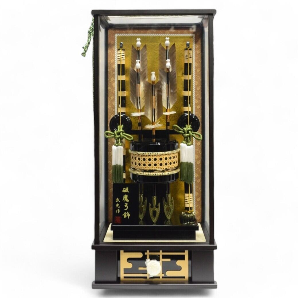 男の子の初正月を祝う、風格あるケース飾りの破魔弓です。
