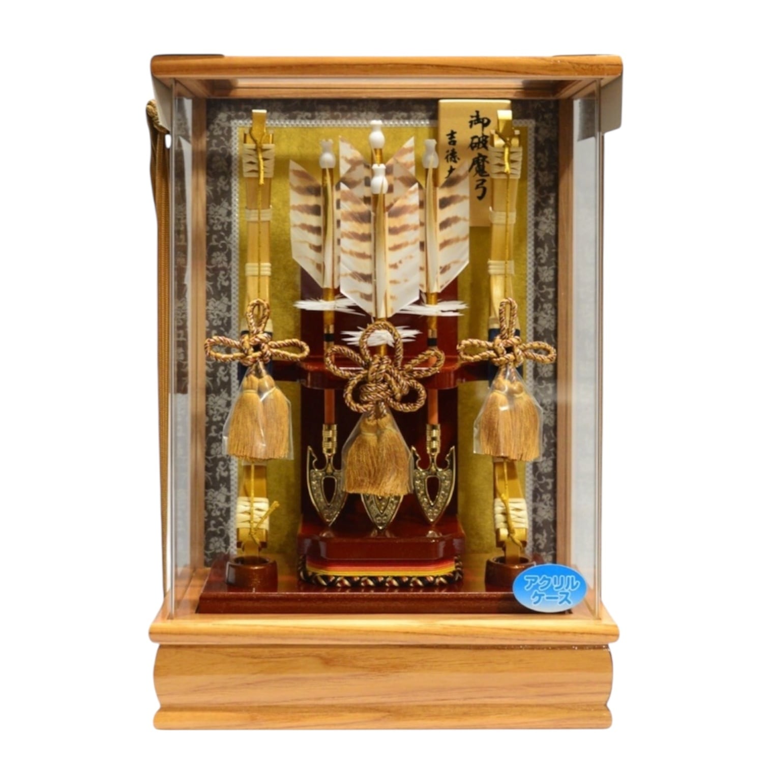 明るい天然木のケースと、台座の深い茶色の組み合わせが落ち着いた風格を演出。背景の和柄と、茶系の羽根や組紐が、伝統的な美しさを際立たせます。