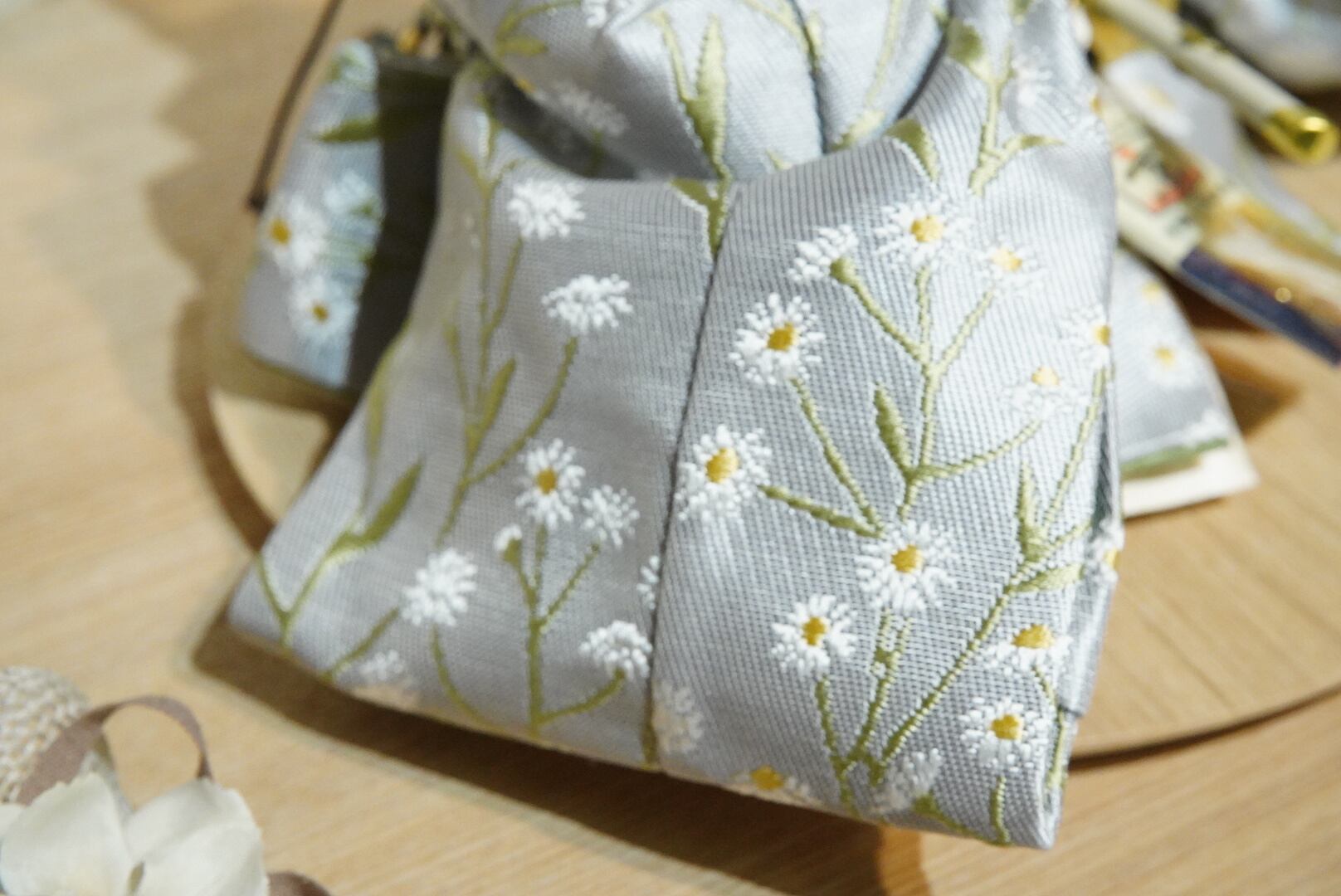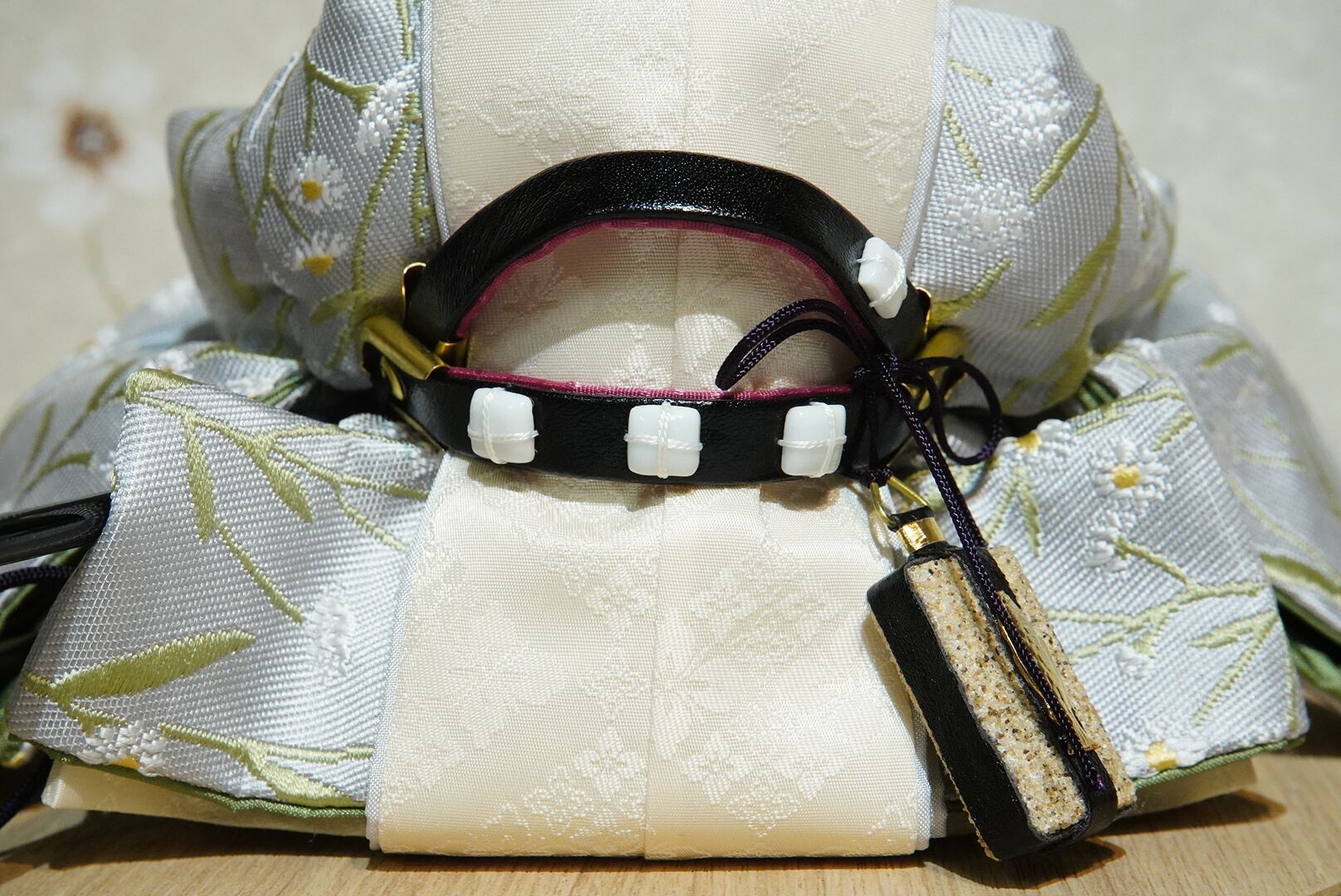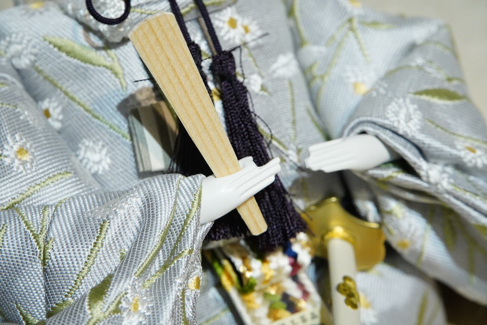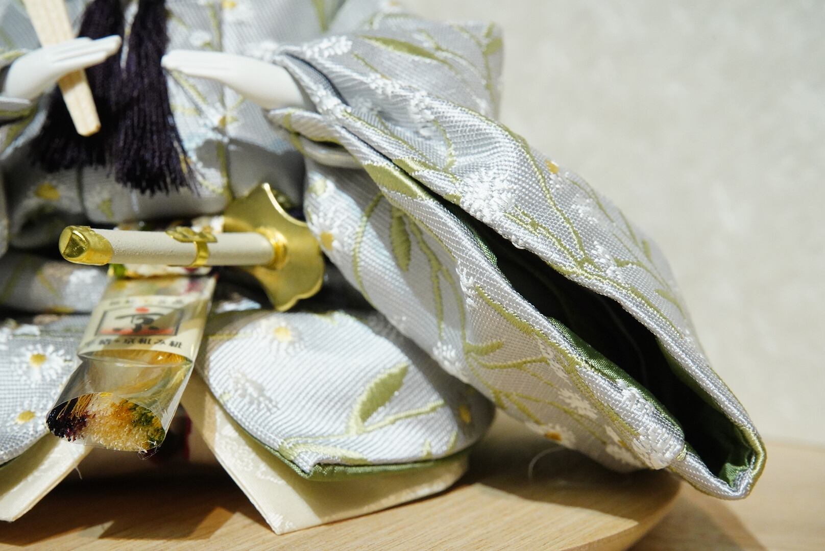 お内裏様の衣裳には上質な金糸が織り込まれた銀青色の裂地を用い、静かな輝きを放ちます。