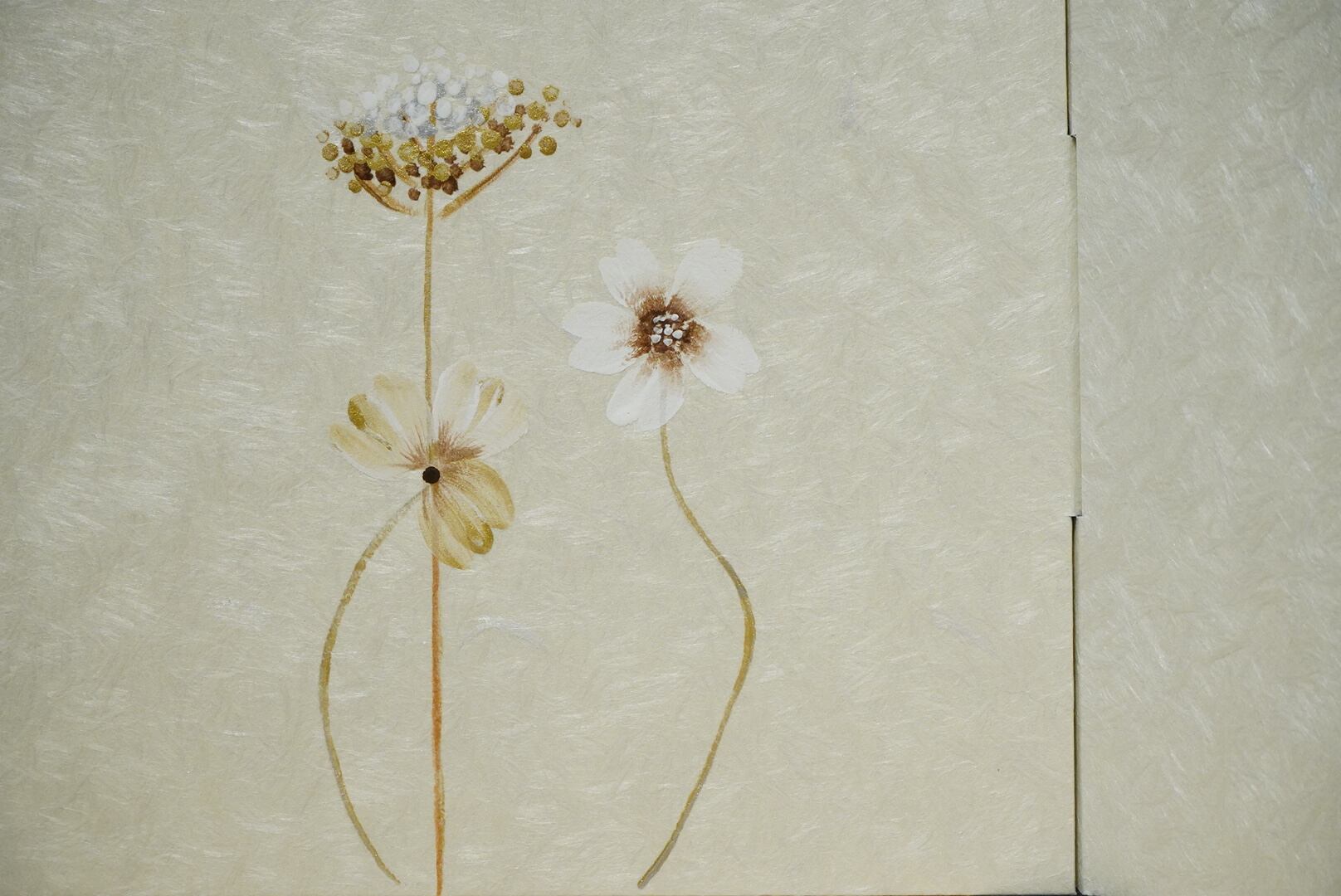 背景の屏風には繊細な花模様があしらわれ、可憐な中にも落ち着きを感じさせるデザイン。