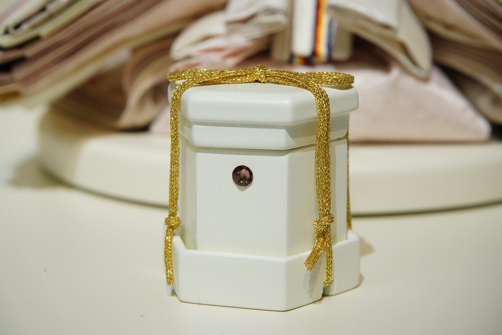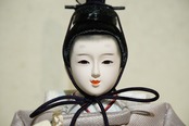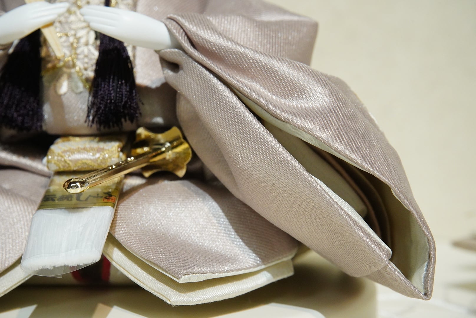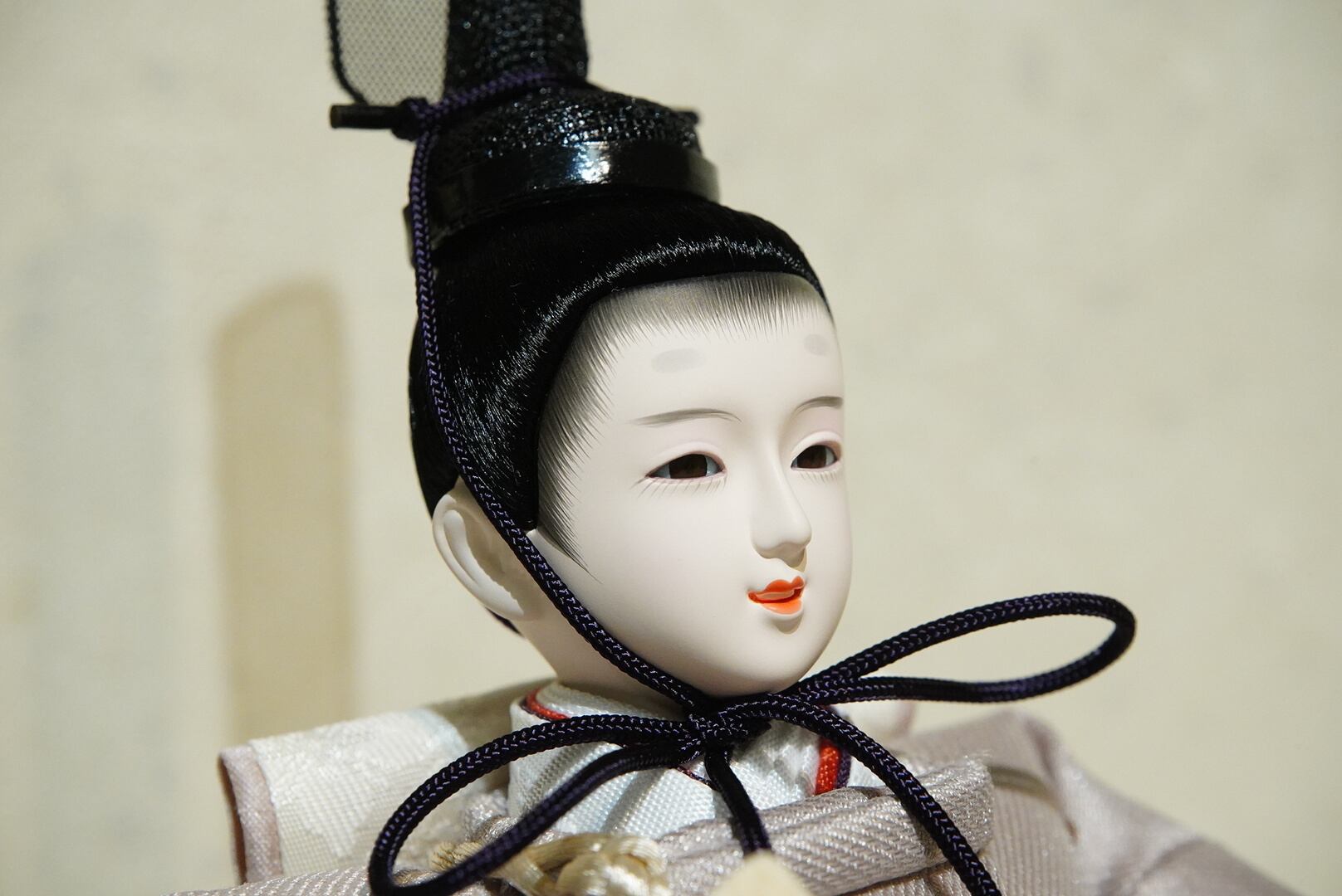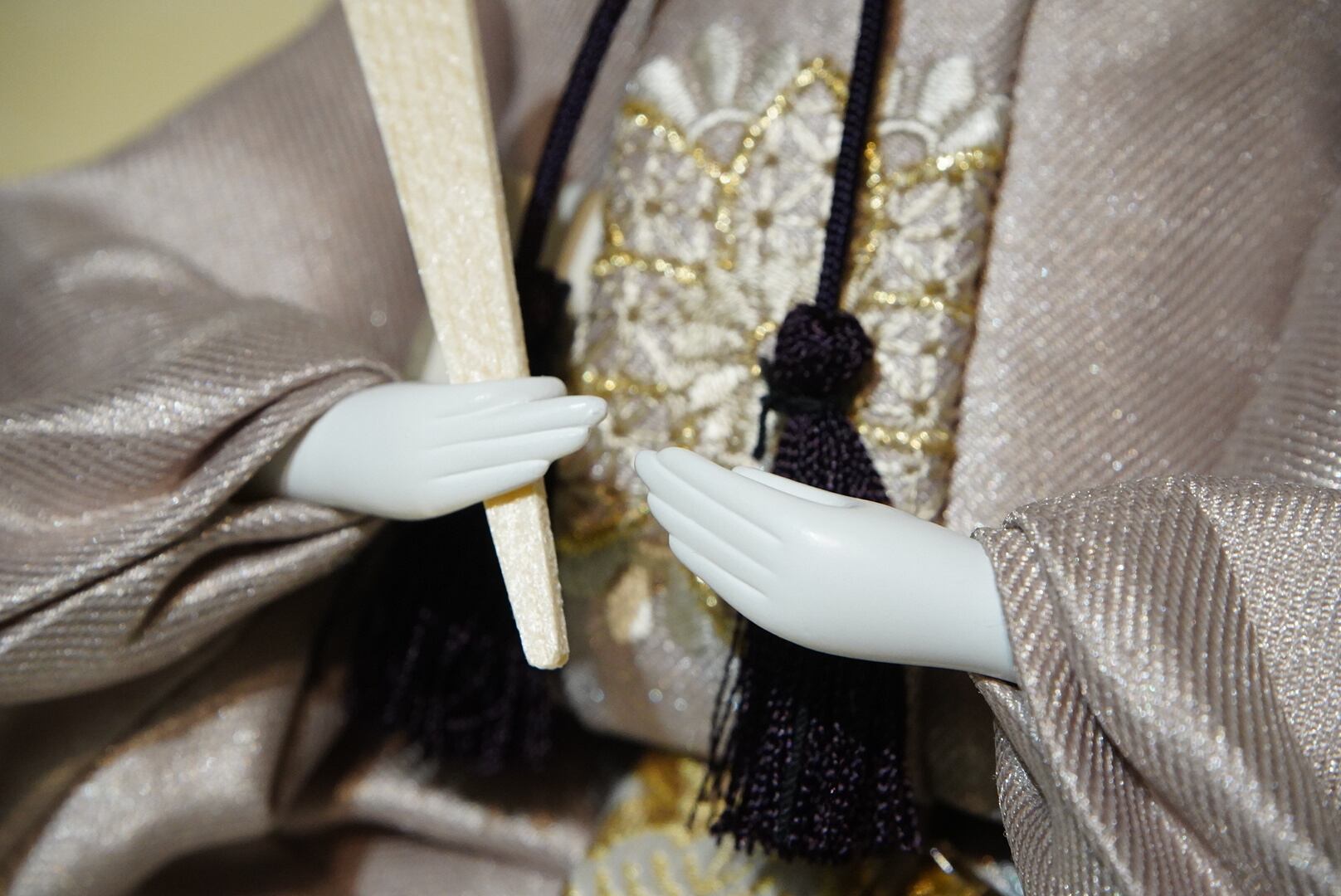 お内裏様の衣裳はやわらかな光沢を帯びた銀ねずの裂地を使用し、端正な気品をたたえます。