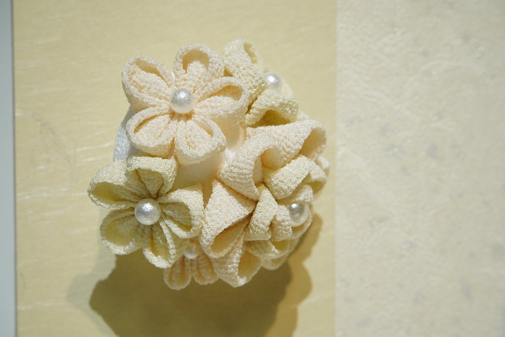 淡いクリーム色の屏風と円形の飾り台が、全体に柔らかでモダンな印象を与え、