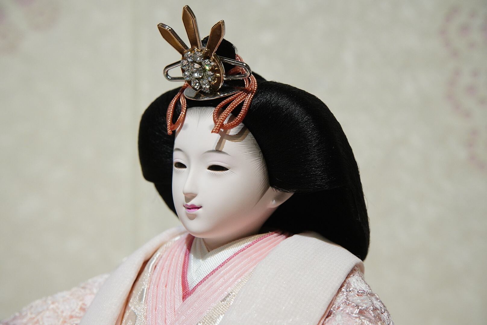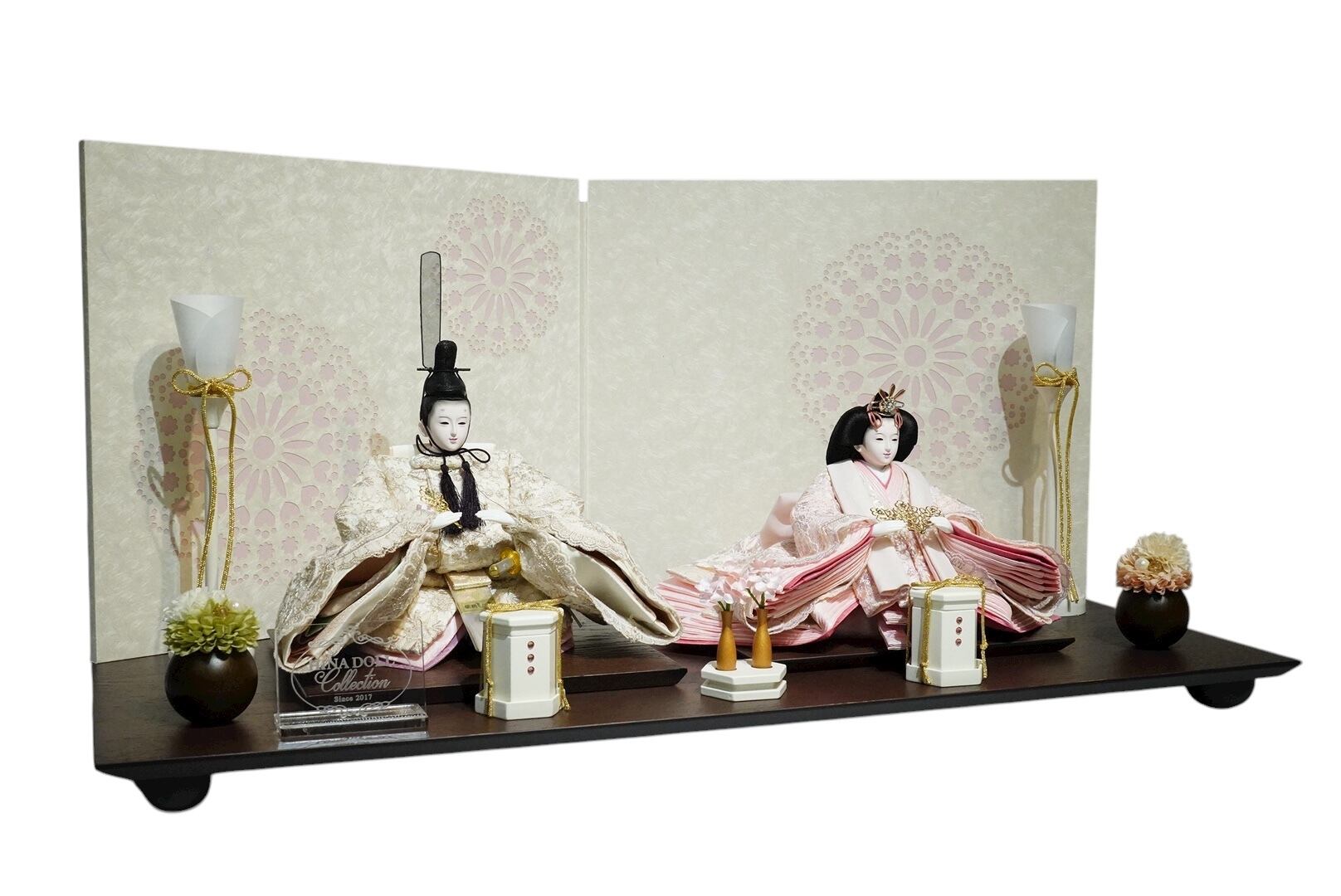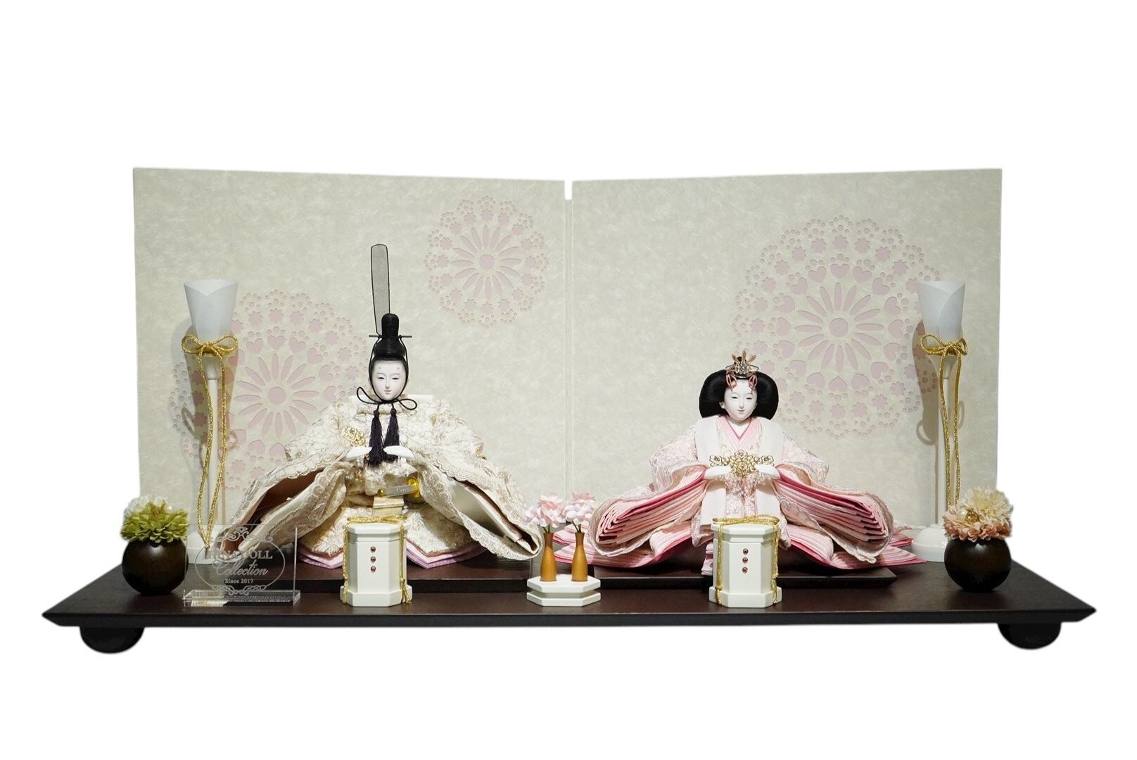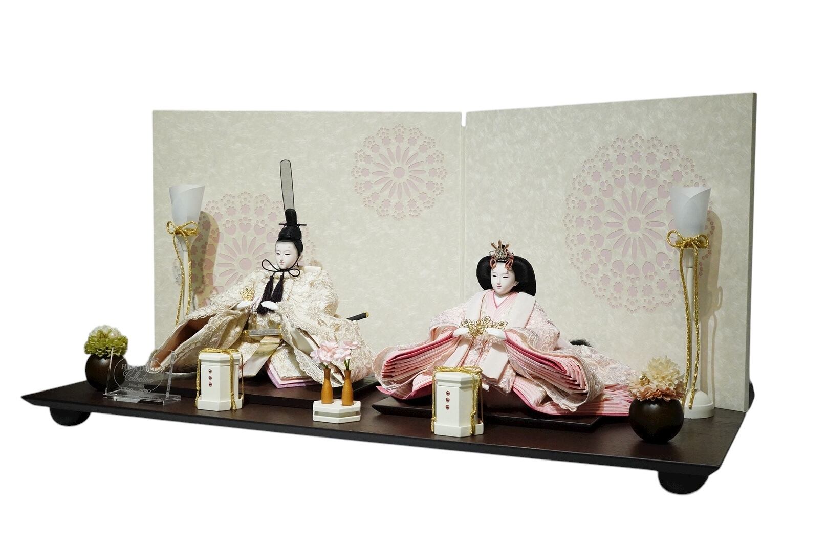 淡いピンクと生成りの色合いがやさしく調和する、上品な親王飾りです。