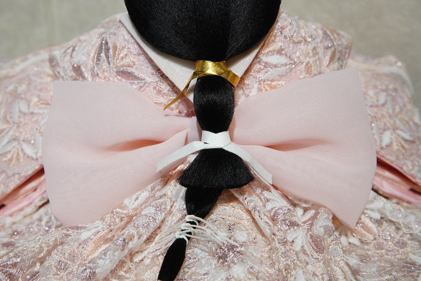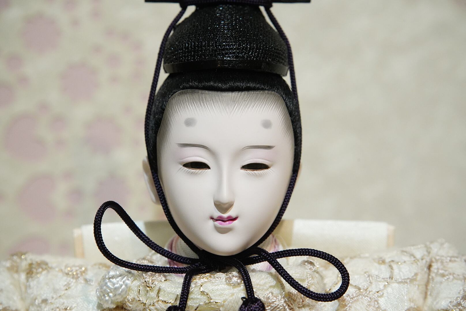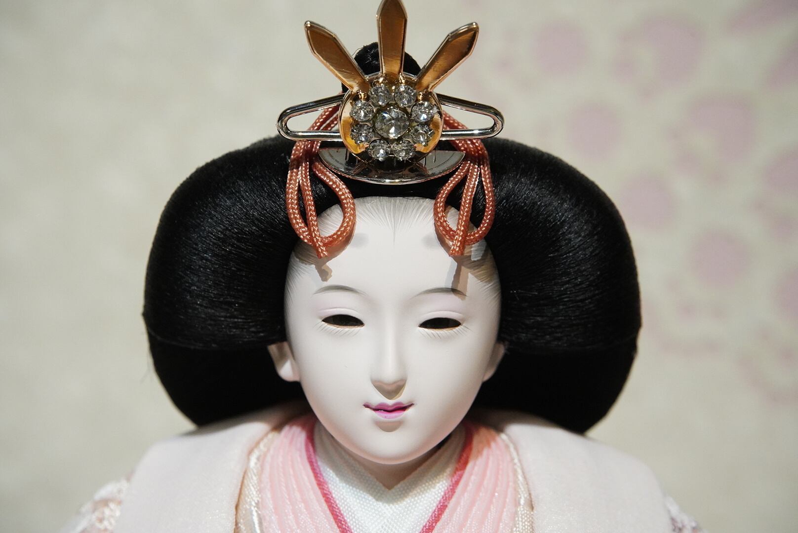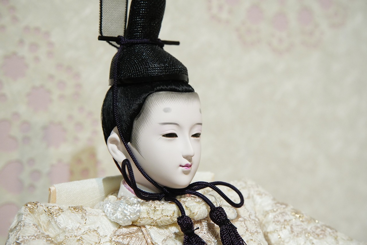 淡いピンクと生成りの色合いがやさしく調和する、上品な親王飾りです。