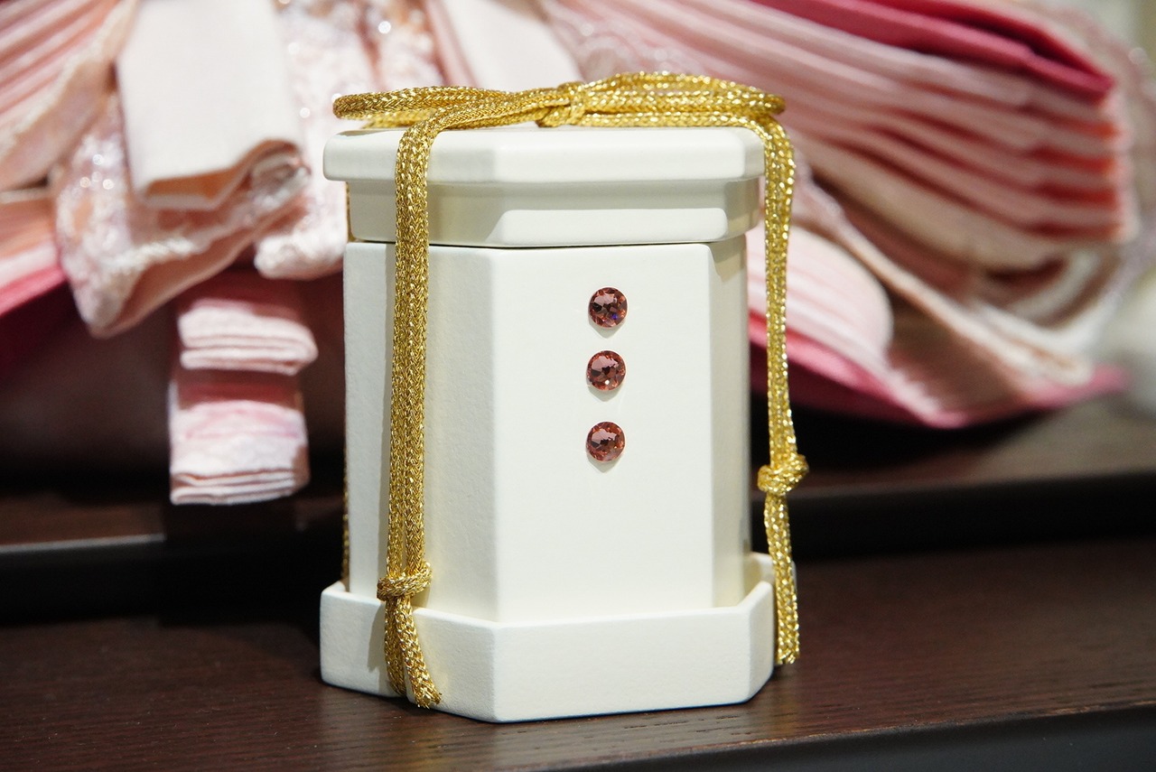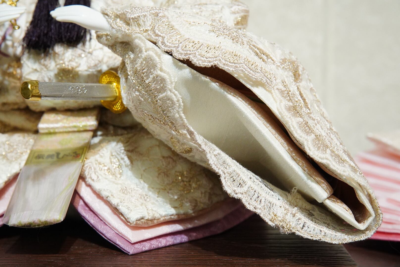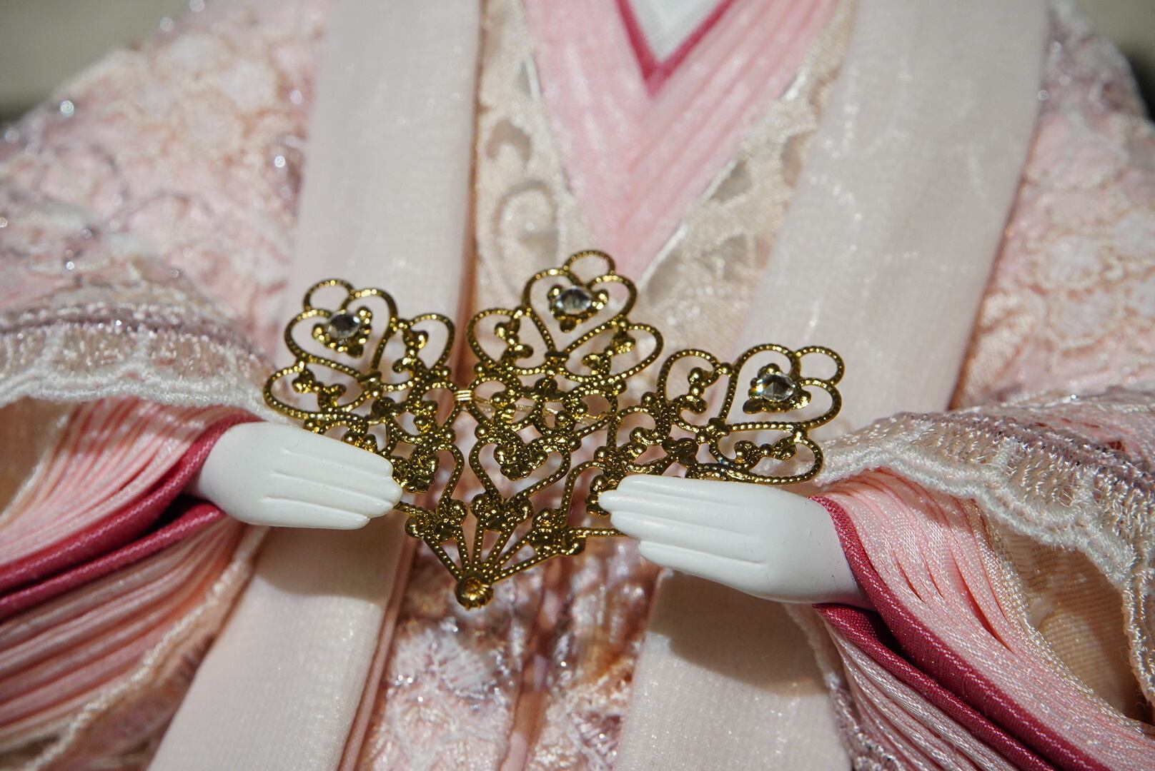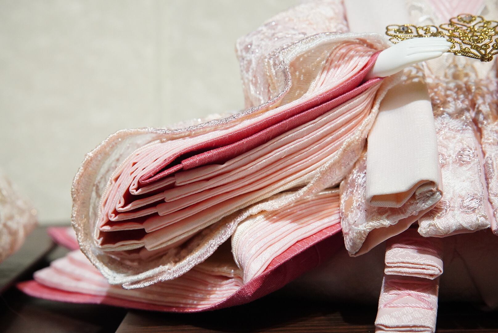 お内裏様の衣裳は気品ある白金の織りで仕立てられ、お雛様は桜色を基調にした柔らかなグラデーションが華やかに映えます。
