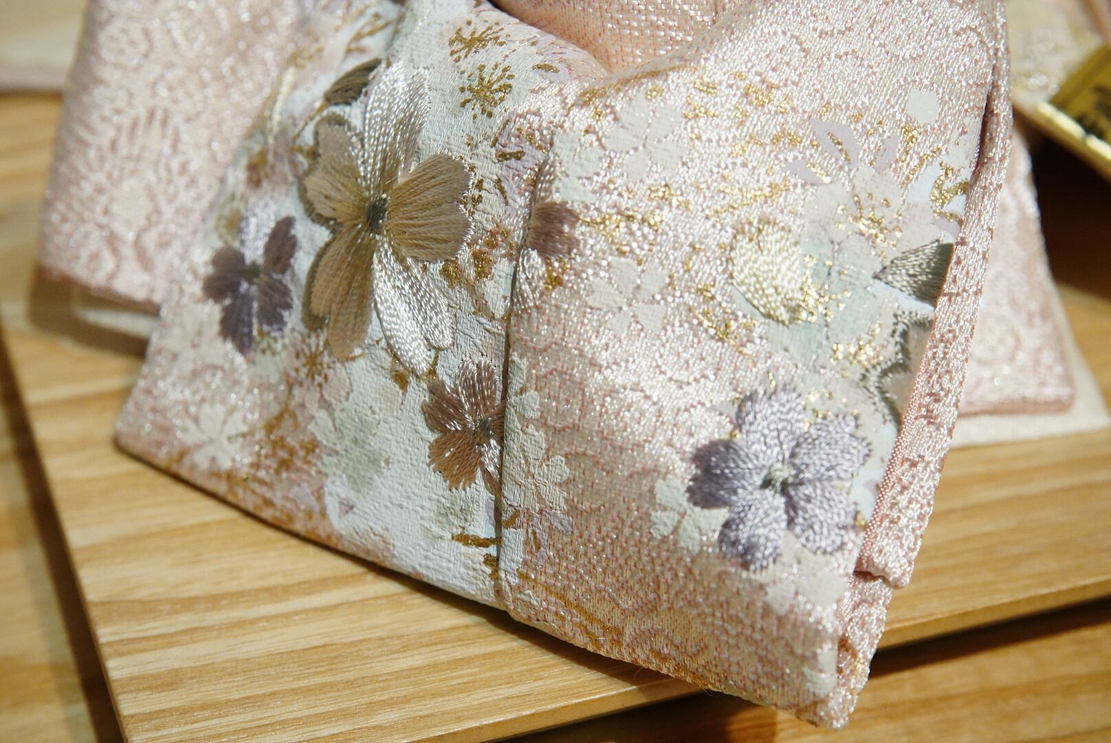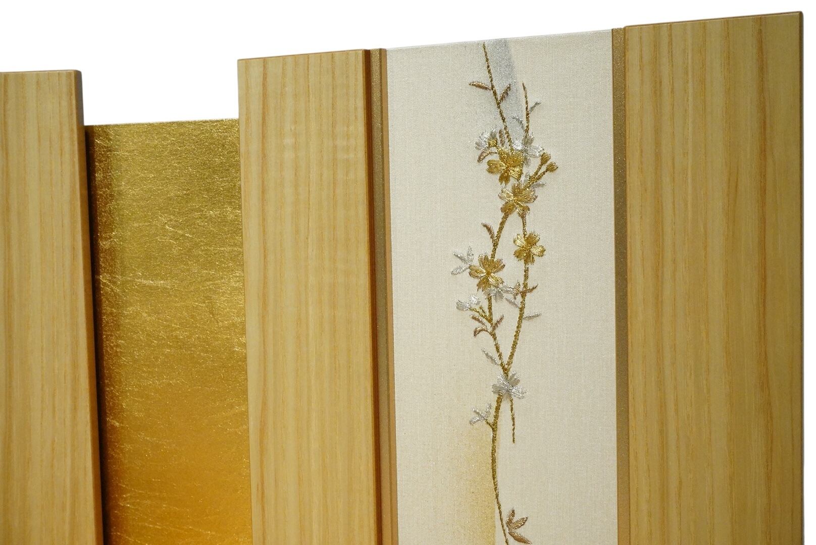 中央には金箔をあしらい、左右には金糸で刺繍された桜文様を配して、上質な和の趣を引き立てます。