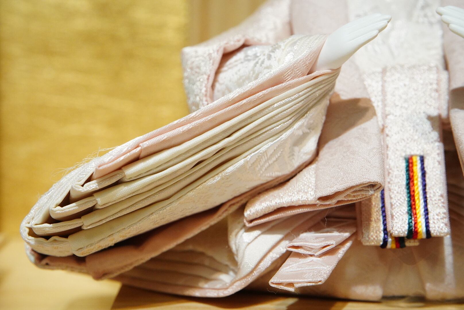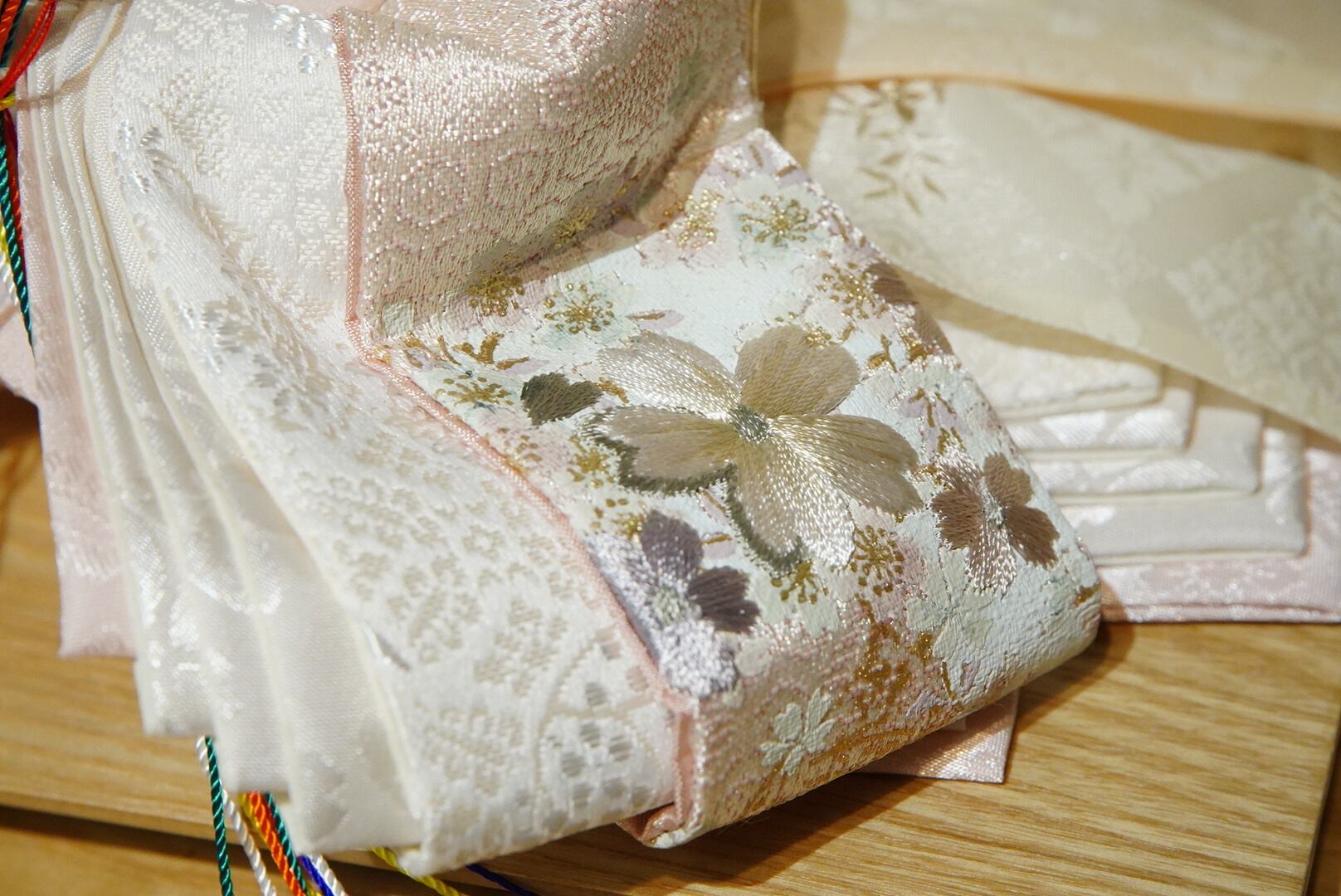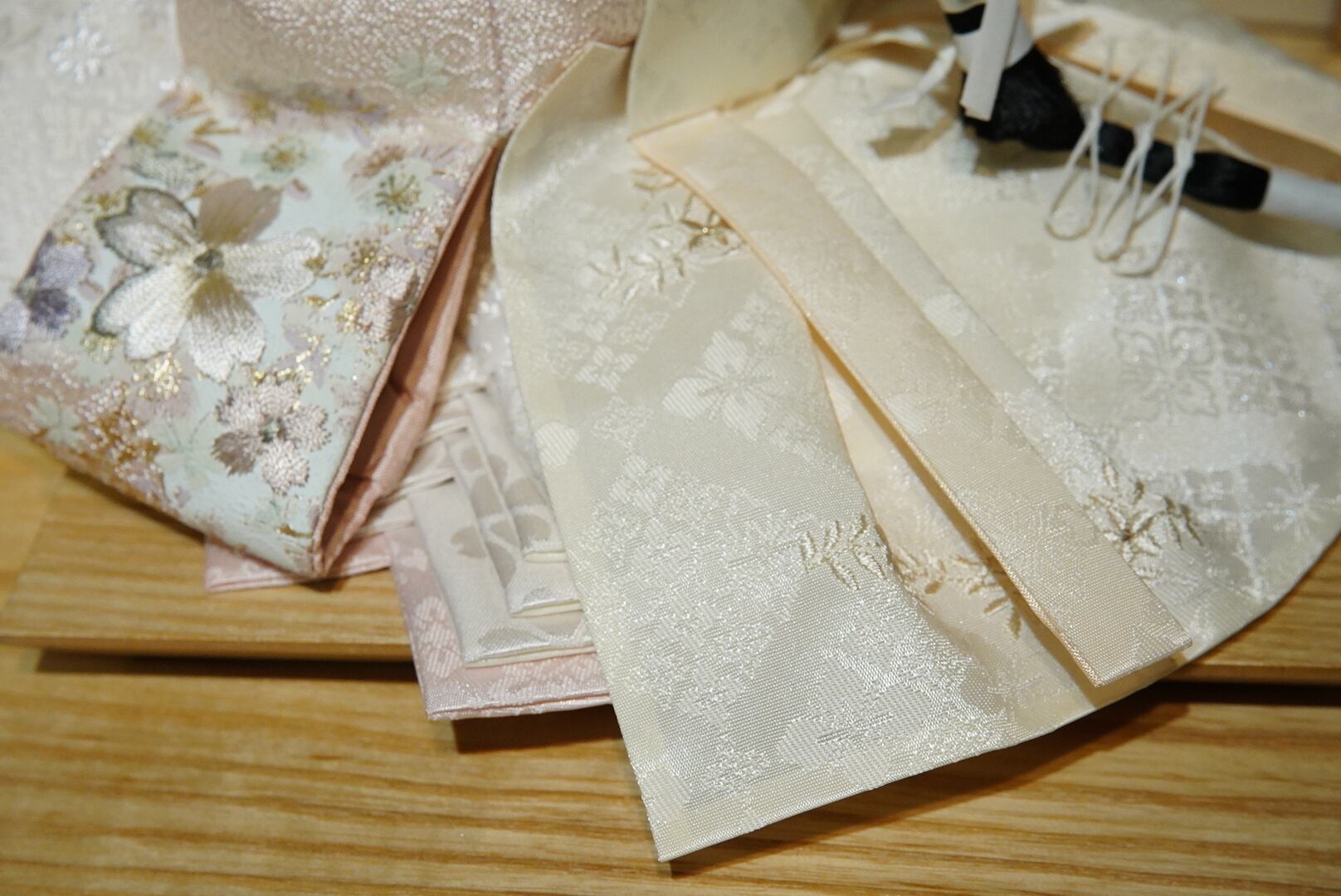 衣裳には繊細な織り模様が施され、淡いピンクとアイボリーを基調とした優美な配色が特徴。